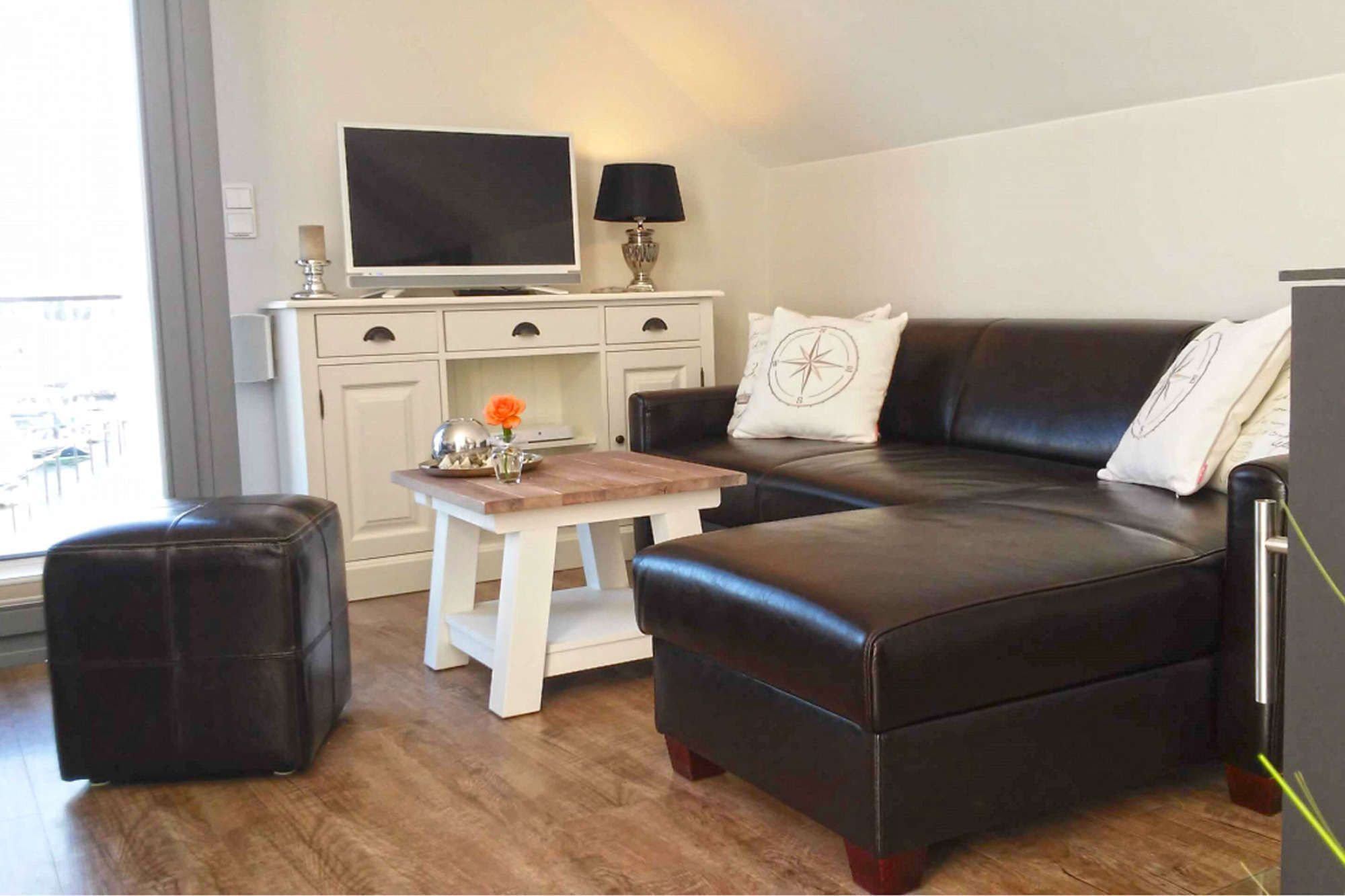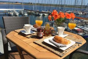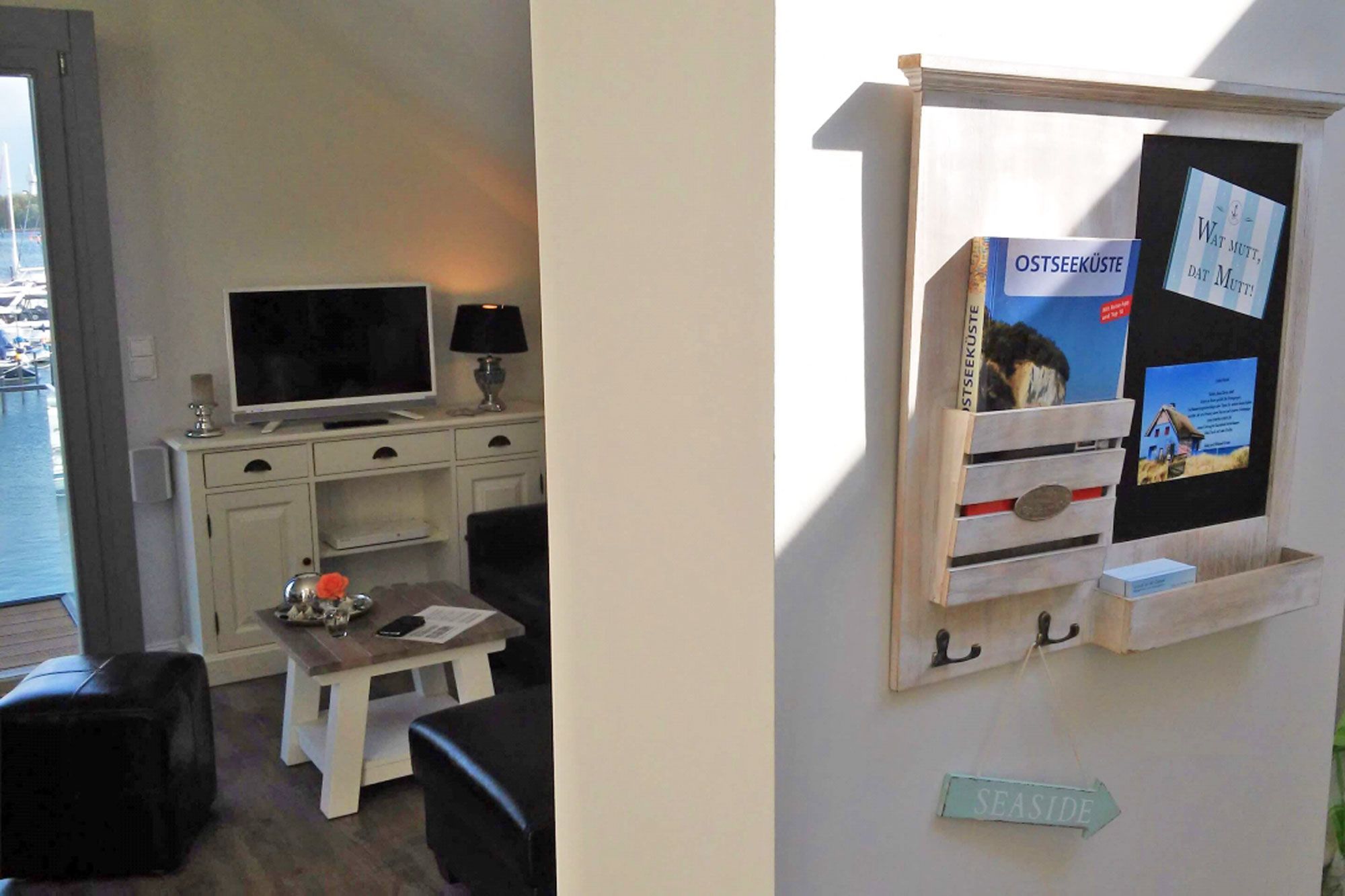 Die komfortable Ferienwohnung für 2 Erwachsene ist auf ca. 42 m² mit modernen und hochwertigen Möbeln für den gehobenen Anspruch eingerichtet. Zeitgemäße Annehmlichkeiten mit WLAN, TV, Radio, CD/Blue-Ray-Player und 2. TV im Schlafzimmer sind selbstverständlich. Die gesamte Wohnung ist mit Qualitätsboden ausgestattet. An kälteren Tagen oder bei Bedarf sorgt der Kaminofen (ohne Holzvorrat) für Behaglichkeit. So verbringen Sie hier zu jeder Jahreszeit einen erholsamen Urlaub. Genießen Sie den hellen Wohnbereich mit bodentiefen Fenstern und dem fantastischen Blick über den Jachthafen und in der Ferne die Ostsee mit der Fehmarn-Sund-Brücke. Die Leder-Couch und Beistellsessel sorgen dabei für bequemes Relaxen. Die offene, sehr gut ausgestattete Küche ist bei Bedarf mit den notwendigen Extras versehen, um den gehobenen Ansprüchen zu entsprechen. Damit steht der kulinarischen Abrundung Ihres Aufenthaltes nichts im Wege. Vom Essbereich oder dem kleinen möblierten Balkon mit Sonnenschirm lassen Sie dann Ihren Blick beim Essen in die Ferne schweifen. Hier erleben Sie wirklichen Yachthafenblick und genießen die Ostsee, eine gute Tasse Kaffee oder ein kühles Glas Wein. Für die nächtliche Ruhe steht Ihnen ein Schlafzimmer mit Doppelbett mit Einzelmatratzen zur Verfügung. Hotel-Bettwäsche und Handtücher sind Allergiker geeignet und gg. Gebühr möglich. Das Badezimmer bietet ebenfalls mit Handtuchwärmer und Regen-Dusche weitere Entspannung nach einem ereignisreichen Tag. Fahrräder sind gegen Gebühr beim örtlichen Verleih am Beach Motel möglich. Die Ferienwohnung erreichen Sie bequem von Ihrem Pkw-Stellplatz. Zugang zur Wohnung über Treppe. Die Wohnung ist ein Nichtraucher-Objekt! Haustiere sind nicht erlaubt! Ofen Holz gehört nicht zum Angebot!