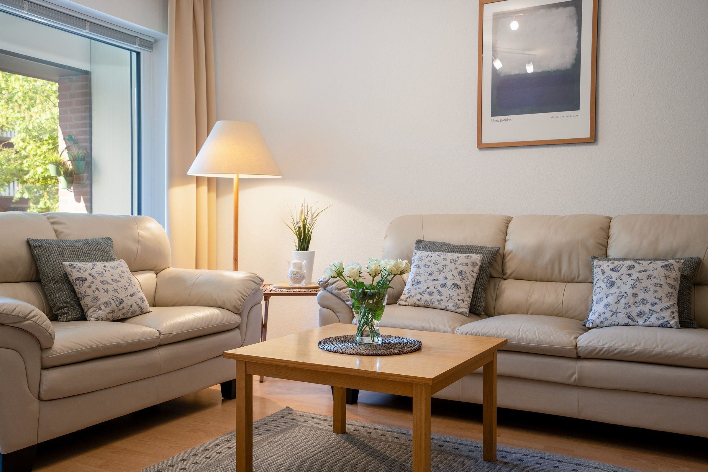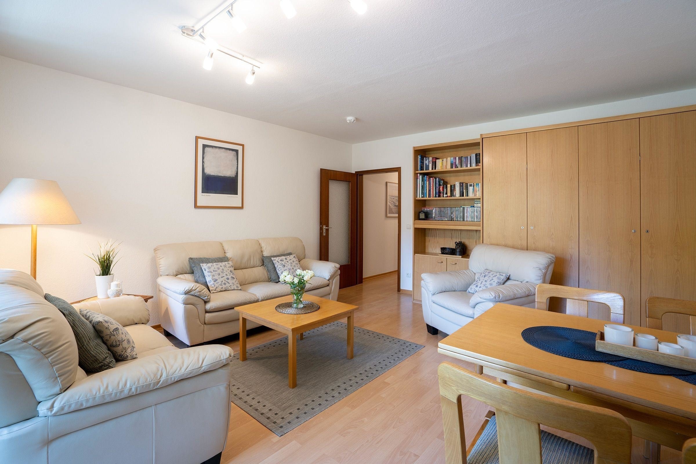 Das ca. 63 m² große 2-Zimmer-Komfort-Apartment im 1. OG bietet einen großzügigen und hellen Wohnraum mit einer eleganten Ledergarnitur, Couchtisch, 48“ LCD-Fernseher und Musikanlage. Die separate Einbauküche ist mit einem Essplatz, Ceranfeld, Spülmaschine, Mikrowelle sowie Filter- und Tassimo-Kaffeemaschine voll ausgestattet für bis zu 2 Personen. Das geräumige Schlafzimmer verfügt über ein Doppelbett (2x90x200cm), Kleiderschrank und einen 32“ Flachbild-TV. Ein Vollbad mit Infrarot-Wärme-Kabine und ein separates WC runden die Ausstattung ab. WLAN ist kostenfrei nutzbar. Ein Abstellraum ist ebenfalls vorhanden. Für Fahrräder steht ein Keller zur Verfügung. Die Nutzung des PKW-Stellplatzes ist inklusive. Haustiere und das Rauchen sind nicht gestattet. Die Schlüsselübergabe erfolgt im Büro in Scharbeutz.