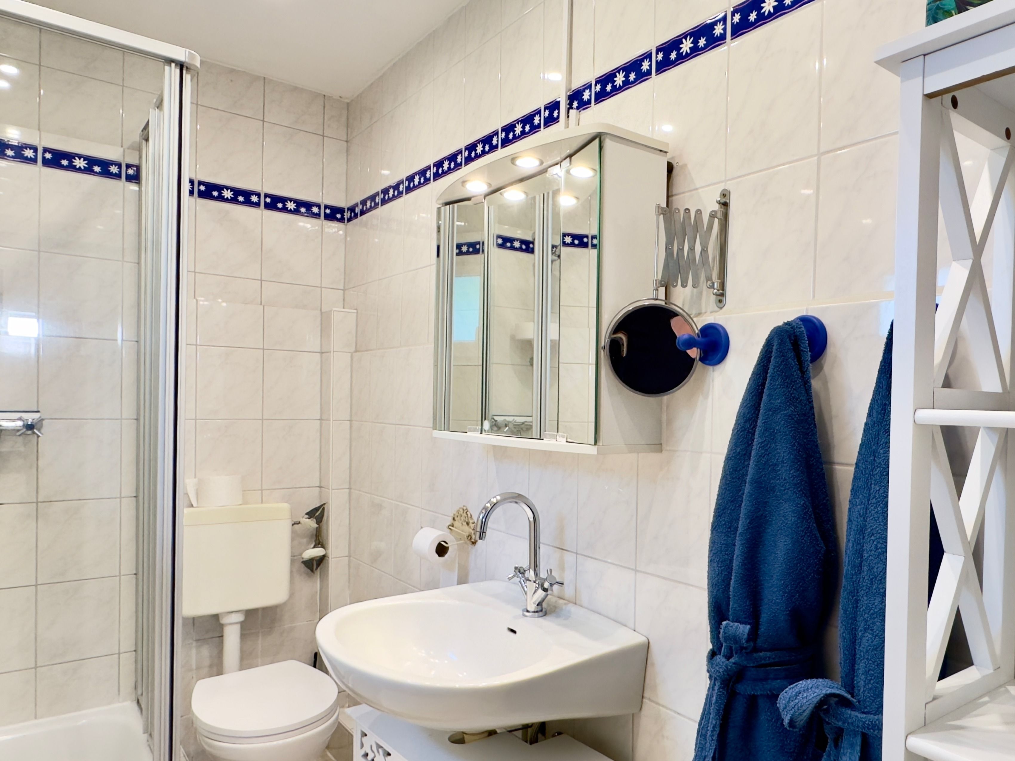 Diese FeWo besteht aus einem kleinen Flur, einem Wohn- Essbereich mit Küchenzeile, Schlafsofa und Kaminofen, einem Schlafzimmer mit Ehebett, einem Bad mit WC und Dusche.