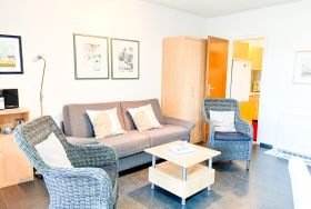 Die Ferienwohnung liegt im Erdgeschoss der Appartementanlage und verfügt über ein Wohnzimmer mit Schlafcouch für 1 Person, Kabel-TV, Radio, Essecke u. Kochnische (2-Plattenherd, Wasserkocher, Kaffeemaschine, Toaster), ein Schlafzimmer mit zwei Einzelbetten, ein Badezimmer mit Dusche/ WC sowie einen Balkon mit Gartenmöbeln. Haustiere werden sind nicht gestattet.