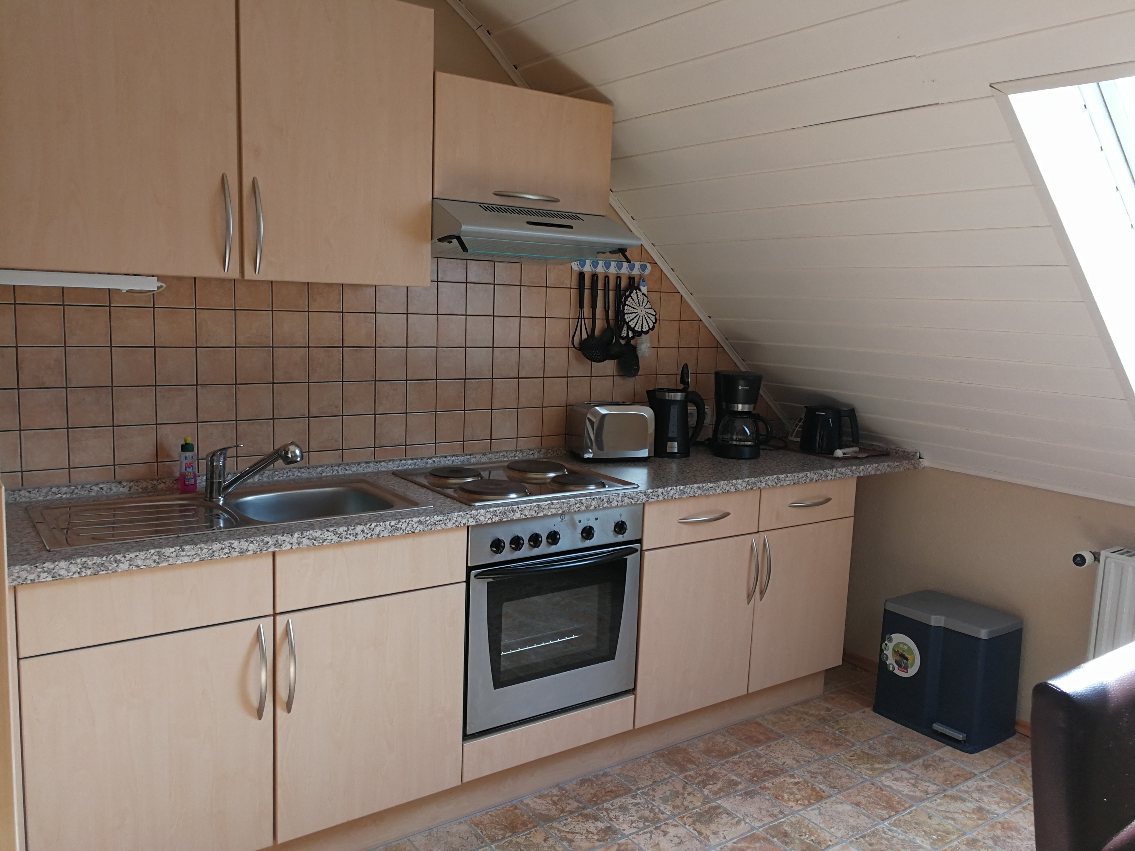 Die gut ausgestattete Küche besitzt unter anderem einen Kühlschrank, einen Herd zum Kochen und sogar eine Spülmaschine.