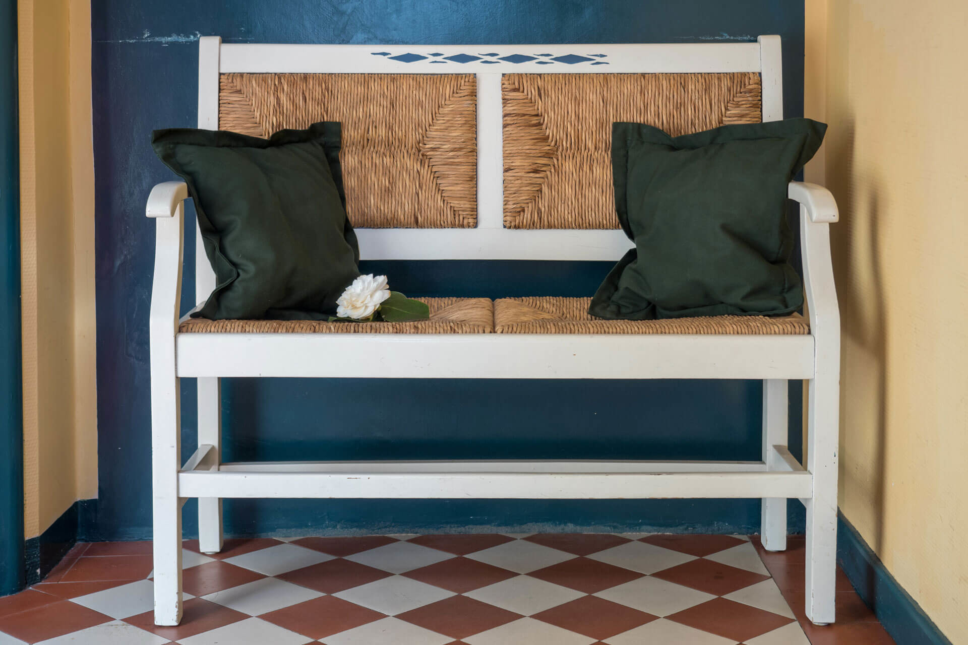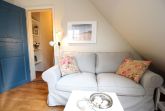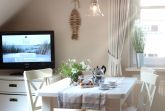 Die Wohnung verfügt über ein separates Schlafzimmer mit charmantem Doppelbett, ein helles Wohn-/Esszimmer mit funktionaler Küchenzeile, gemütlicher Sitzecke und schönem Essplatz sowie ein Badezimmer mit Dusche. Die stilvolle Einrichtung im dezent-maritimem Spiekerooger Strand-Stil harmoniert wunderbar mit dem historischen Ambiente des Hauses.