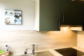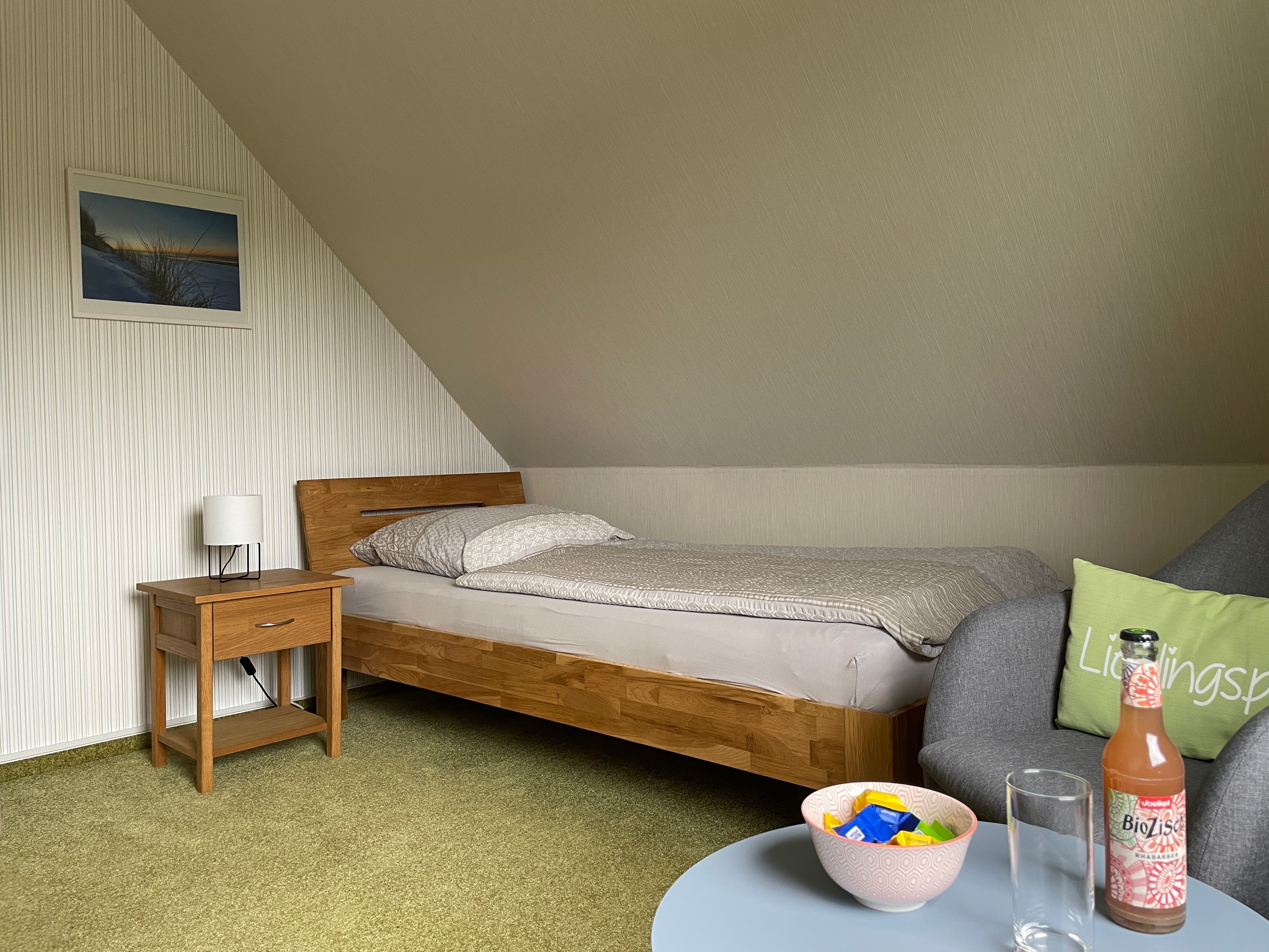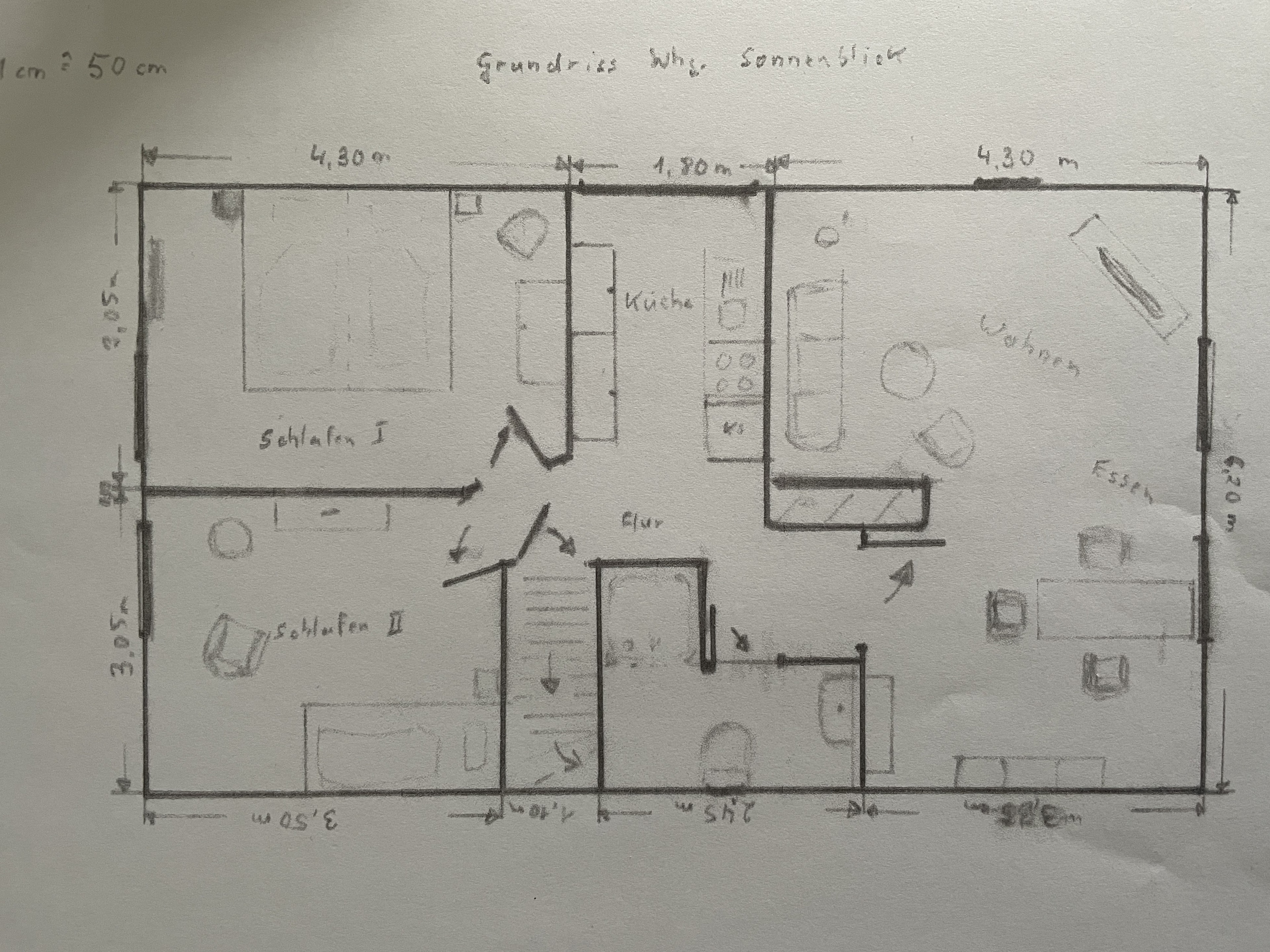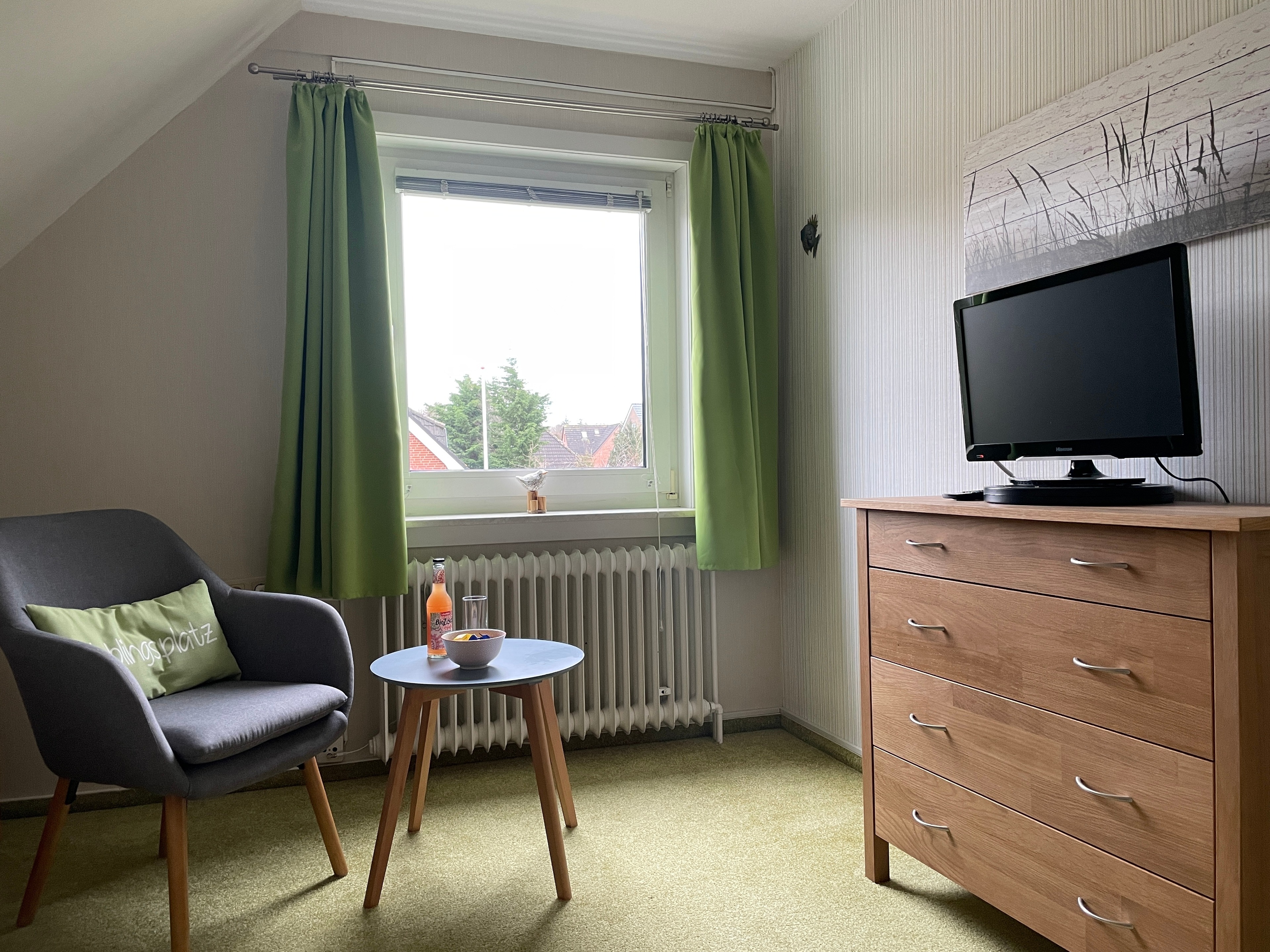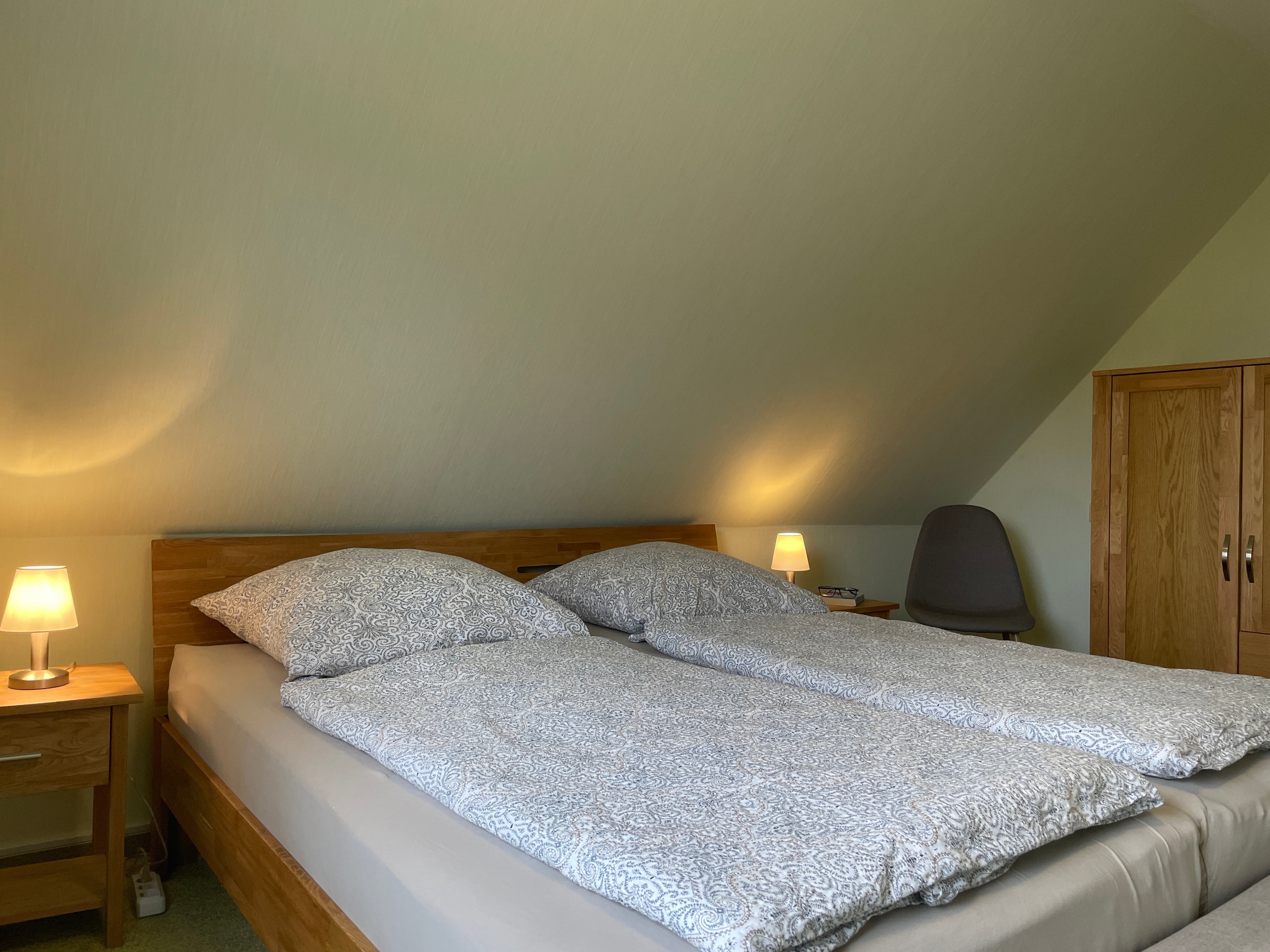 Unser Sonnenblick verfügt über ein geräumiges Wohnzimmer mit WLAN, bequemer Fernsehecke, einem gemütlichem Lesesessel sowie einer kleinen Auswahl an Büchern. Hier integriert finden Sie auch einen Essplatz für drei Personen. Die Küchenzeile mit Kühlschrank, Geschirrspüler, Ceranfeld und Backofen ist funktional hergerichtet und für Ihren Urlaub gut ausgestattet. Das Bad mit Fenster ist hell und die Dusche verfügt über einen niedrigen Einstieg. Das Schlafzimmer mit Doppelbett (180 x 200 cm) und Verdunklungsmöglichkeit lädt zu geruhsamen Nächten ein. Ein weiteres Schlafzimmer verfügt über ein Einzelbett (90 x 200 cm).