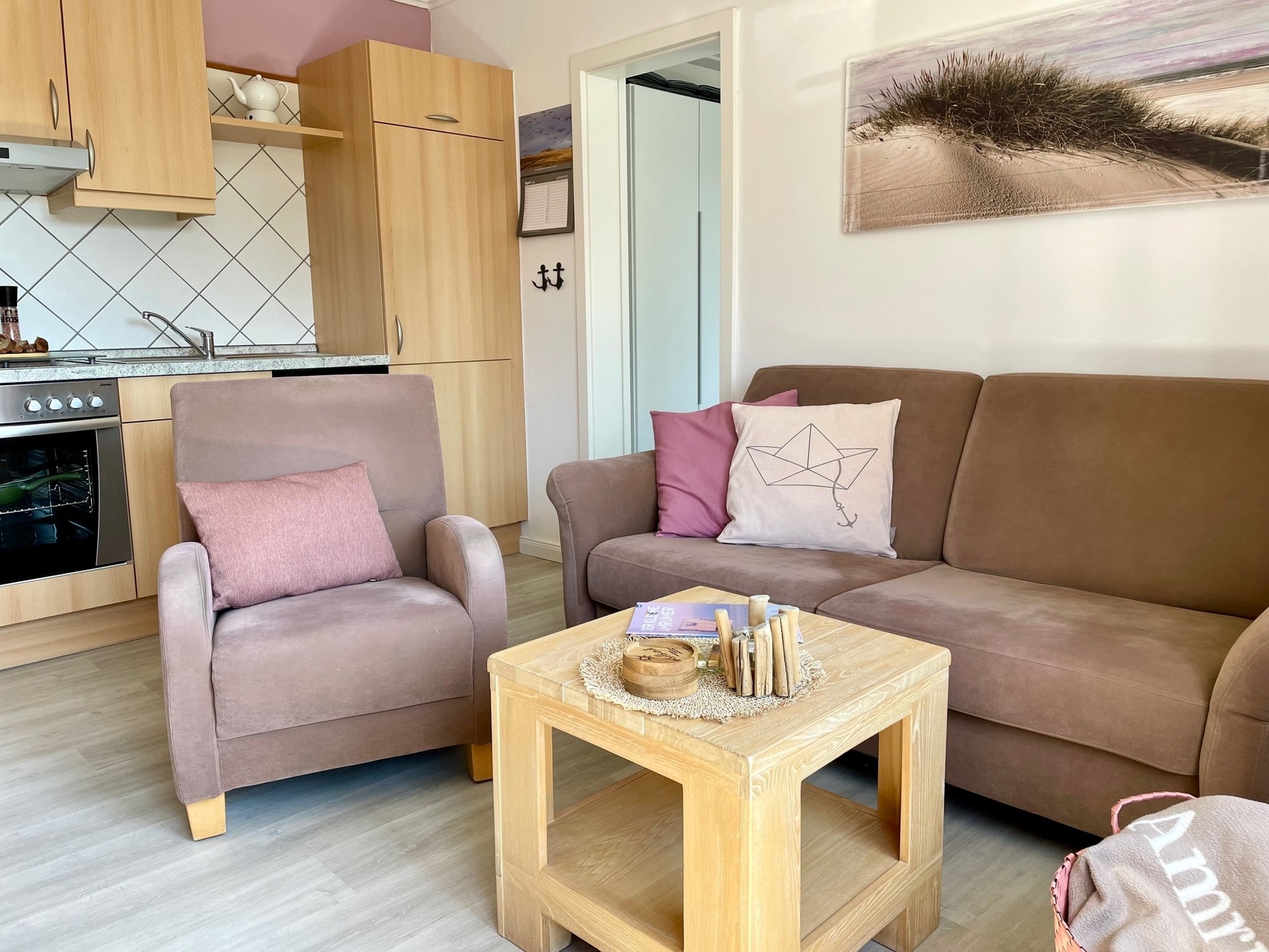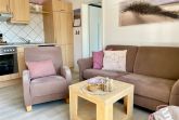 In der Wohnküche, mit nettem Essbereich und gemütlicher Sofaecke, befindet sich ein Flachbild-TV und ein CD-Player mit Radio. Im Duschbad sind Handtücher und Fön vorhanden, der Duschbereich ist ebenerdig und mit Fußbodenheizung ausgestattet.