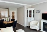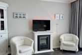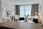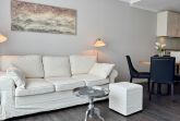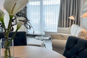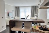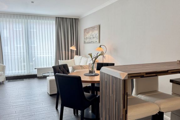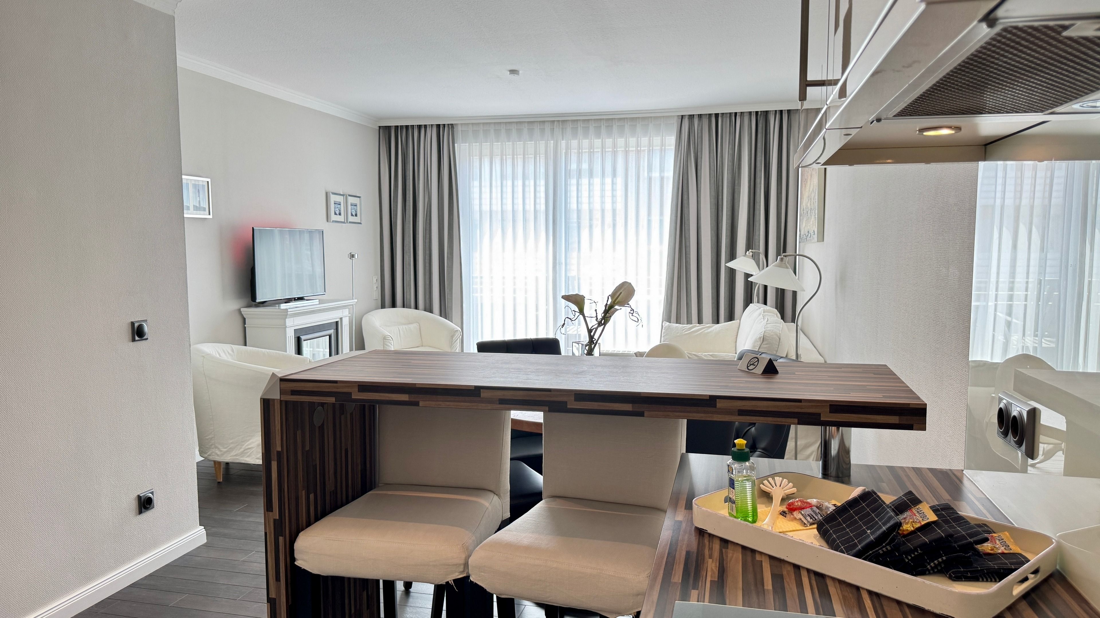 Das Appartement für maximal zwei Personen verfügt über ein großzügiges Wohnzimmer mit Essecke. Die offene Wohnküche ist durch einen verschiebbaren Frühstückstresen optisch abgeteilt. Neben einem modernen Touch-Control-Induktions-Kochfeld und einem kompakten Kombibackofen gehört ein superleiser Geschirrspüler zu ihrer Grundausstattung. Sowohl im Wohnzimmer, in dem ein Elektrokamin in der stürmischen Jahreszeit für Wohlbehagen sorgt, als auch im Schlafzimmer befindet sich jeweils ein LCD-Fernseher. Internet ist via WLAN (ohne Gewähr) vorhanden. Das Doppelbett entspricht ebenso der gängigen Comforthöhe wie die Toilette im Bad. Die großzügige Vollglasdusche ist dort der optische Blickfang, das Touch-Control-Wandradio einer der vielfältigen technischen Raffinessen im Appartement. Probieren Sie es aus - Sie werden sich verlieben.
