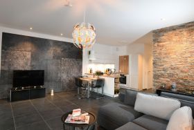 moderne, voll ausgestattetete Küche integriert. Die gesamte Wohnung ist barrierefrei. Im Kühlschrank erwartet Sie ein kleiner Gruß.