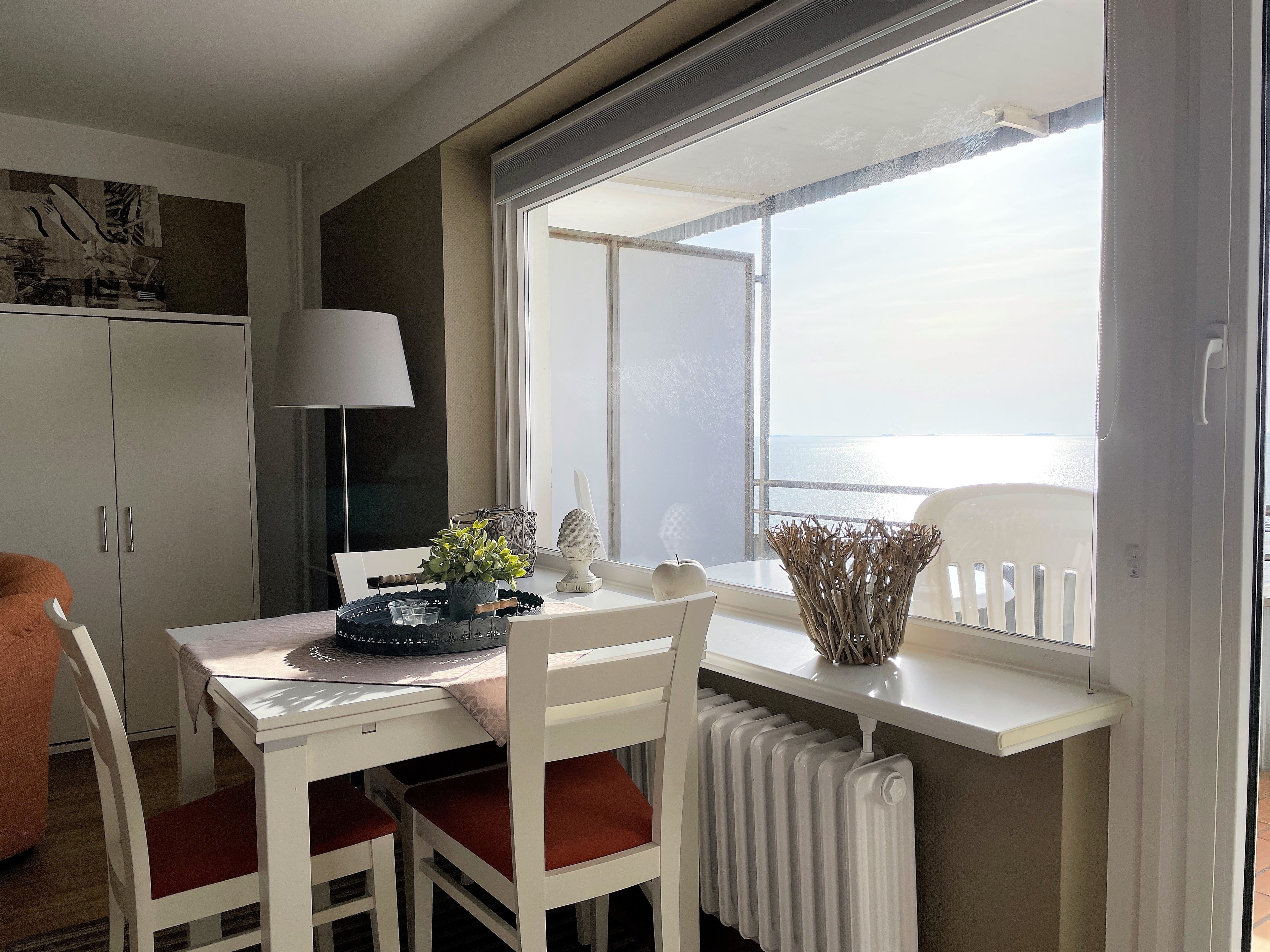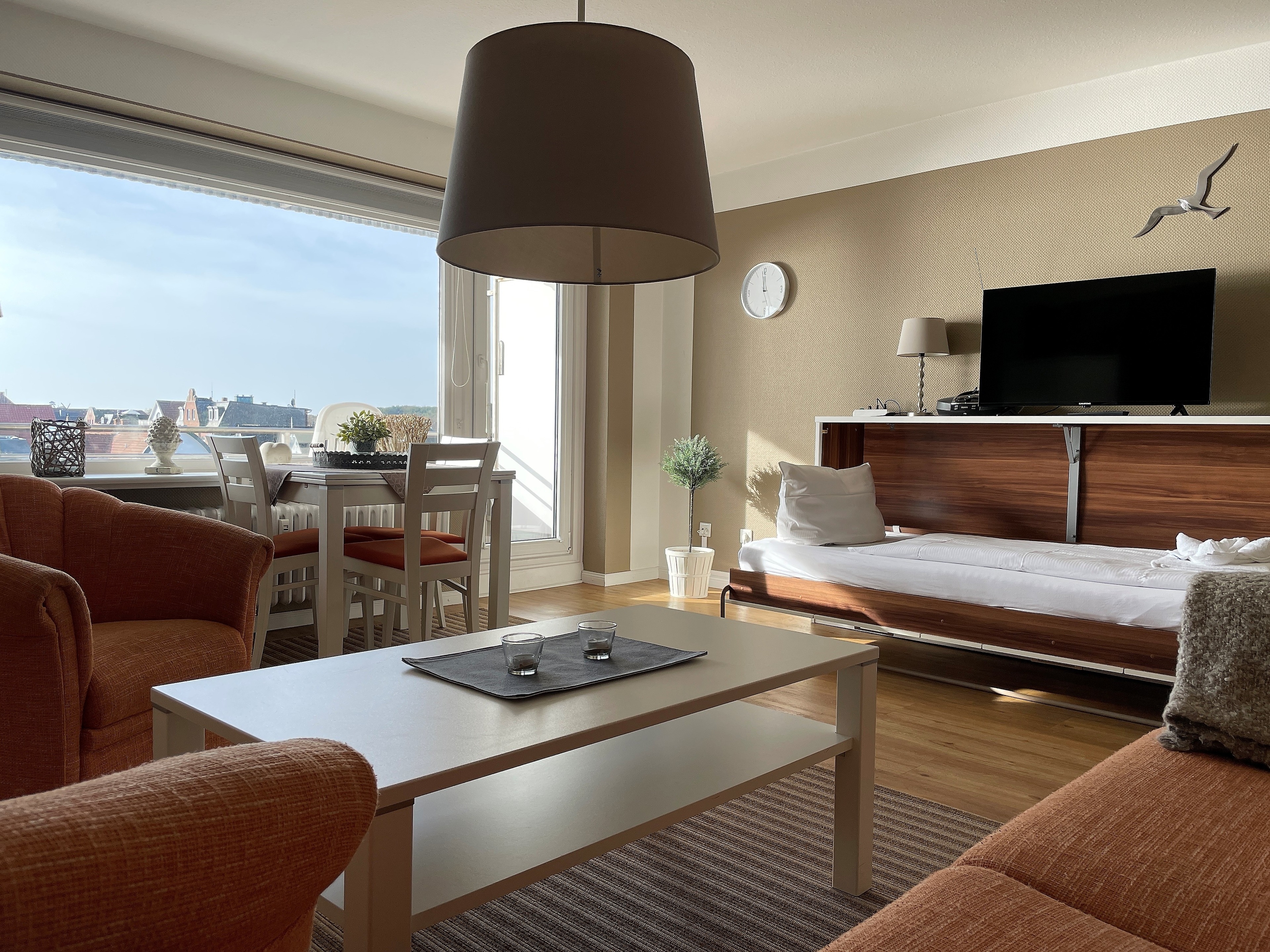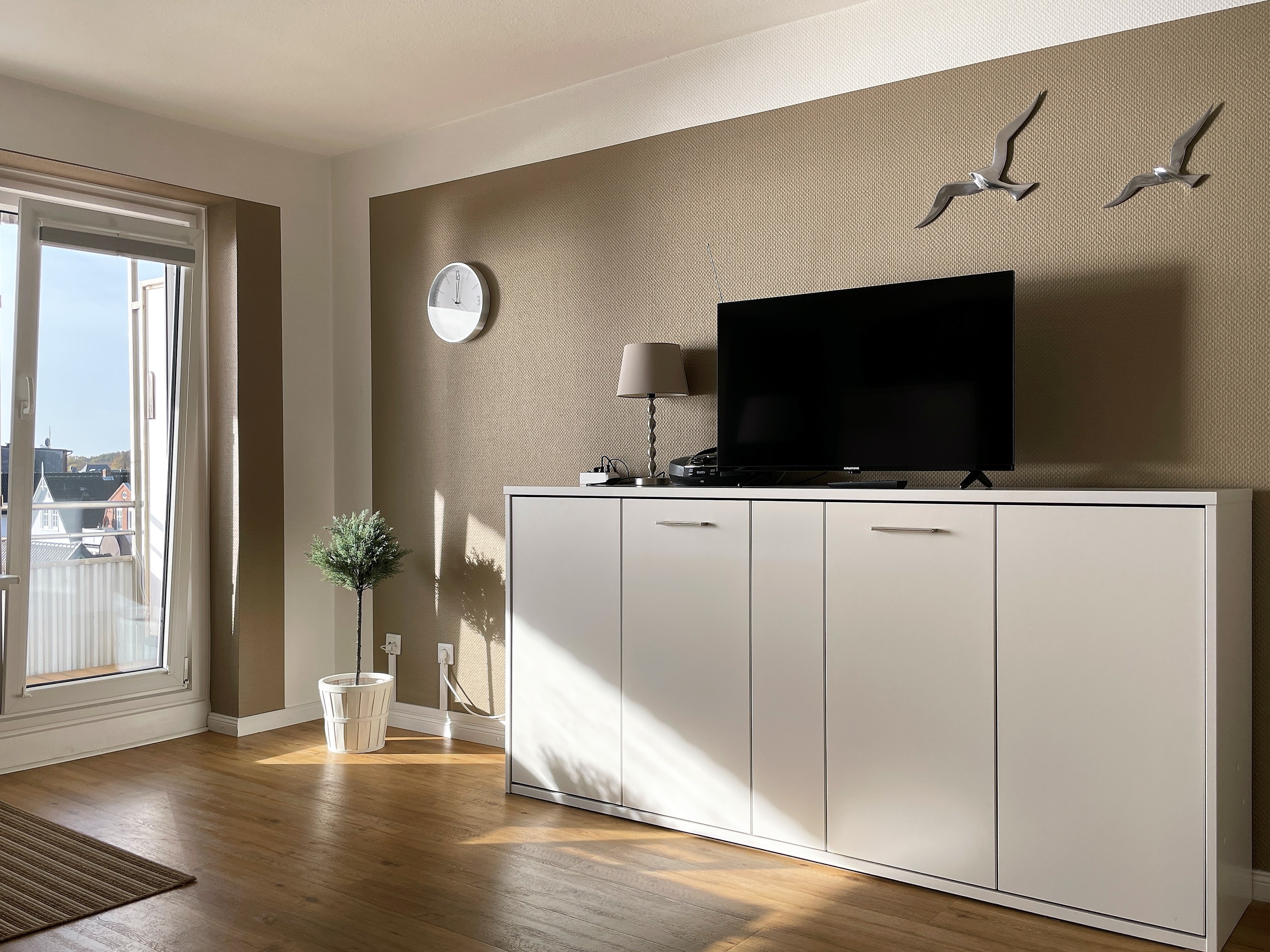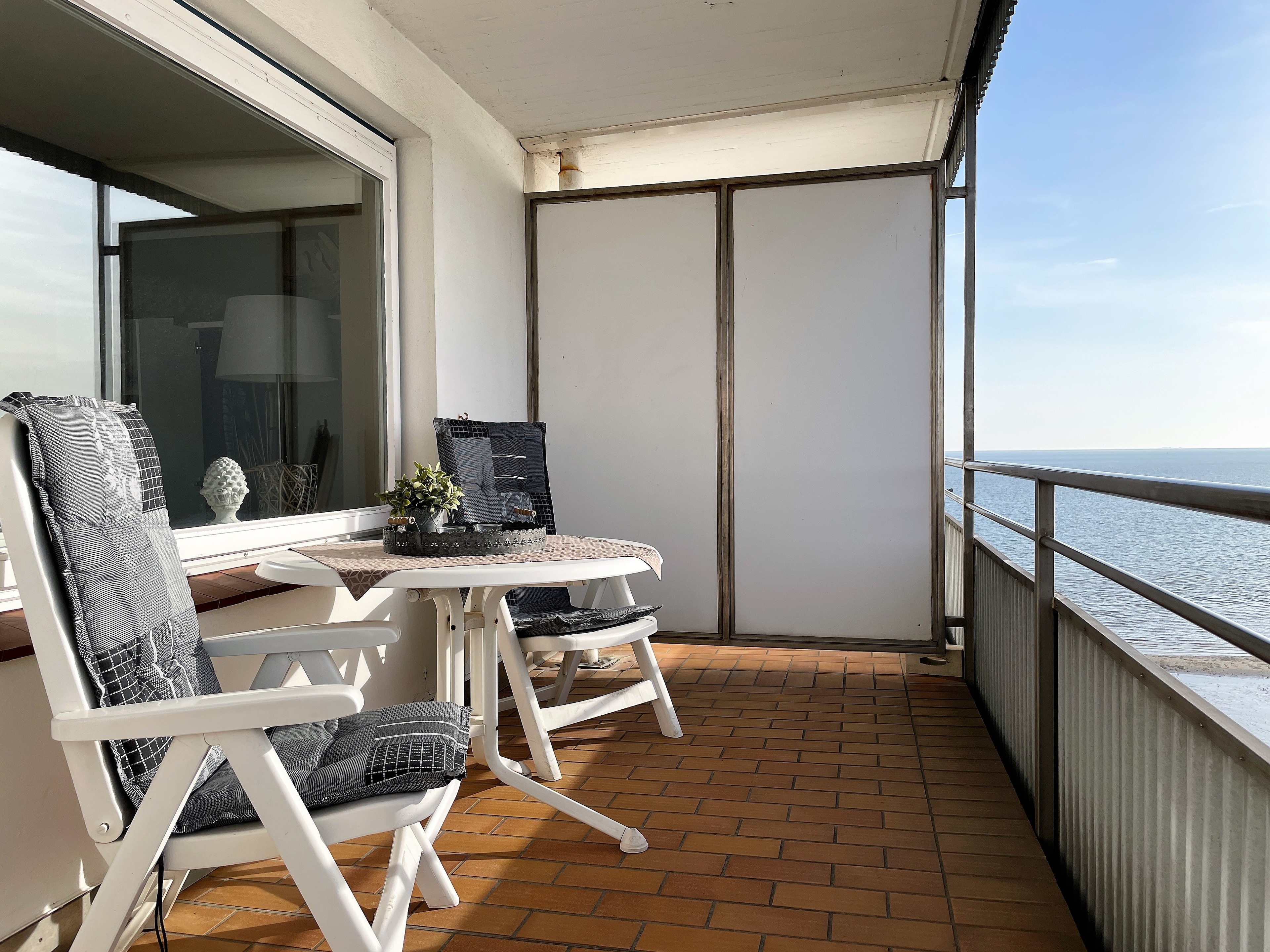 Genießen Sie traumhafte Urlaubstage in unserer ca. 60 qm großen Ferienwohnung Atlantischer Hof 24 mit bis zu drei Personen. Lichtdurchflutet liegt der geschmackvoll eingerichtete Wohnraum in perfekter Lage mit direktem Blick auf die Nordsee! Relaxen Sie gemütlich in einer Wohnung mit Wohlfühlcharakter während Sie dem Schauspiel von Ebbe und Flut folgen oder genießen Sie die Nordseebrise direkt vom Balkon aus und lassen Ihren Blick über das Meer und den langen Sandstrand schweifen. Zur Wohnung gehört weiterhin ein kleines, funktionales Bad mit Dusche, eine separate Küche um sich selbst versorgen zu können, falls man mal nicht die kulinarischen Köstlichkeiten der fußläufig entfernt liegenden Restaurants genießen möchte und ein Schlafzimmer mit Doppelbett (180x200cm)und einem zusätzlichem TV. Die dritte Schlafmöglichkeit wird durch ein hochwertiges Schrankbett (90x200cm) im Wohnzimmer geboten. Die zentrale Lage ermöglicht es, alle Einkaufsmöglichkeiten des täglichen Bedarfs fußläufig zu erreichen und in nur wenige Schritten sind Sie am Strand und Meer!