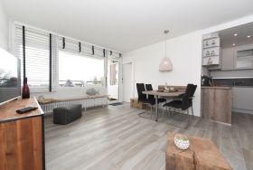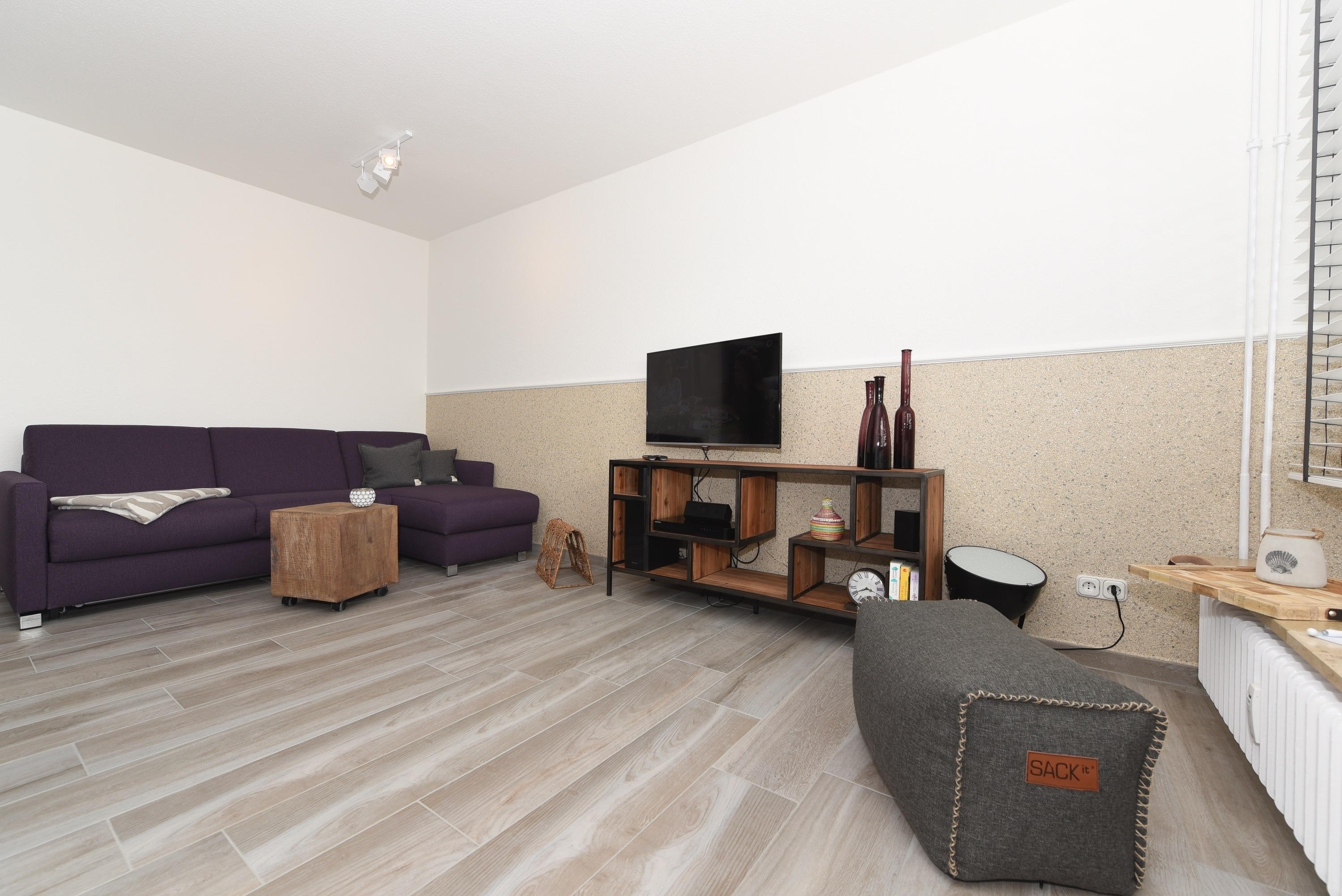 Im gemütlichen Wohnbereich finden Sie ein modernes, hochwertiges Sofa, das mit wenigen Handgriffen in ein bequemes Bett umgebaut werden kann. Zudem sorgt die moderne Unterhaltungstechnik für unterhaltsame Abende. Die neu gestaltete, vollständig ausgestattete Kochnische fügt sich perfekt in den Raum ein und lädt zu gemeinsamen Kochabenden ein.