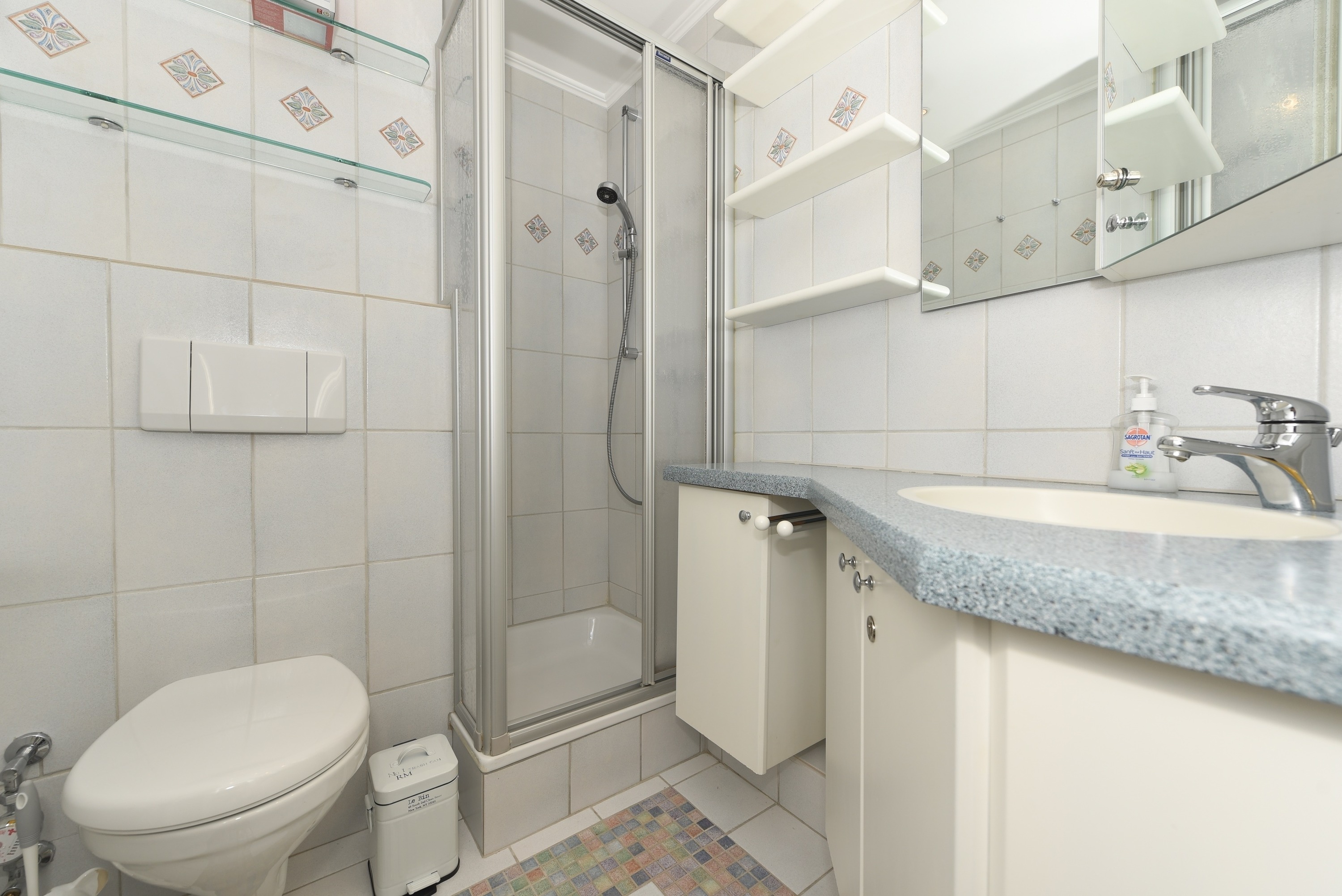 Das Duschbad ist in hellen, freundlichen Farben gehalten und sorgt für eine entspannende Atmosphäre. Vom Flur aus gelangen Sie bequem in den Wohnbereich, das Badezimmer und eine praktische Abstellkammer.
