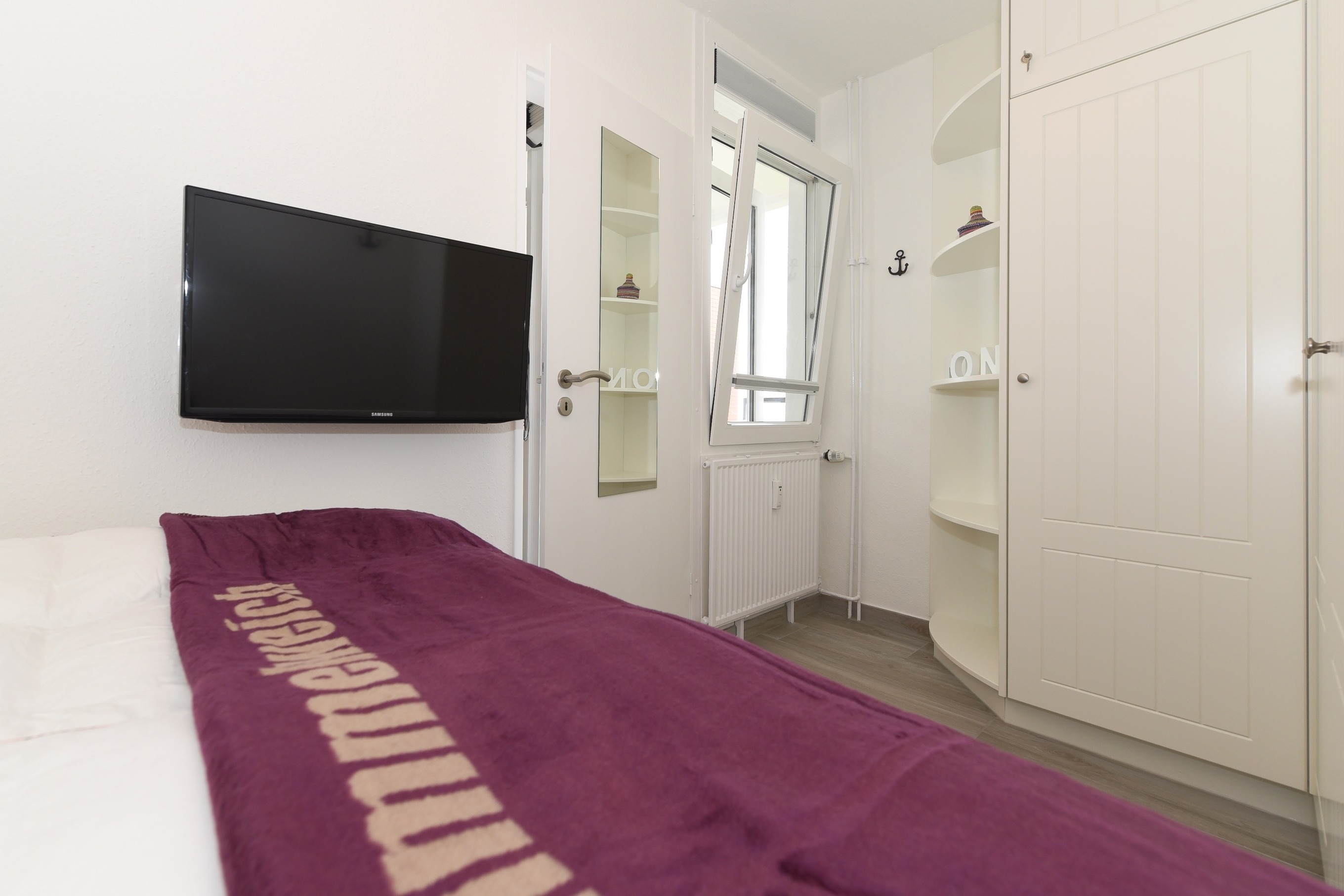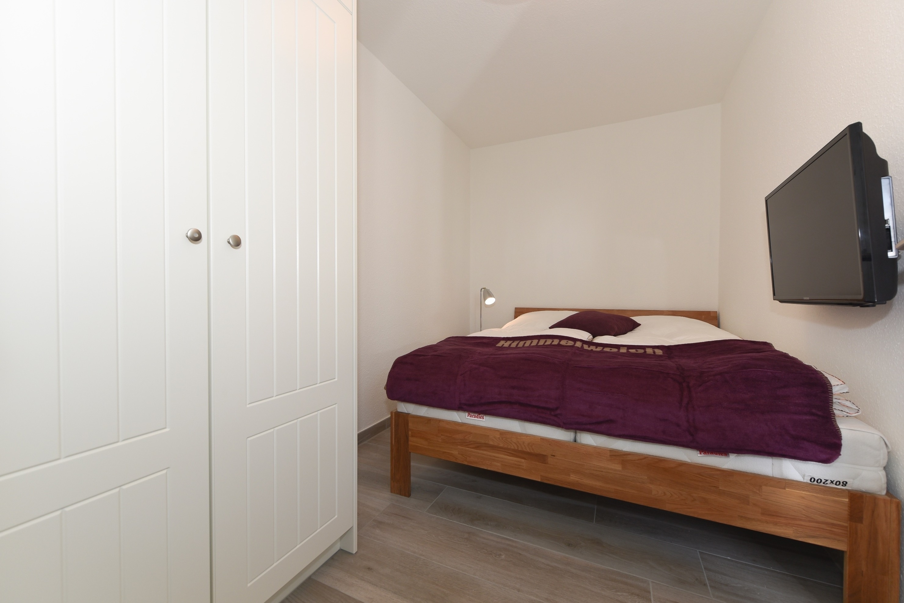 Das Schlafzimmer ist klein, aber fein und bietet ein komfortables Doppelbett, einen großen Kleiderschrank und einen zusätzlichen Fernseher – ideal für eine erholsame Nacht.