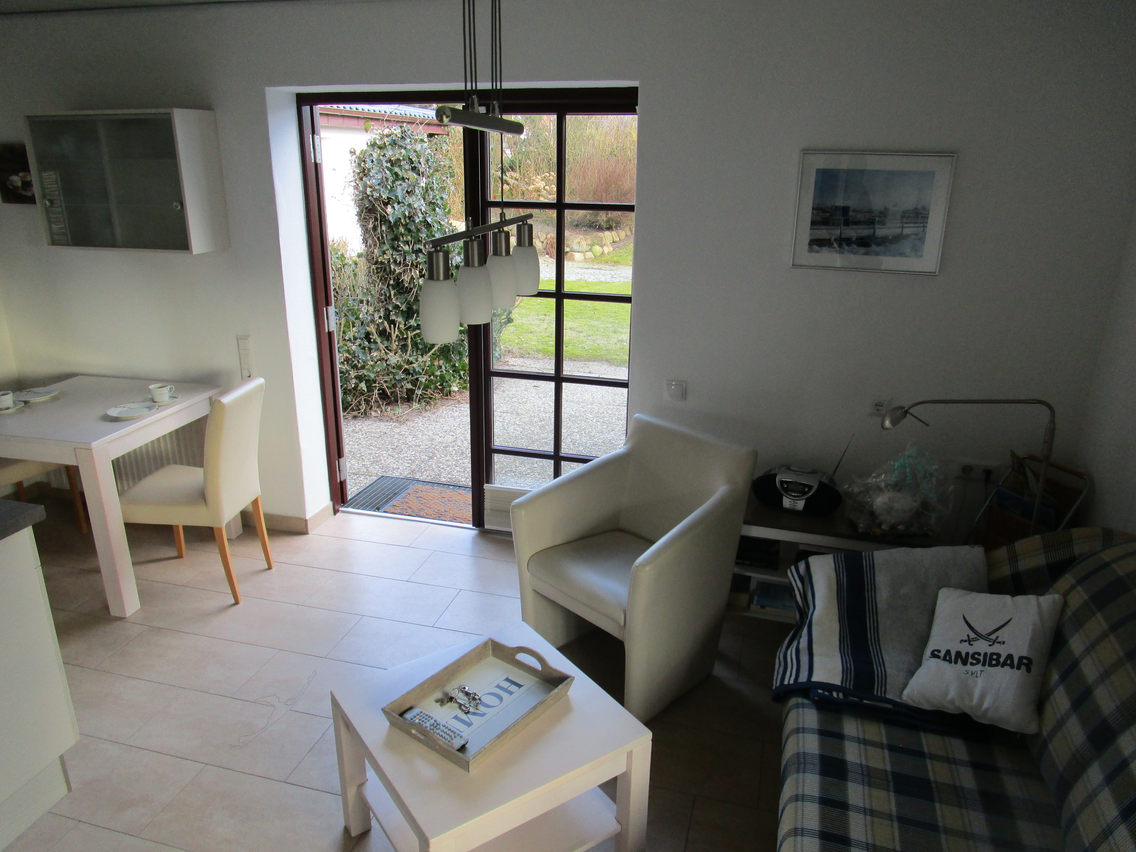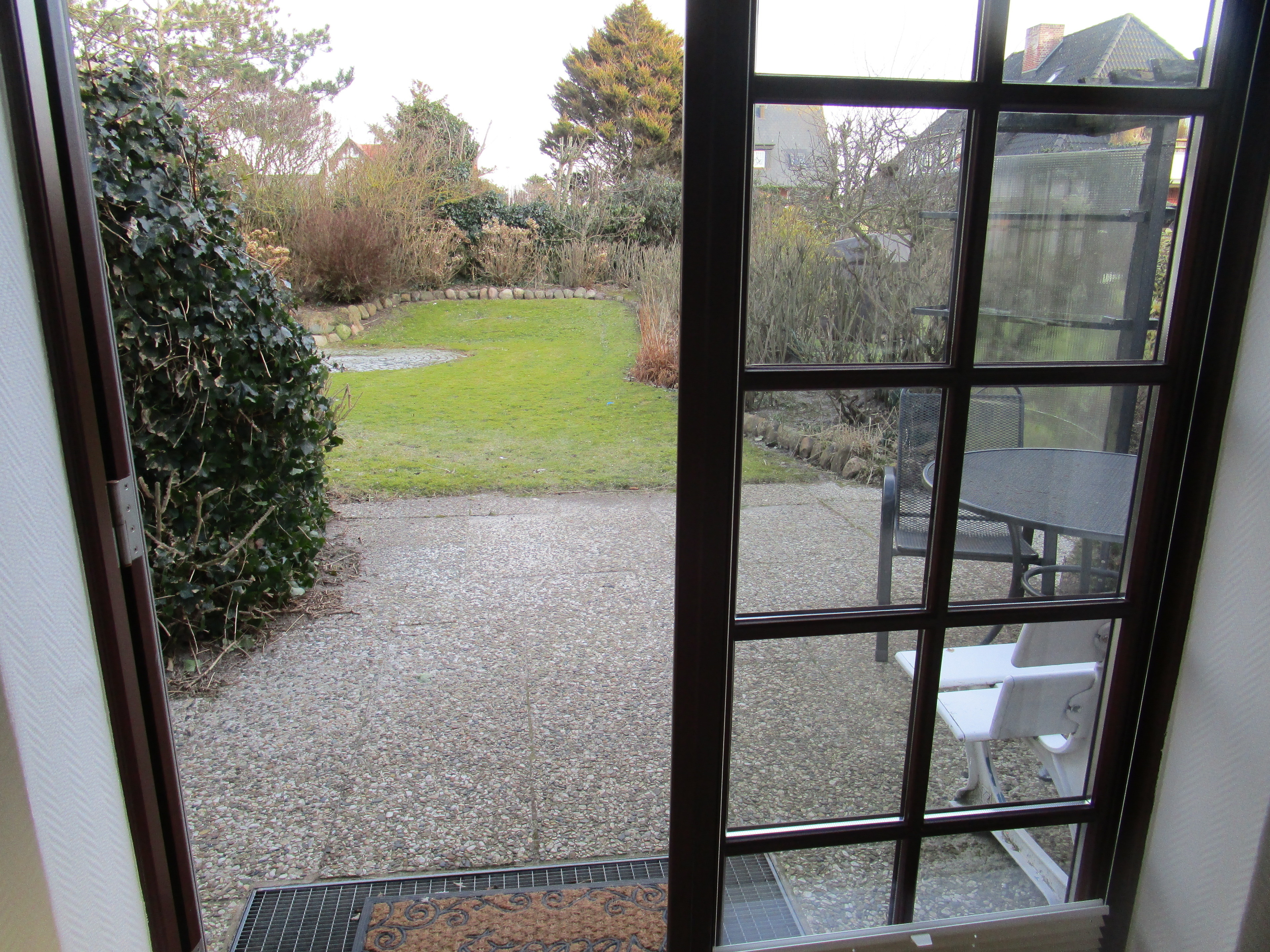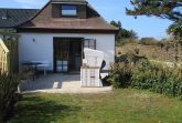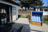 Die Wohnung hat einen eigenen Eingang . Zur eigenen Terrasse gehören Gartenmöbel und der Strandkorb.