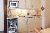 Größe ca. 40 Quadratmeter, Wohnraum mit separatem Küchenteil bei offener Raumgestaltung, Schlafzimmer, Badezimmer mit Dusche, Waschtisch und WC, Obergeschoss, Loggia (überdachter Balkon), optimal für 1 bis 2 Personen.