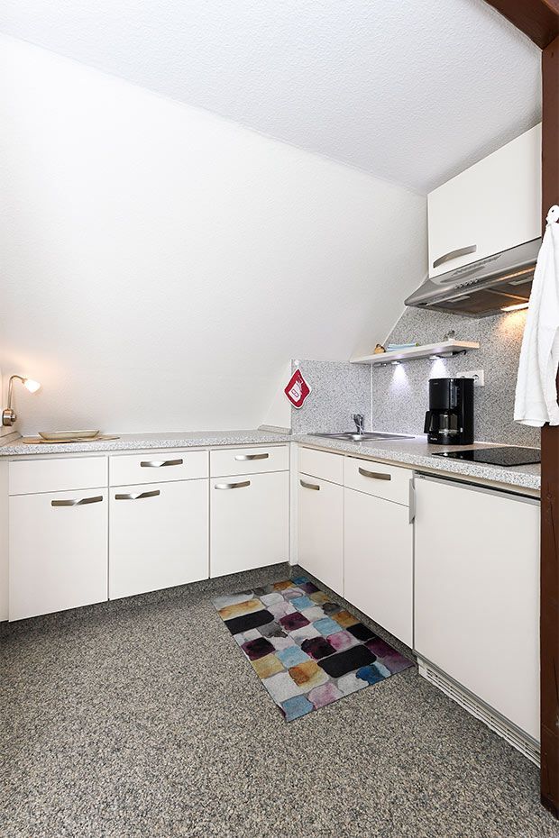 Größe ca. 25 Quadratmeter, Wohn- und Schlafraum mit integriertem Küchenbereich, Badezimmer mit Dusche, Waschtisch und WC, Obergeschoss, Loggia (überdachter Balkon), optimal für 1 Person.