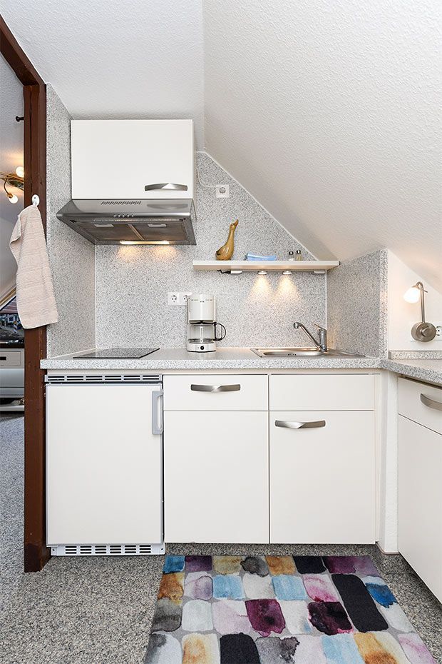Größe ca. 25 Quadratmeter, Wohn- und Schlafraum mit integriertem Küchenbereich, Badezimmer mit Dusche, Waschtisch und WC, Obergeschoss, Loggia (überdachter Balkon), optimal für 1 Person.