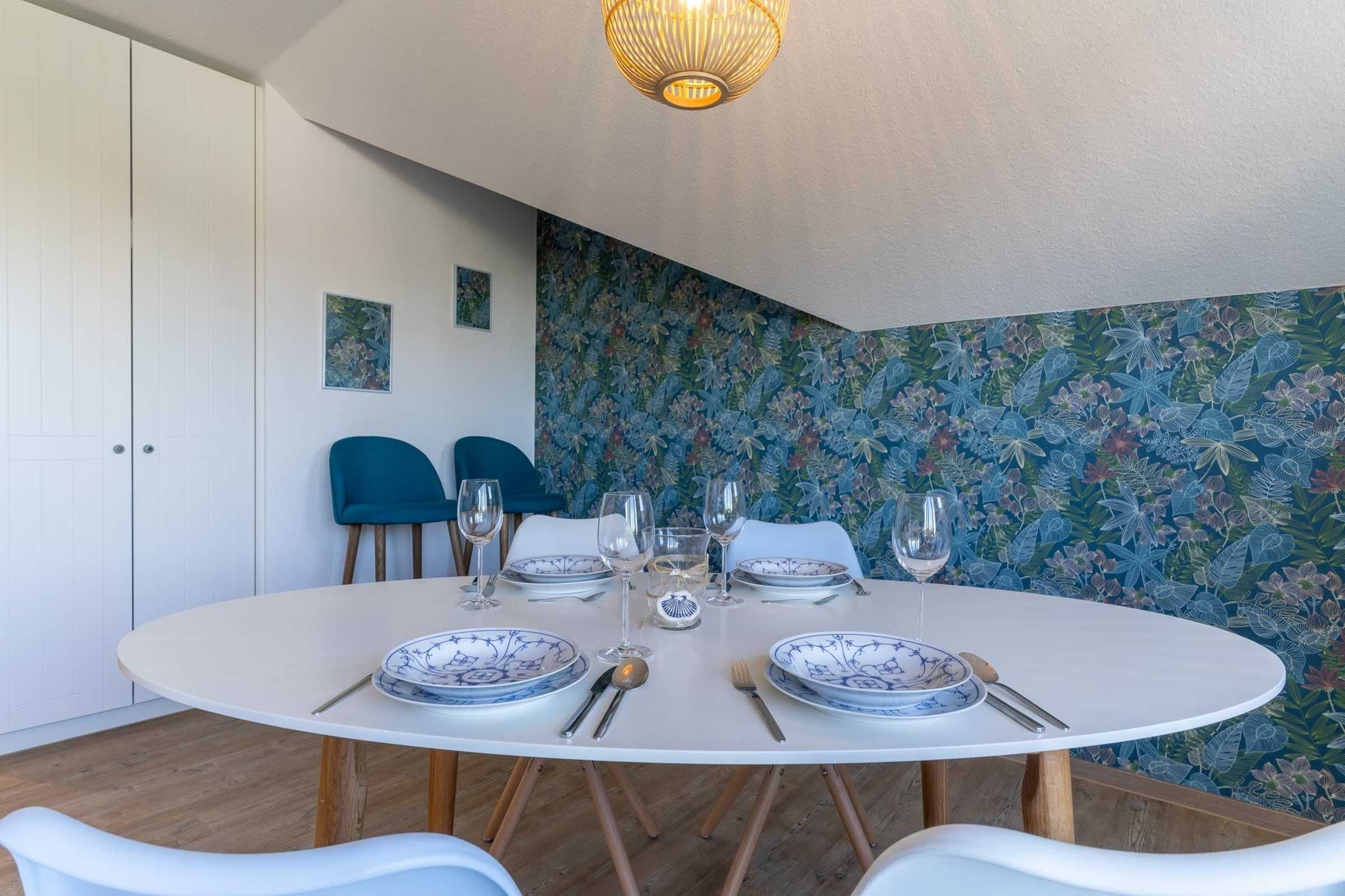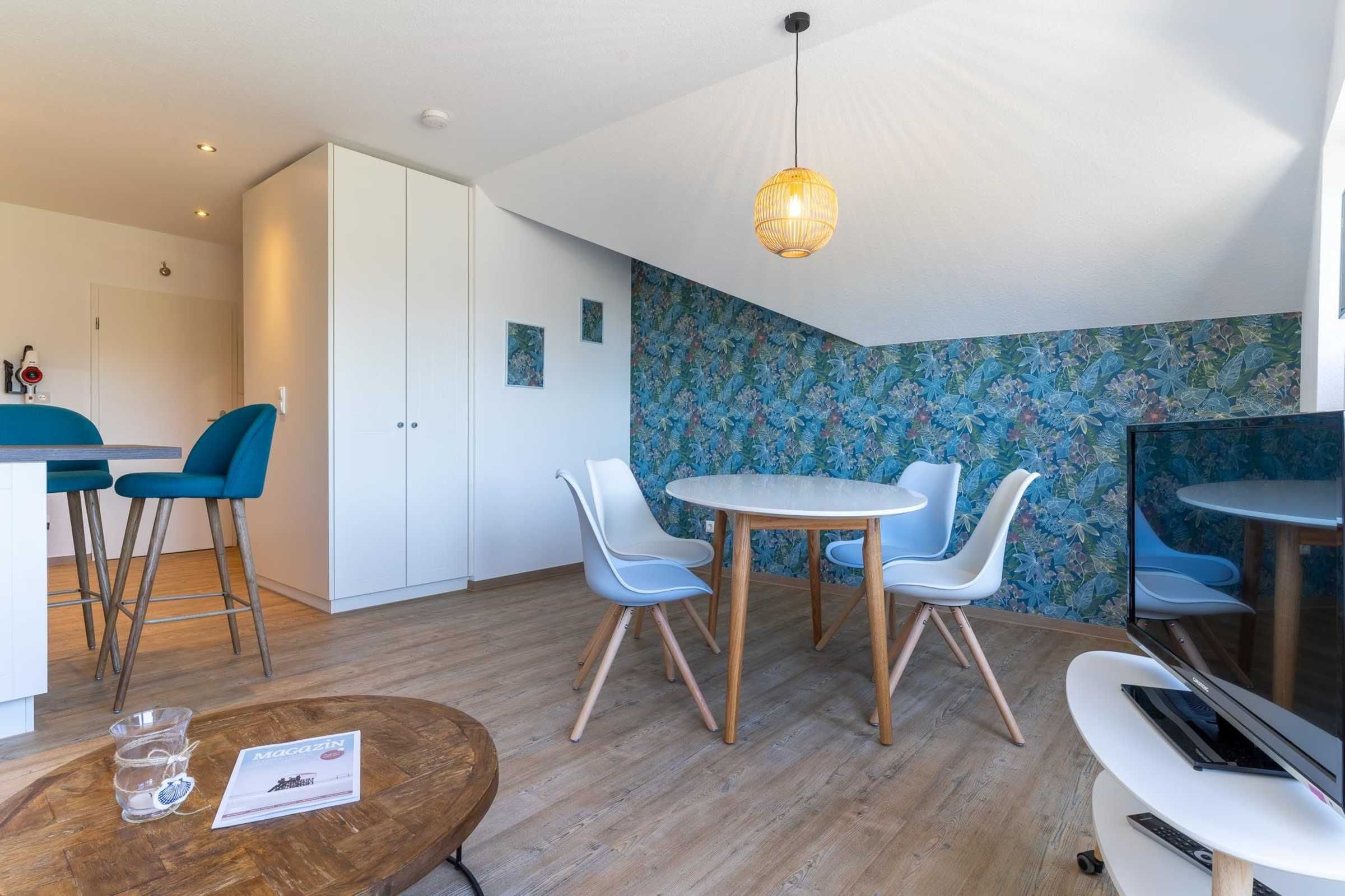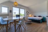 Genießen Sie Ihren Urlaub alleine oder zu zweit in unserer wunderschönen Ferienwohnung. Mit viel Liebe zum Detail haben wir das 1-Raum-Apartment von Grund auf renoviert und in ein lichtdurchflutetes Raumwunder verwandelt. Im Wohn-/Schlafbereich lädt das hochwertige (Schlaf-)Sofa zum Entspannen ein und ist mit seinem petrolfarbenen Polster ein toller Anblick. Im Essbereich haben wir mit einer farbenprächtigen Tapete einen Blickfang geschaffen, eingerahmt von warmen Holz- und klaren Weißtönen. Die weiße Küche mit dunkler Arbeitsplatte und ein modernes, helles Bad runden das Gesamtkonzept ab: Nordisch pur mit ganz viel Wohlfühl-Atmosphäre. Überzeugen Sie sich an Hand der Bilder selbst, dass klein auch ganz großartig sein kann. Pkw-Stellplatz auf dem Grundstück, Nr. 16