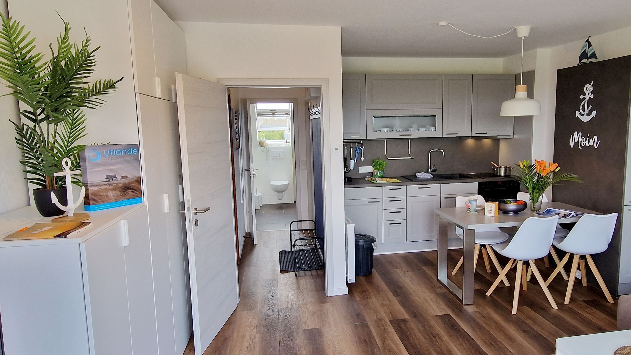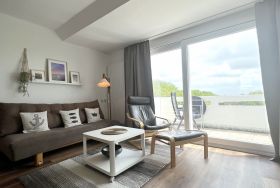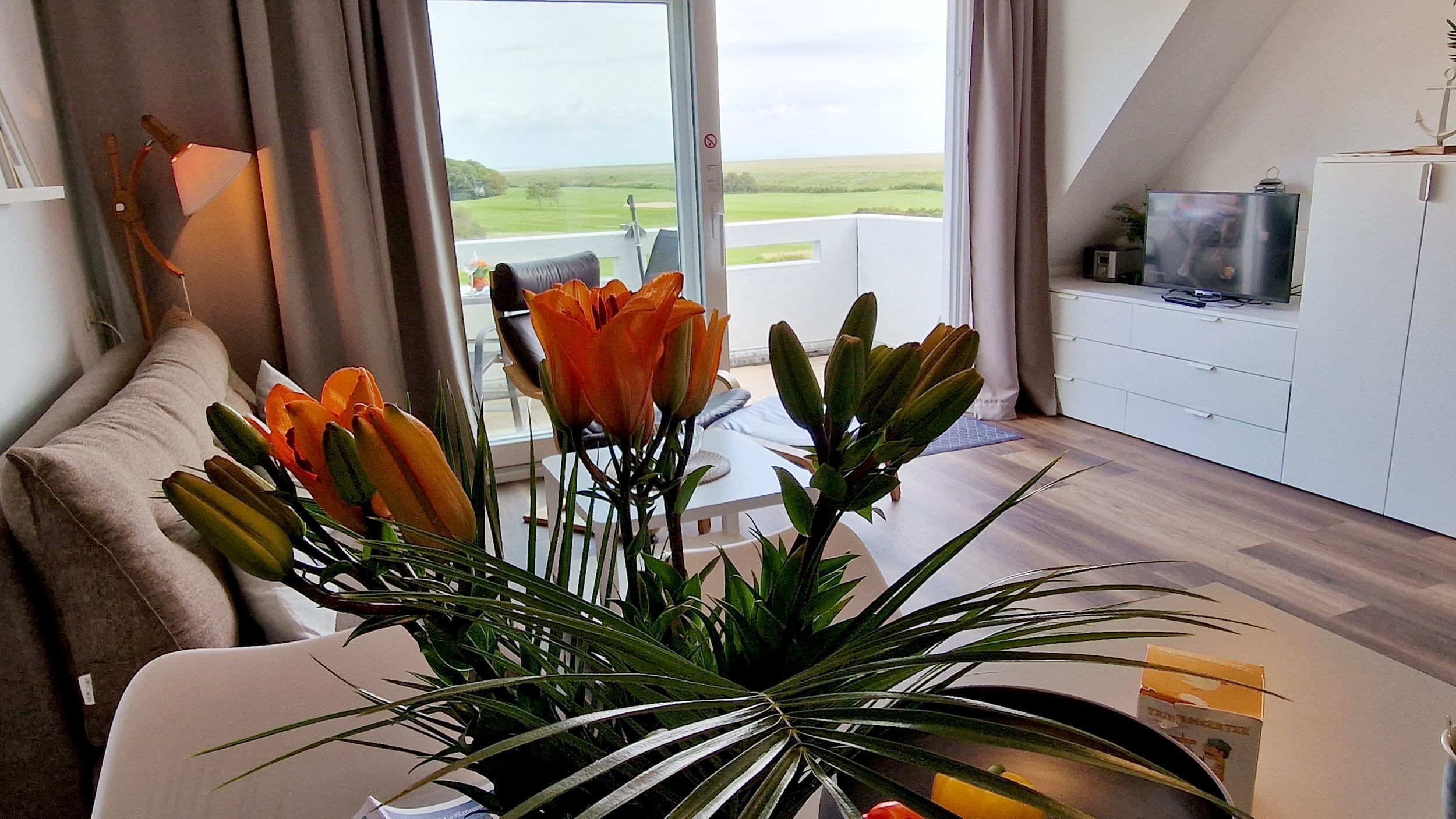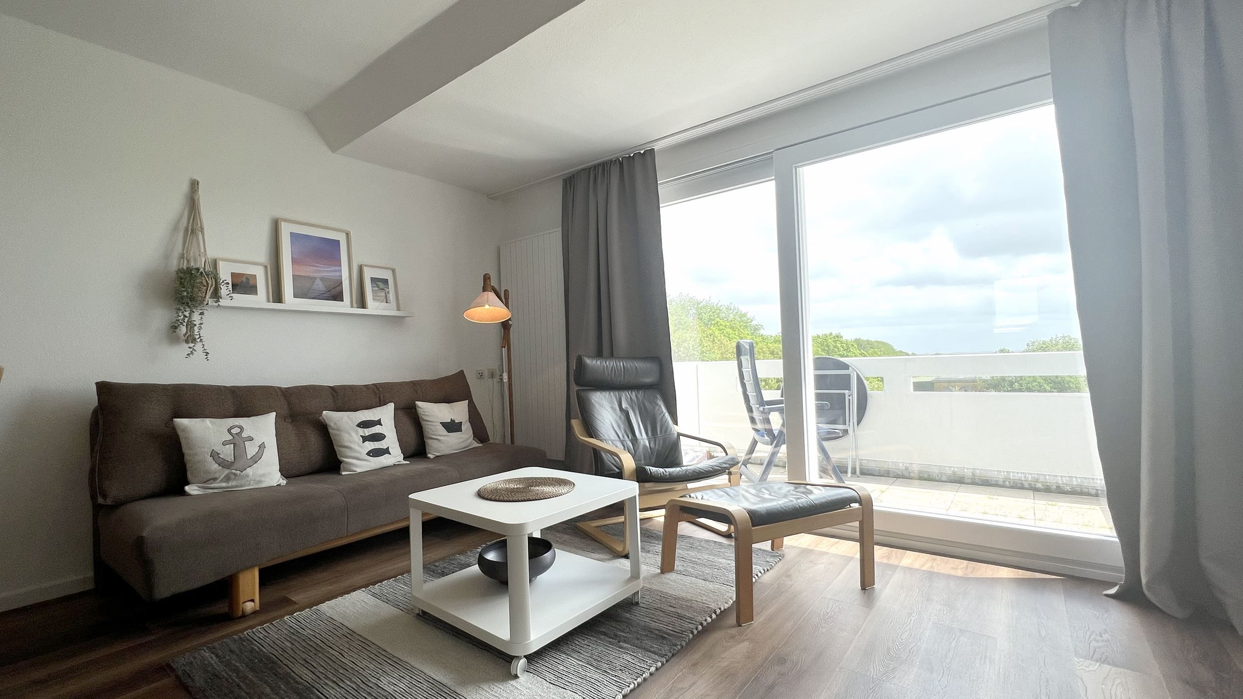 Helle, gemütliche und mit Liebe eingerichtete 2-Zimmer-Nichtraucher-Ferienwohnung. Genießen Sie den sonnigen Balkon im 2. OG, in Süd-Ostlage, mit weitem Blick über den Golfplatz aufs Meer, bei klarer Sicht bis nach Büsum. Die sehr hübsche, ins Wohnzimmer integrierte friesische Küchenzeile, ist mit Ceranfeld und Backofen ausgestattet. Spannen Sie nachts auf der modernen Schlafcouch aus oder im kleinen Doppelbett (140x200cm ) des Schlafzimmers. Erfreuen Sie sich an dem modernisierten Duschbad und kostenlosem WLAN. Ihr Auto können Sie geschützt in der Tiefgarage, Nr.12, mit Fernbedienung für das Tor parken.