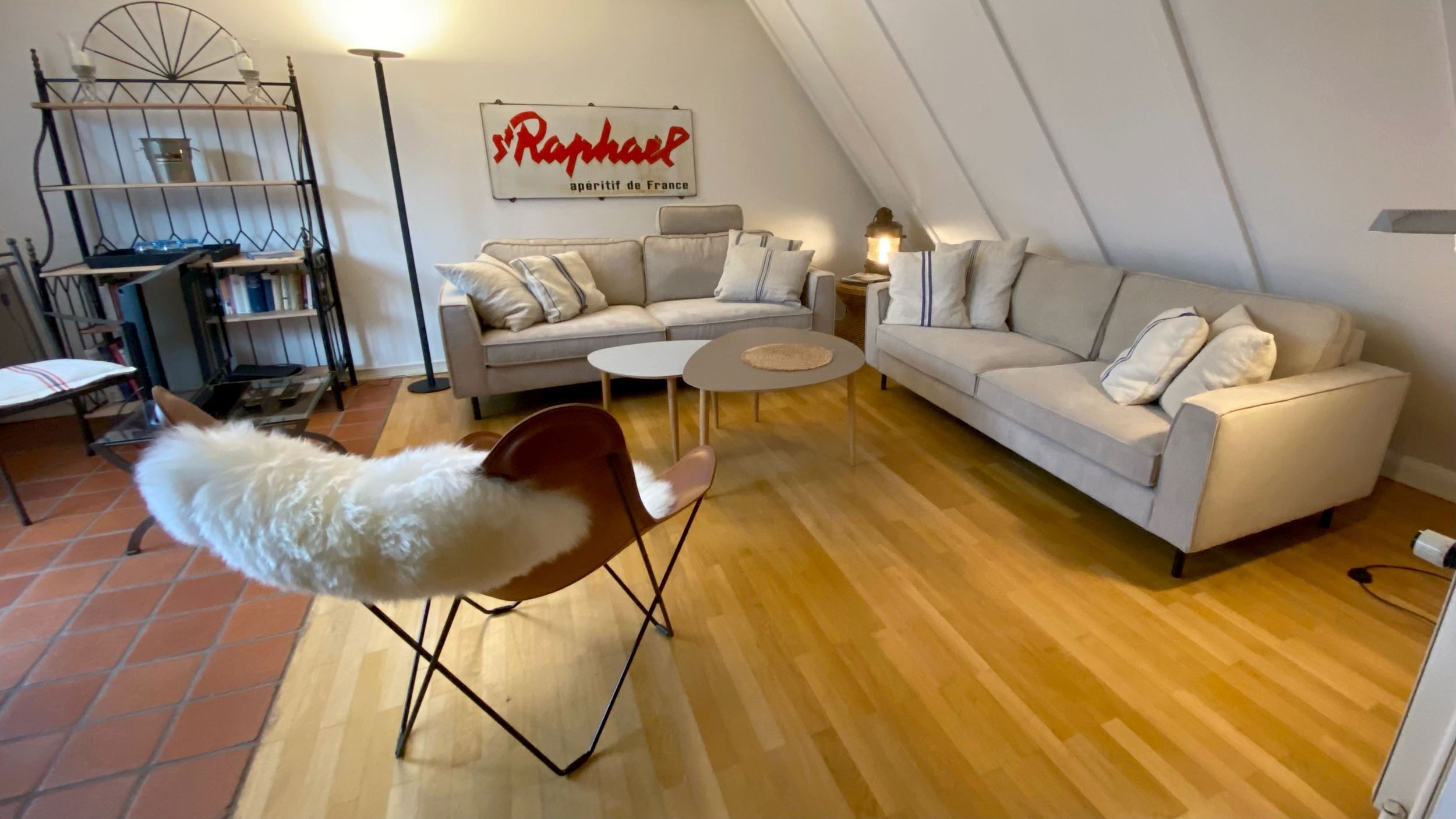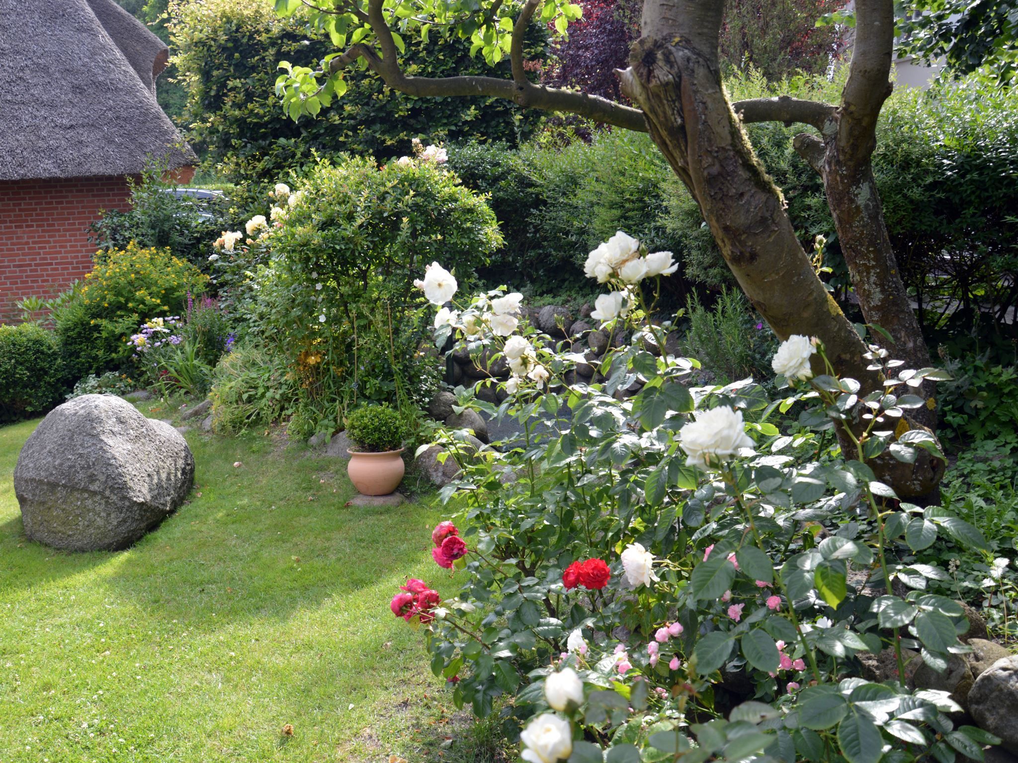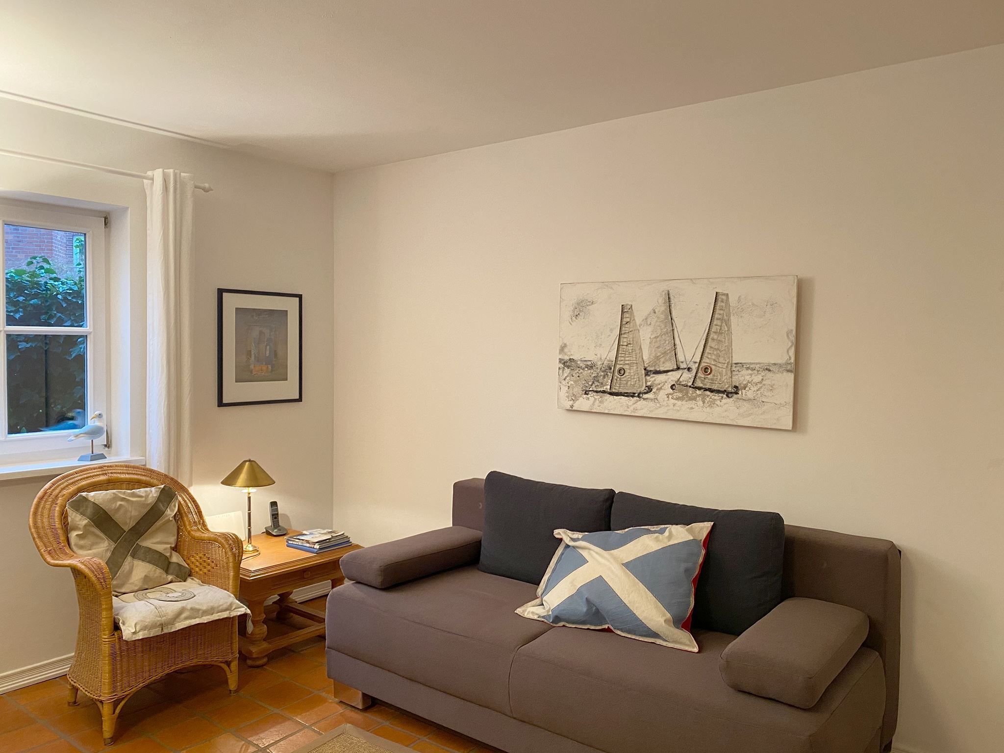 Das Haus ist individuell eingerichtet und gut ausgestattet. Im OG befinden sich ein Schlafzimmer, ein kleines Bad und das große Wohnzimmer mit offenen Dachbalken, Kamin und kleinem Süd-Balkon. Im EG liegen ein Badezimmer, die voll-ausgestattete Küche (Elektroherd, Geschirrspüler, Kühl-Gefrierschrank, Mikro-Welle) und ein kombiniertes Wohn-/Schlafzimmer mit Zugang zu Terrasse und Garten mit Strandkorb. Außerdem: Kabel-TV & WLAN. PKW-Stellplatz ist auf dem Grundstück vorhanden.