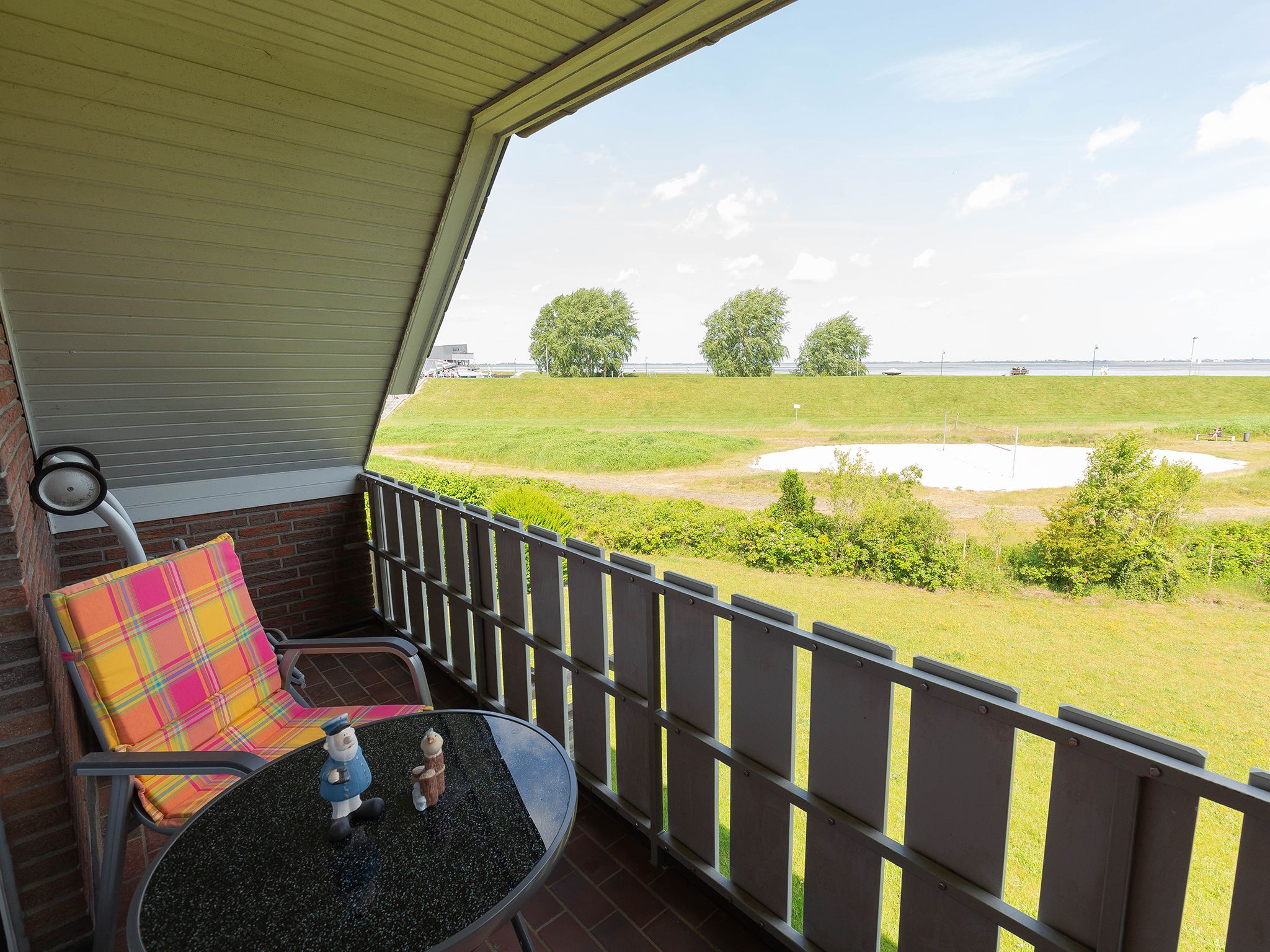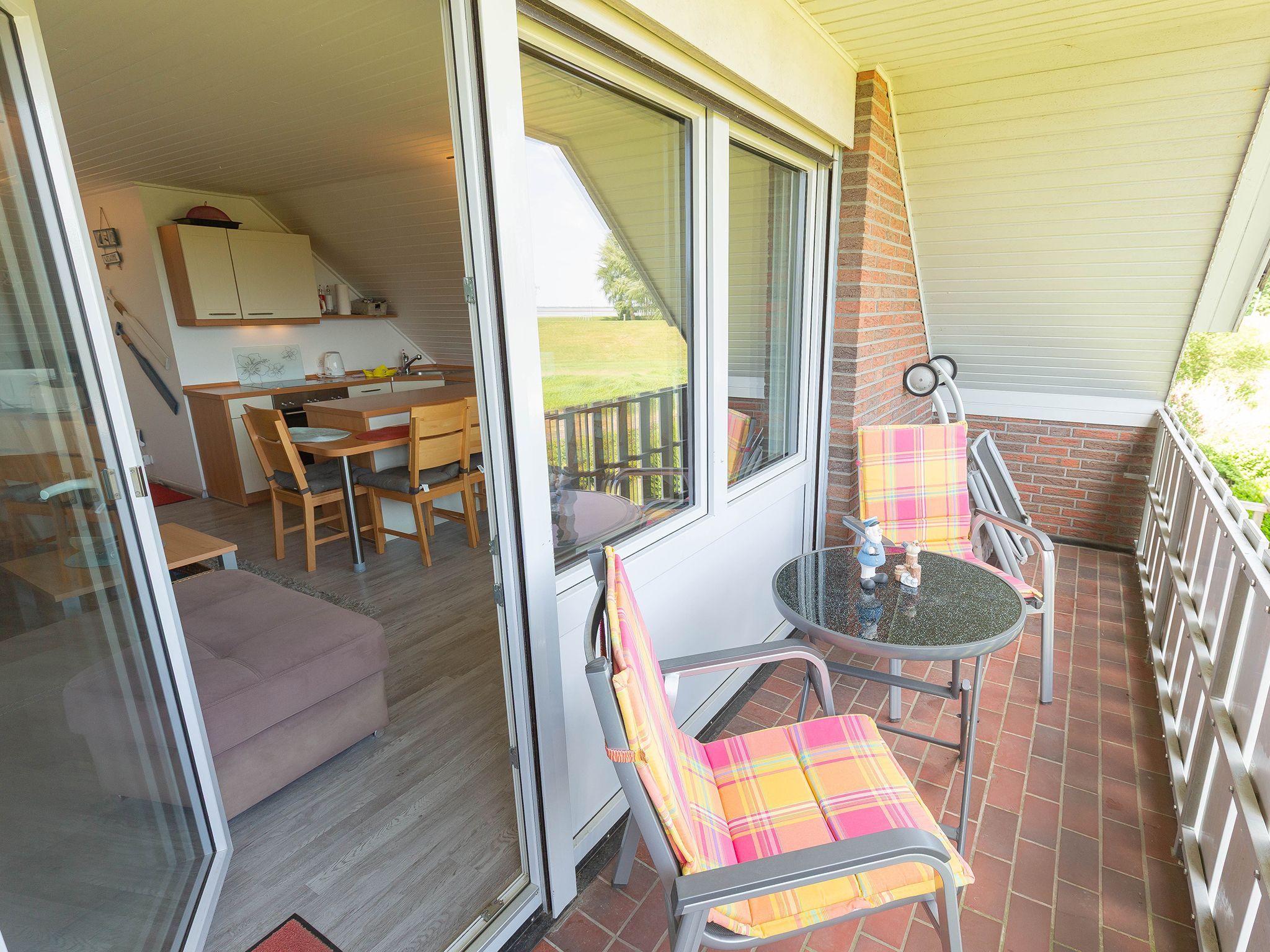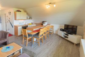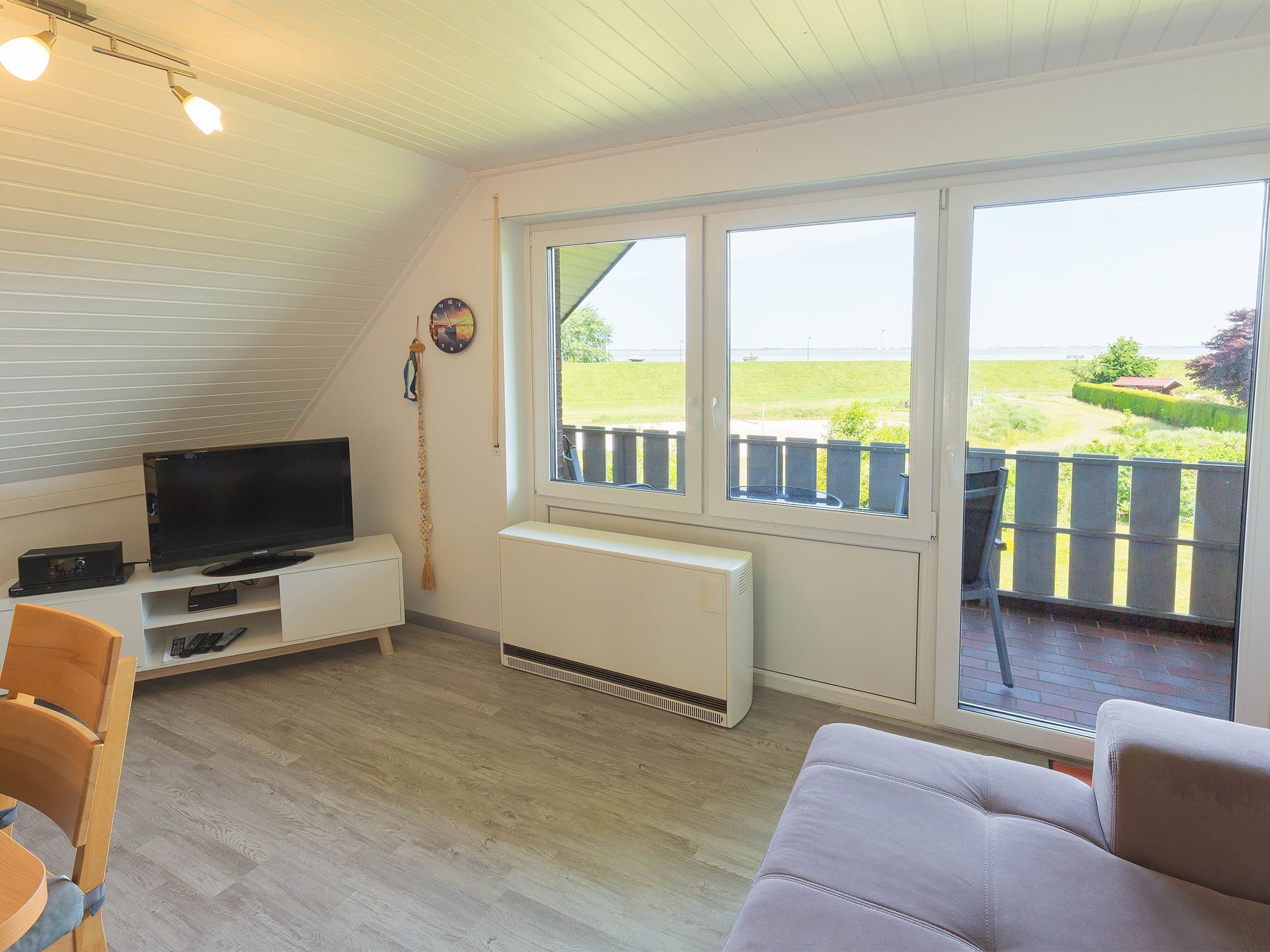 Direkt am Deich mit Blick auf den Jadebusen finden Sie unsere Wohnung Deichblick I am Kukshörner Weg 12b. Im ersten Stock erstreckt sich die Wohnung auf zwei Etagen. Auf Ebene eins finden Sie das Doppelschlafzimmer, das Wohn-/Esszimmer sowie das komplett sanierte Bad mit bodentiefer Dusche. Das Schlafzimmer mit Doppelbett hat ein weiteres TV-Gerät und hier ist ihr direkter Zugang zum Südbalkon. Im Wohnbereich - der  Flat-Screen, DVD-Player und CD-Player bietet, gelangt man auf den weiteren Balkon mit einem schönen Blick auf den Jadebusen.