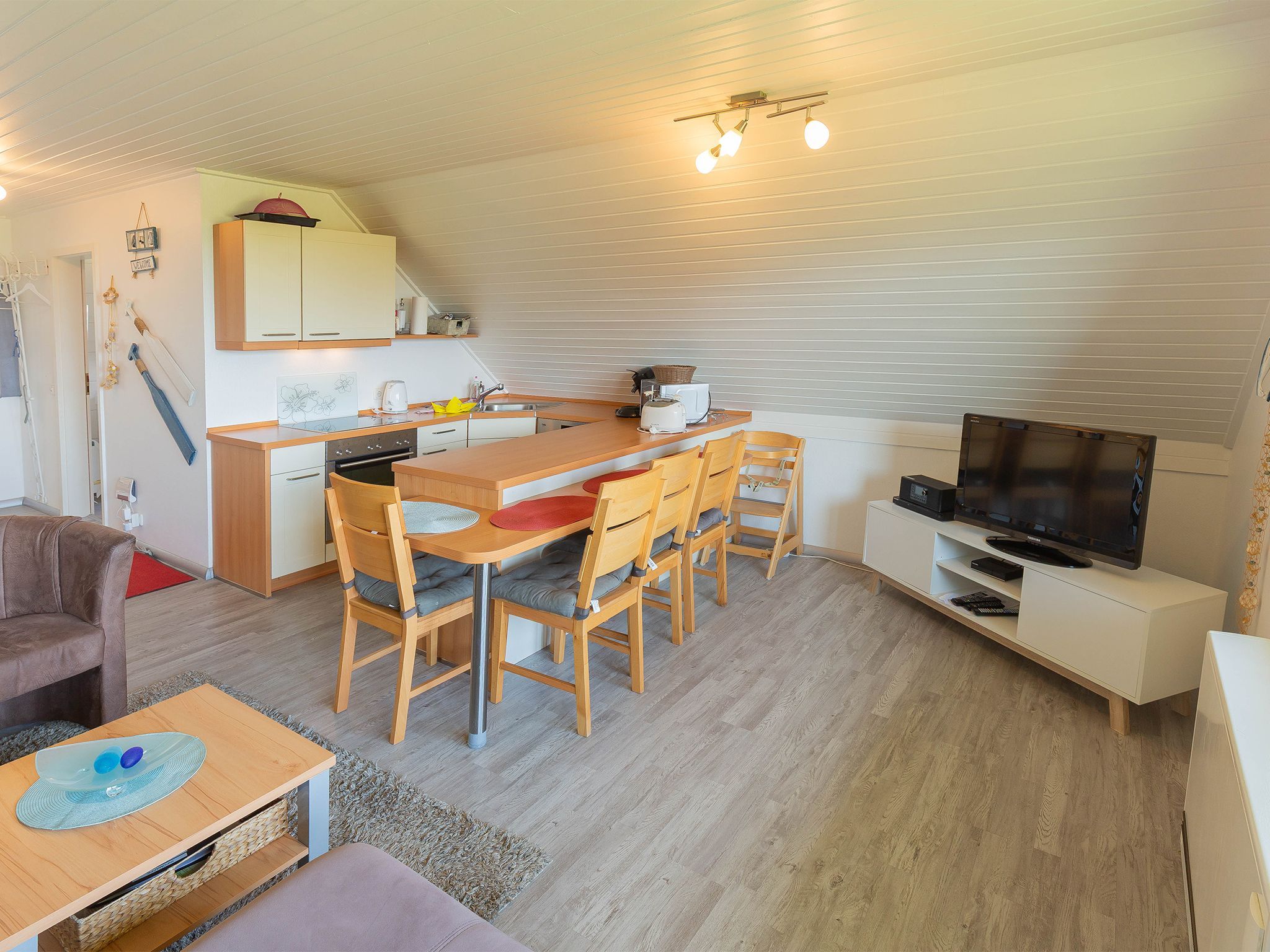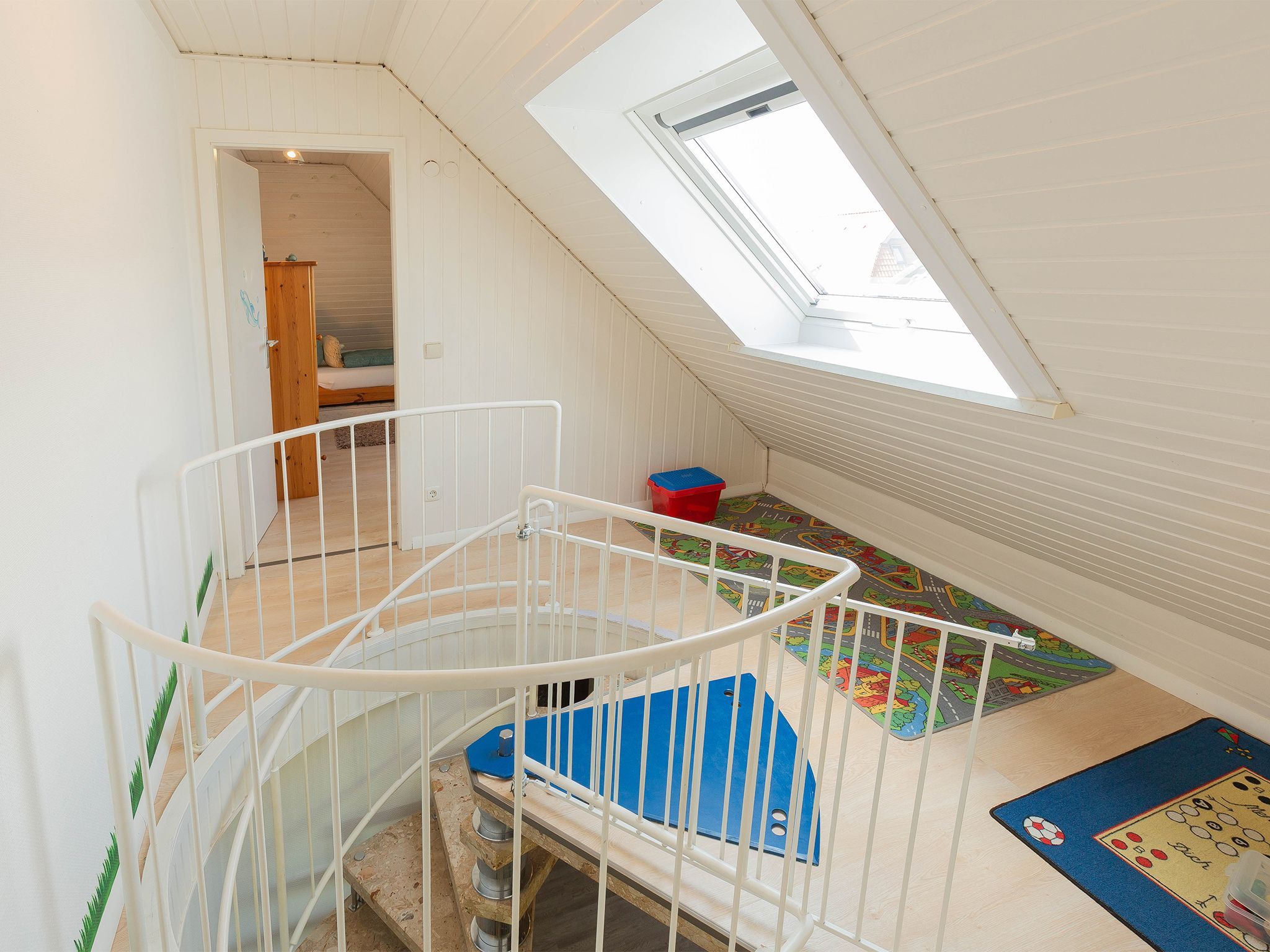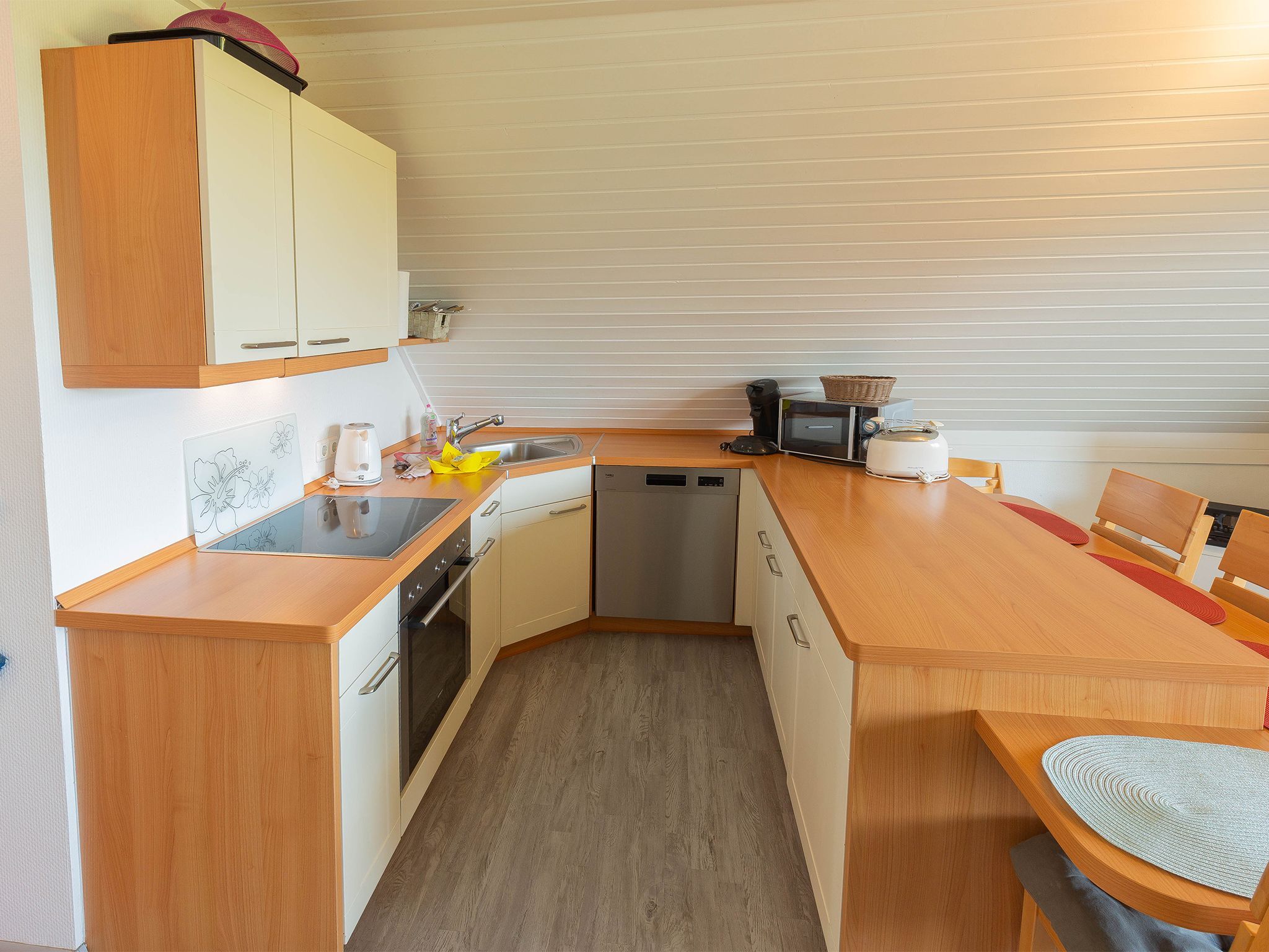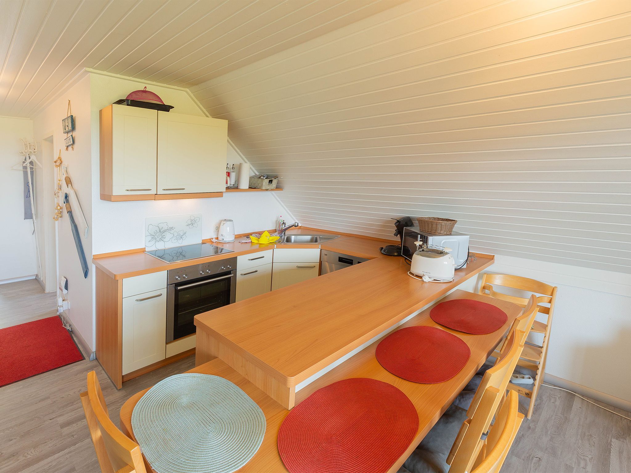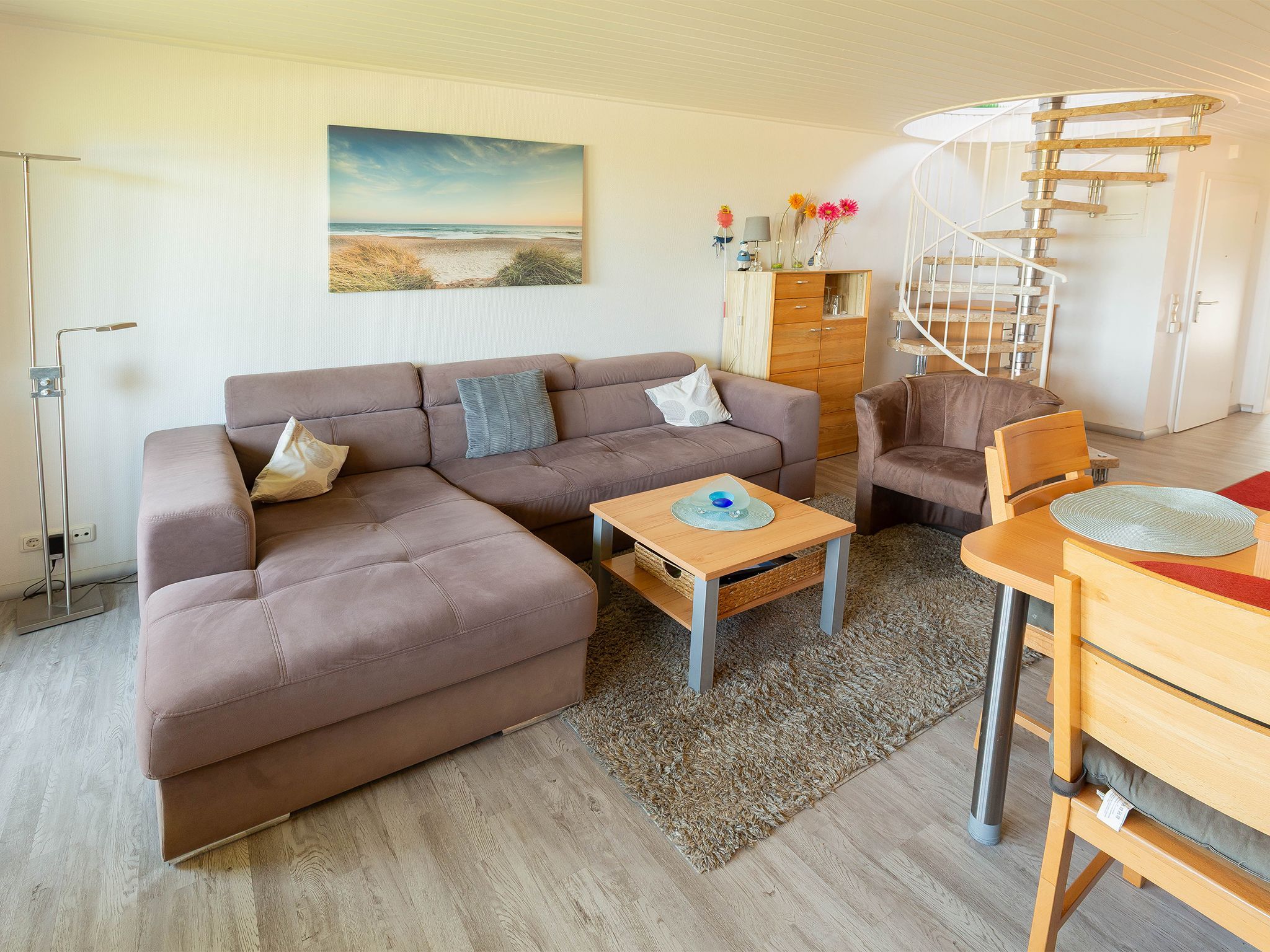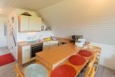 Die in den Wohnraum integrierte Einbauküche mit gehobener Ausstattung lässt keine Wünsche für ein entspanntes Kochen offen. Über eine Wendeltreppe geht es hinauf zu den beiden Schlafzimmern in die zweite Etage - jeweils bestückt mit einem Einzelbett.