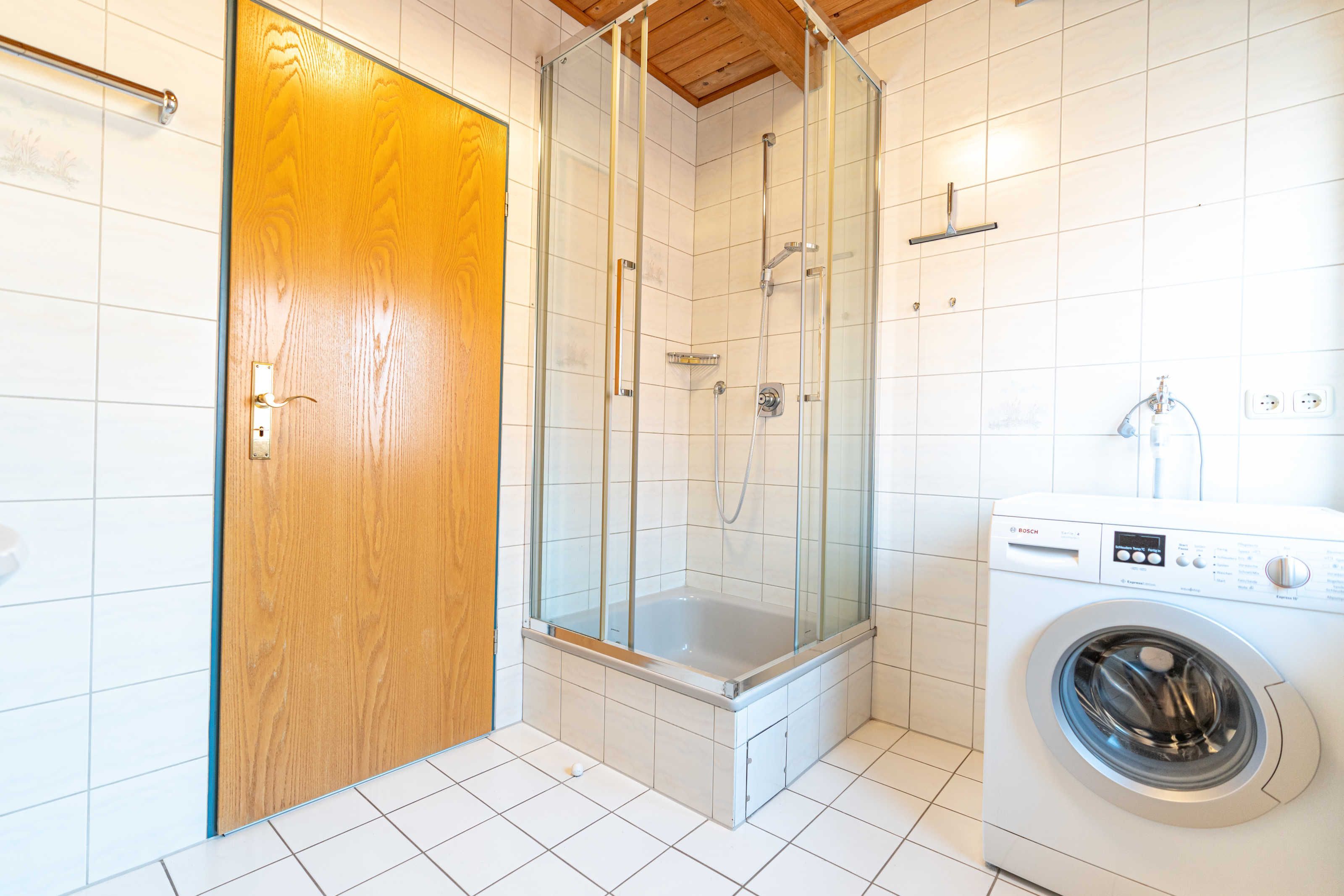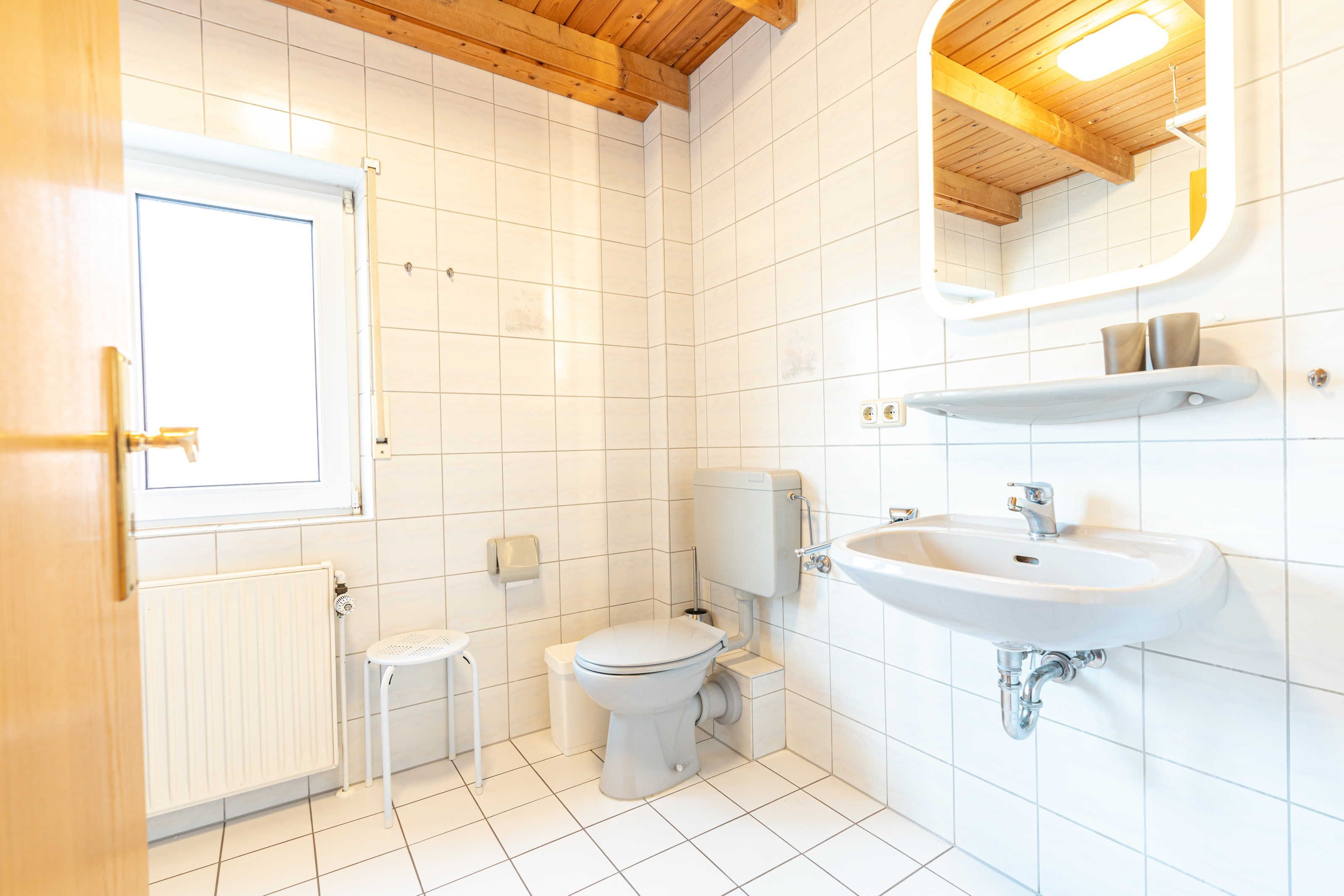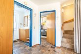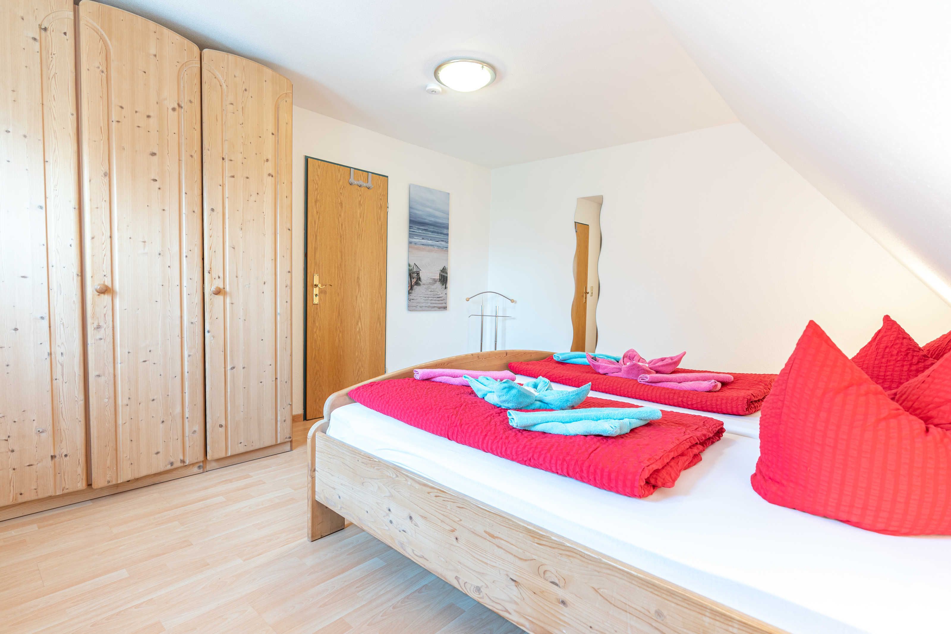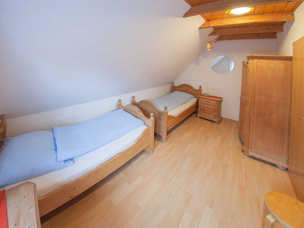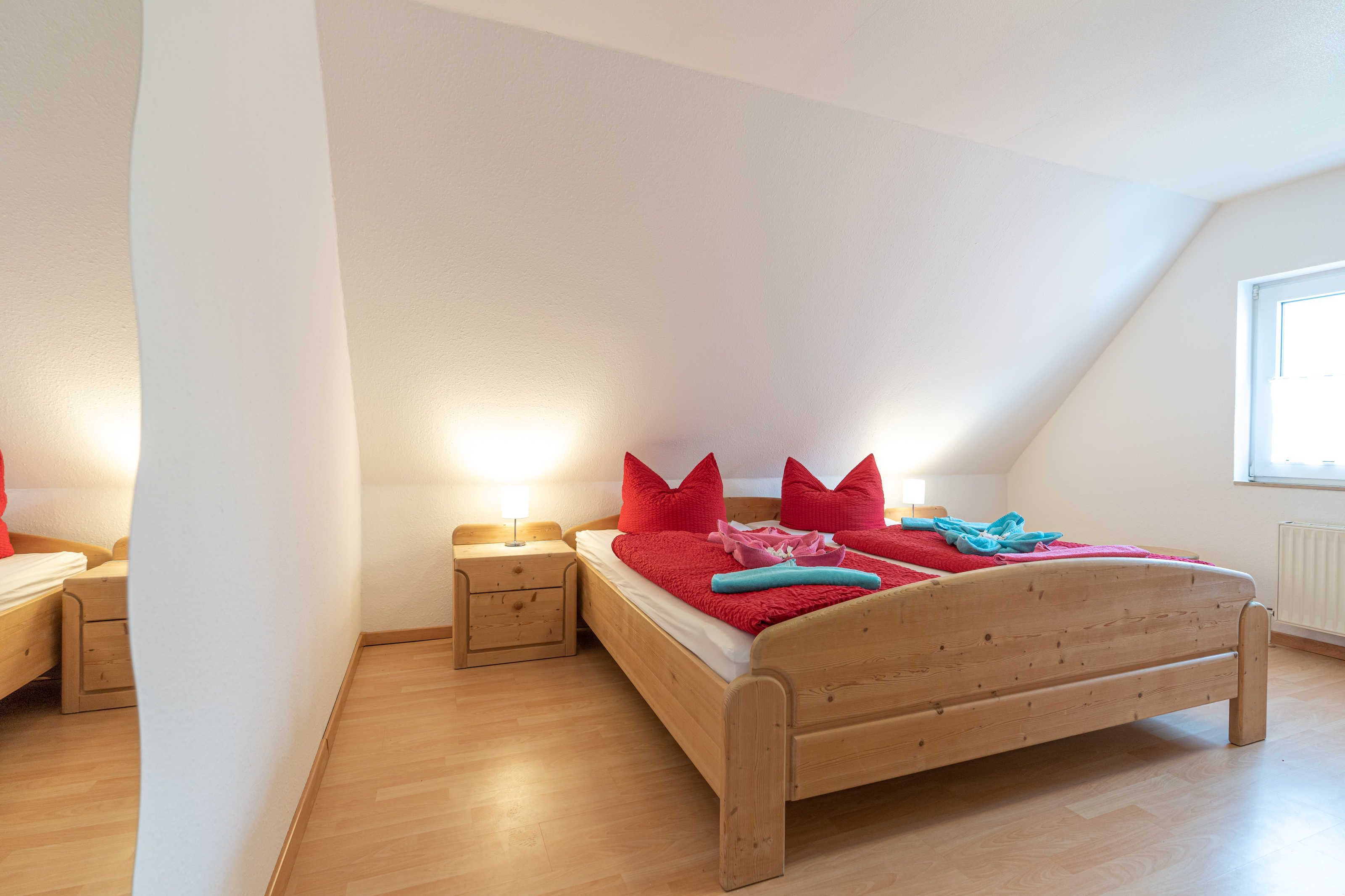 Im ersten Obergeschoss liegen zwei Schlafräume mit je zwei Einzelbetten und einem Doppelbett sowie das freundliche Duschbad mit Fenster. Im Dachgeschoss gibt es noch ein Zimmer mit weiteren zwei zusammengestellten Einzelbetten und ein Babyreisebett.
