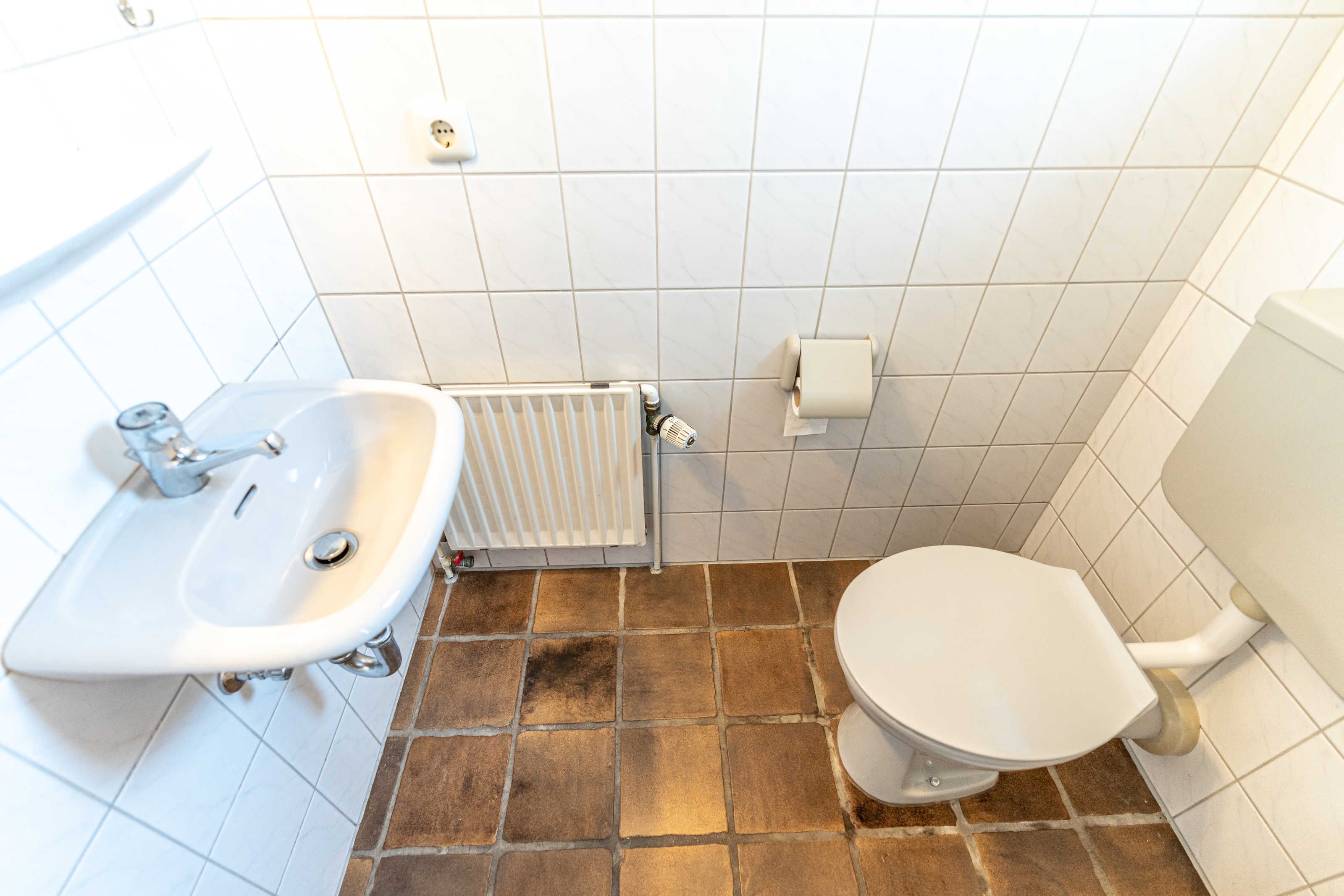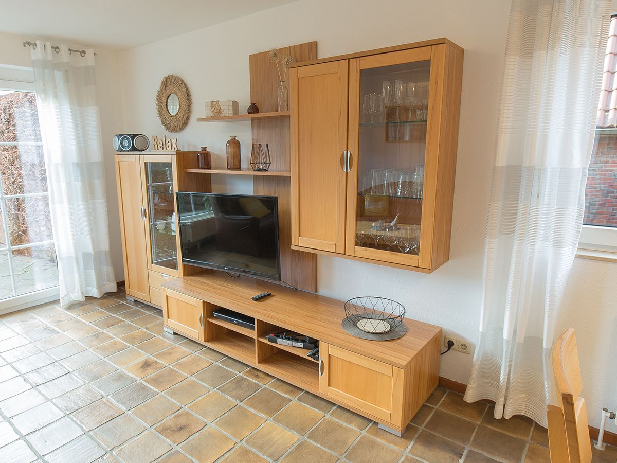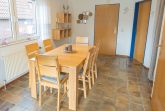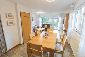 Sie betreten das ruhig gelegene, komfortable Ferienhaus durch den hellen Eingangsbereich. Hier befindet sich die Garderobe und ein Gäste-WC. Sie gelangen weiter in den geräumigen, kombinierten Wohn-/Essbereich mit moderner Möblierung, Flachbild-TV und Radio. Ihr Blick fällt auf das rundherum eingezäunte Grundstück mit Terrasse, Gartenmobiliar und Sonnenschutz