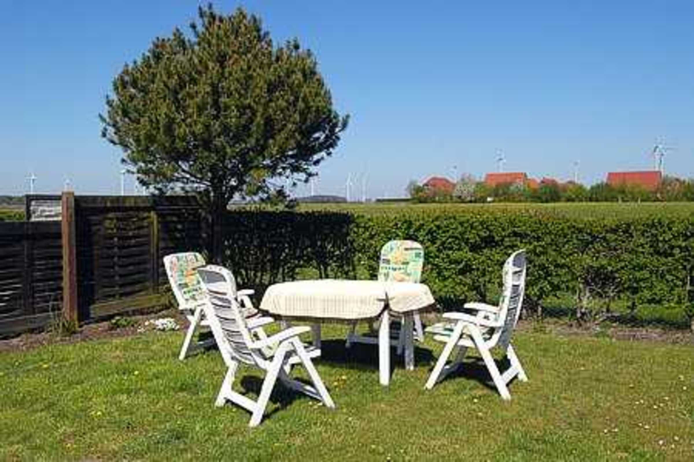 Die Wohnung „Ebbe“ im Erdgeschoss hat eine eigene Terrasse. Für die Gäste der Ferienwohnungen „Flut“, „Deich“ und „Frieschen“ sowie die Bewohner des Apartments gibt es mehrere schön gelegene Terrassen beziehungsweise gemütliche Sitzecken, schattig oder in der Sonne, auf dem sehr weitläufigen Grundstück. Das Grundstück ist 2.600 Quadratmeter groß.