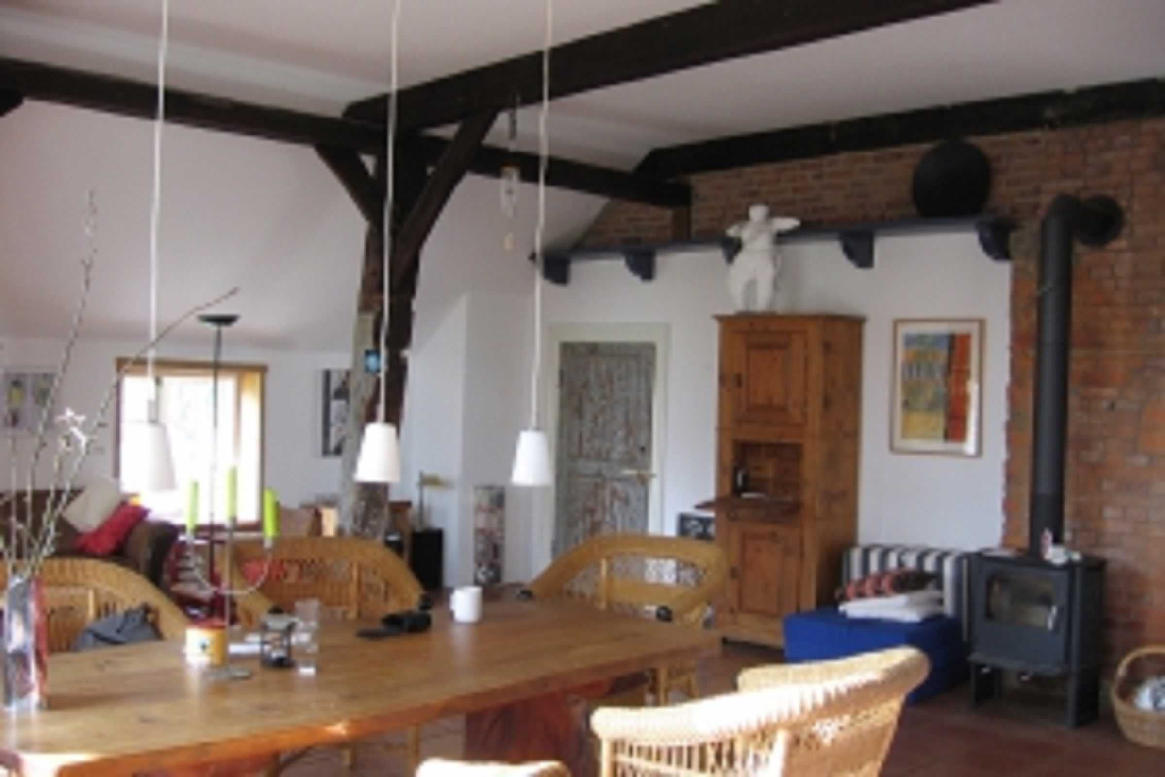 Zur Information Das Reetdach ist z.Zt. mit einer Plane geschützt“ Das Haus ist liebevoll und ziemlich komplett ausgestattet. In Küche und Speisekammer finden Sie außer Tassen, Tellern, Besteck, Schüsseln, Töpfen, Pfannen u. ä. viele Dinge, die das Leben schöner machen sowie einige kleine Haushaltshelfer, die das Leben manchmal erleichtern. Selbstverständlich gibt es diverse Gläser, die im Wohnraum im Schrank neben dem Ofen zu finden sind. Kinder sind willkommen, für sie gibt es im Bad entsprechende „Helferlein“, wie auch einen Hochstuhl, Malzeug, Spiele,  Kinderbücher und ein Reisebett. Für Allergiker stelle ich entsprechende Bettdecken und Kissen zur Verfügung. Beheizt wird das Haus mit Gas, alternativ mit Holz im gusseisernen Kaminofen. Im Atelier ist keine Heizung, es ist jedoch oft wärmer als das Haus (im Winter ist es jedoch nicht nutzbar). Ich beziehe Ökostrom der Firma Naturstrom. Zwei Hinweise noch: die Türen sind relativ niedrig!!! Und: viele der Bilder im Haus und Atelier sind von mir, da ich auch Künstlerin bin. Von meinen MieterInnen wünsche ich mir, dass sie so viel Gefallen und Freude an allen Dingen finden, dass sie damit sorgsam und liebevoll umgehen.