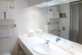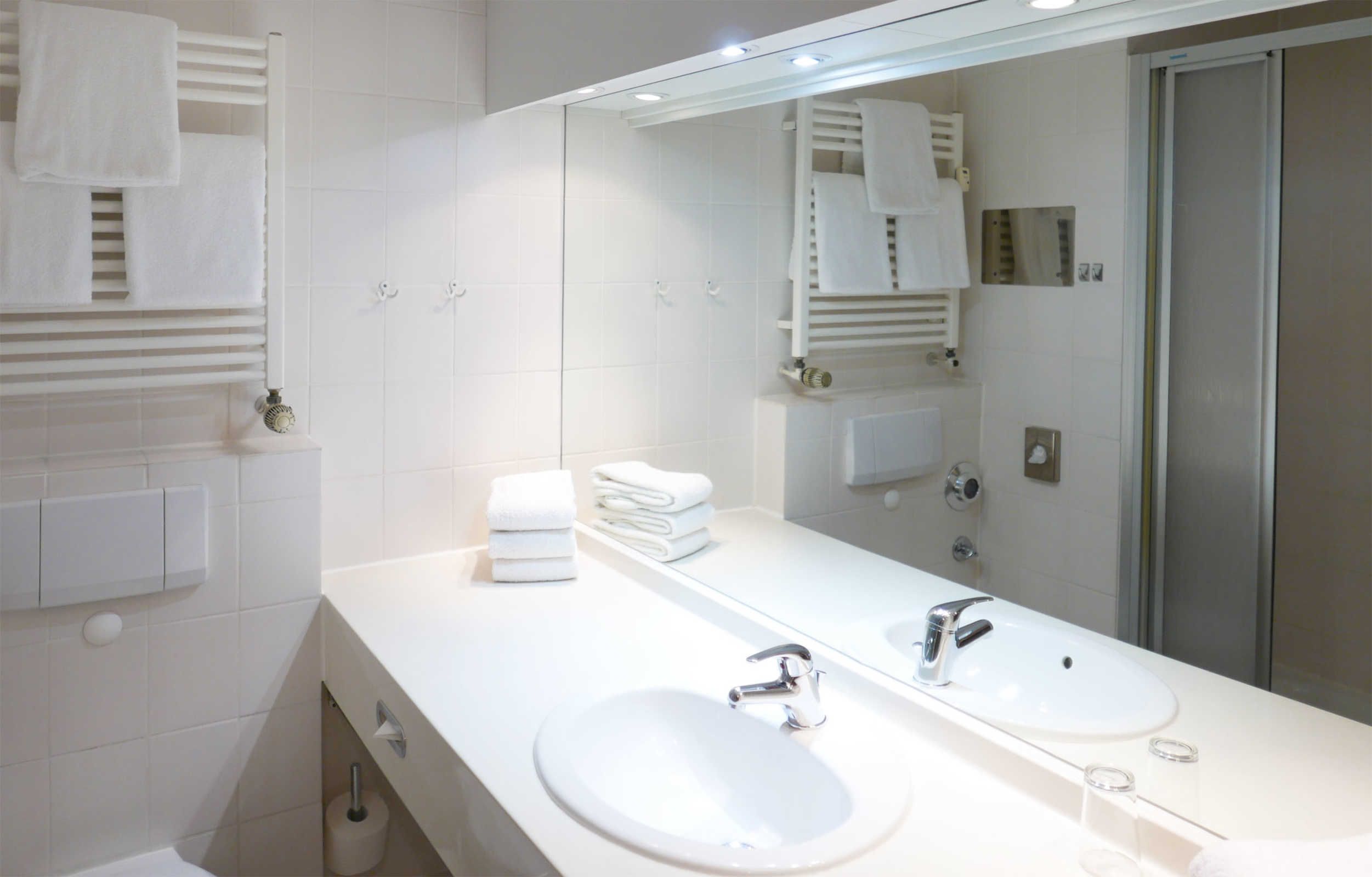 Das Badezimmer verfügt über eine Toilette, eine Dusche sowie einen äußerst großzügigen Waschtisch.