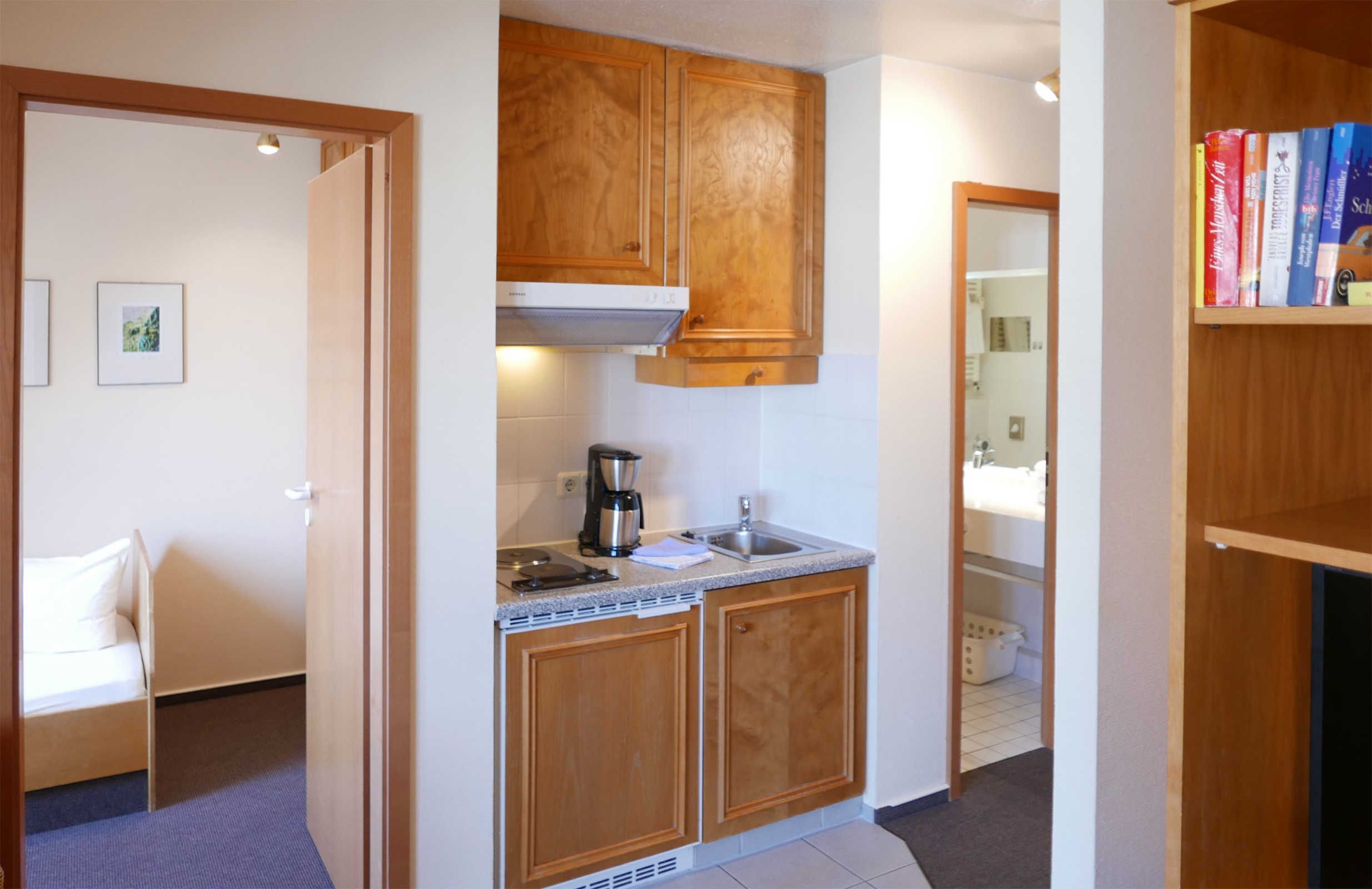 Charmante 2-Zimmer-Ferienwohnung für 2 Erwachsene und 1 Kind in bester Lage auf Juist. Eine gemütliche Sitzecke lädt zum Verweilen und Entspannen ein; an dem Essplatz kann bequem gespeist oder der ein oder andere Spieleabend verlebt werden kann. Optisch abgetrennt durch eine Schrankwand befindet sich in dem Raum ebenfalls das Doppelbett. In der kleinen Küchenzeile finden Sie einen 2-Plattenherd, Kühlschrank, Kaffeemaschine, Wasserkocher und Toaster.