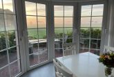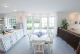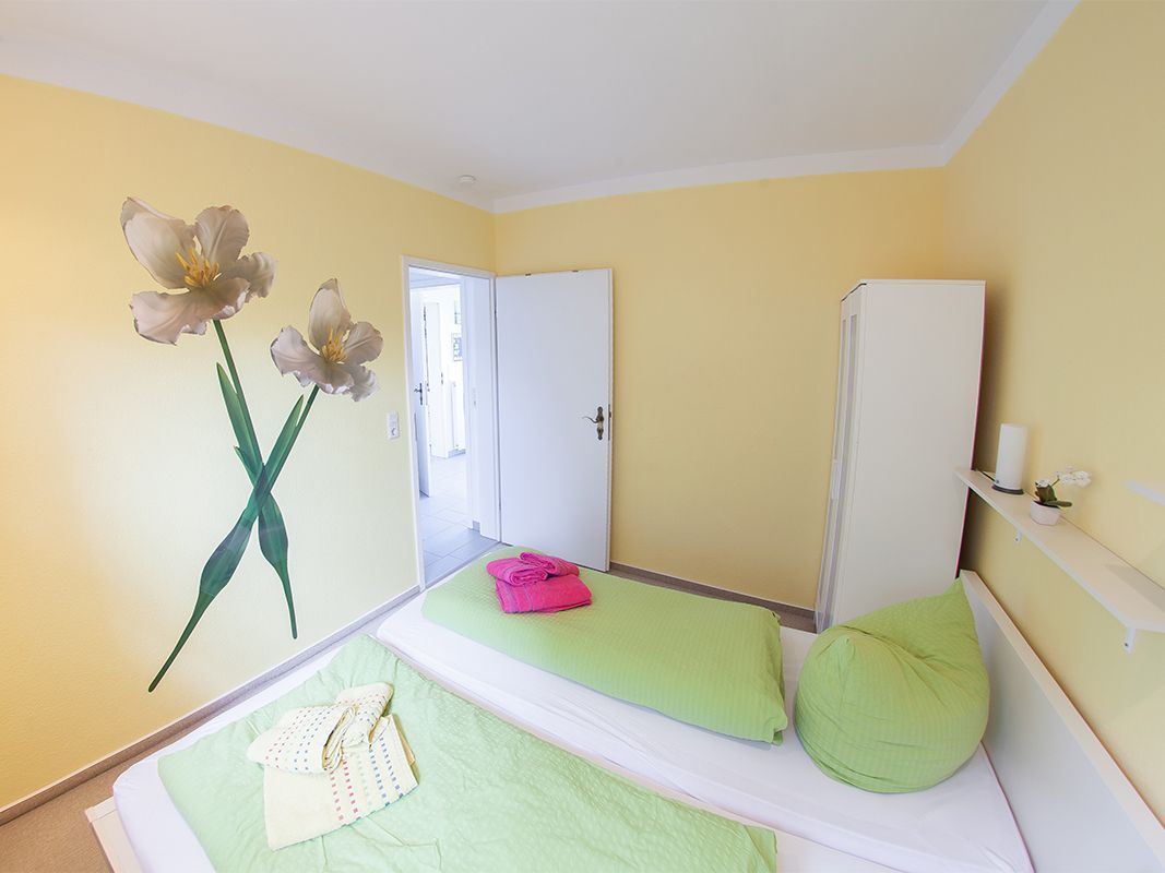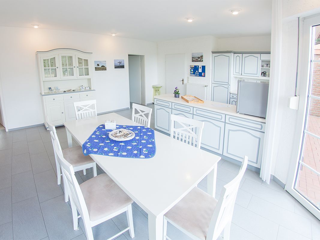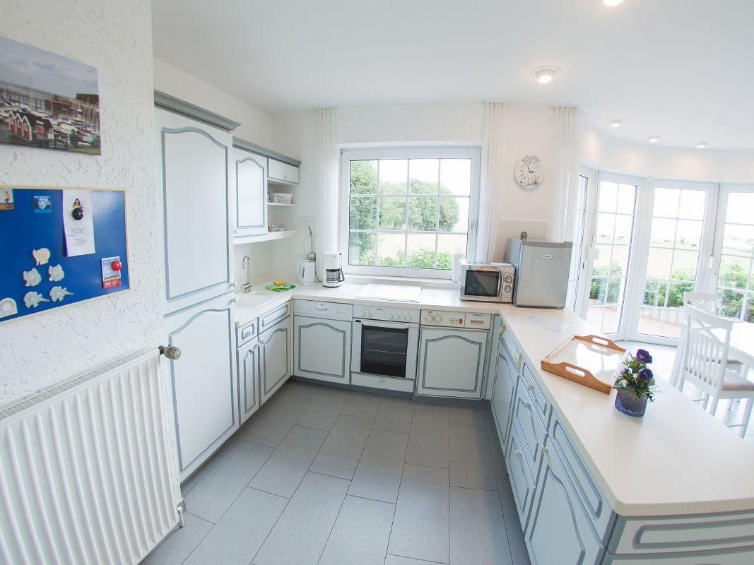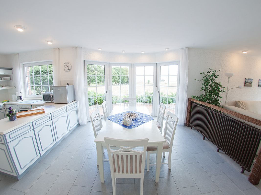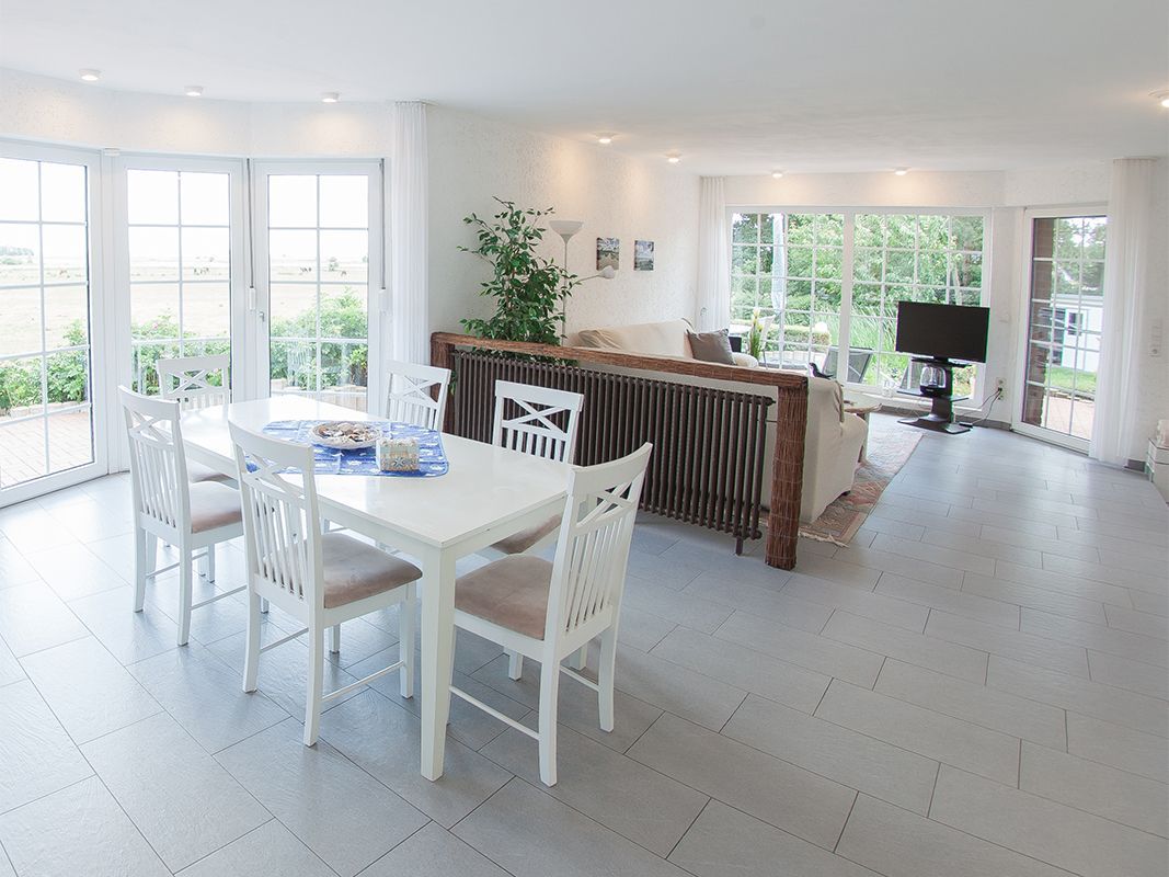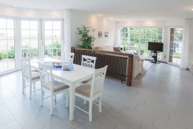 Die Ferienwohnung Fernblick erstreckt sich sich über das gesamte Erdgeschoss des Hauses und verfügt über einen lichtdurchfluteten Wohn- und Essbereich sowie eine integrierte Küchenzeile mit allem, was man für entspanntes Kochen braucht. Bis zu vier Personen fühlen sich hier sofort wohl.