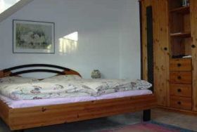 Gemütliche Ferienwohnung, 1. Etage, teils schräge Wände, 1 Elternschlafzimmer, 1 Kinderzimmer mit Etagenbett, keine Fahrräder.