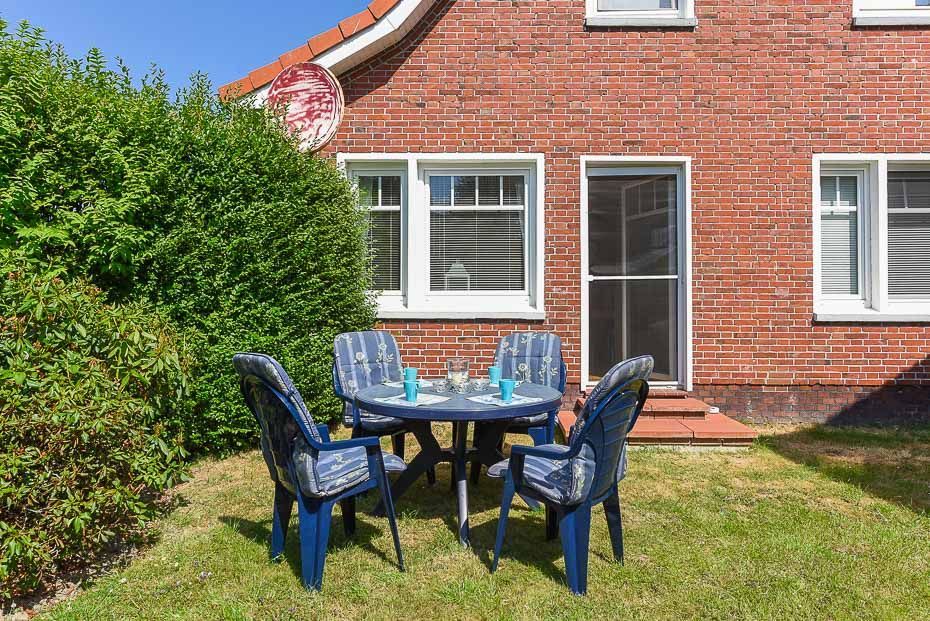 Hinter dem „Haus Kap Horn“ gibt es einen großen Garten mit viel Platz zum Abschalten und Erholen und vor dem Haus ist eine weitere schöne Sitzecke für die Ferienwohnung im Obergeschoss.