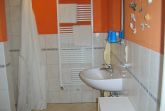 Sanitär: bodenebene Dusche, Föhn, Handtuchheizkörper.