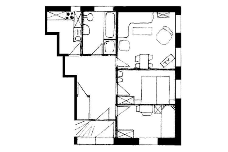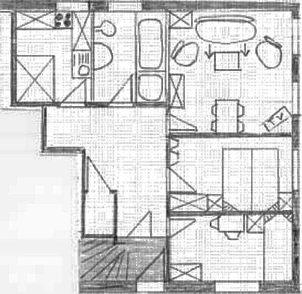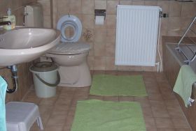 1 Schlafraum (1gr. Bett von 2,00mx0,90m, oder Aufstellung von 2.gr.Bett und1Babybett .1 Wohnraum mit Eßplatz, 1 separate Küche, 1 Badezimmer mit Dusche und Wanne.