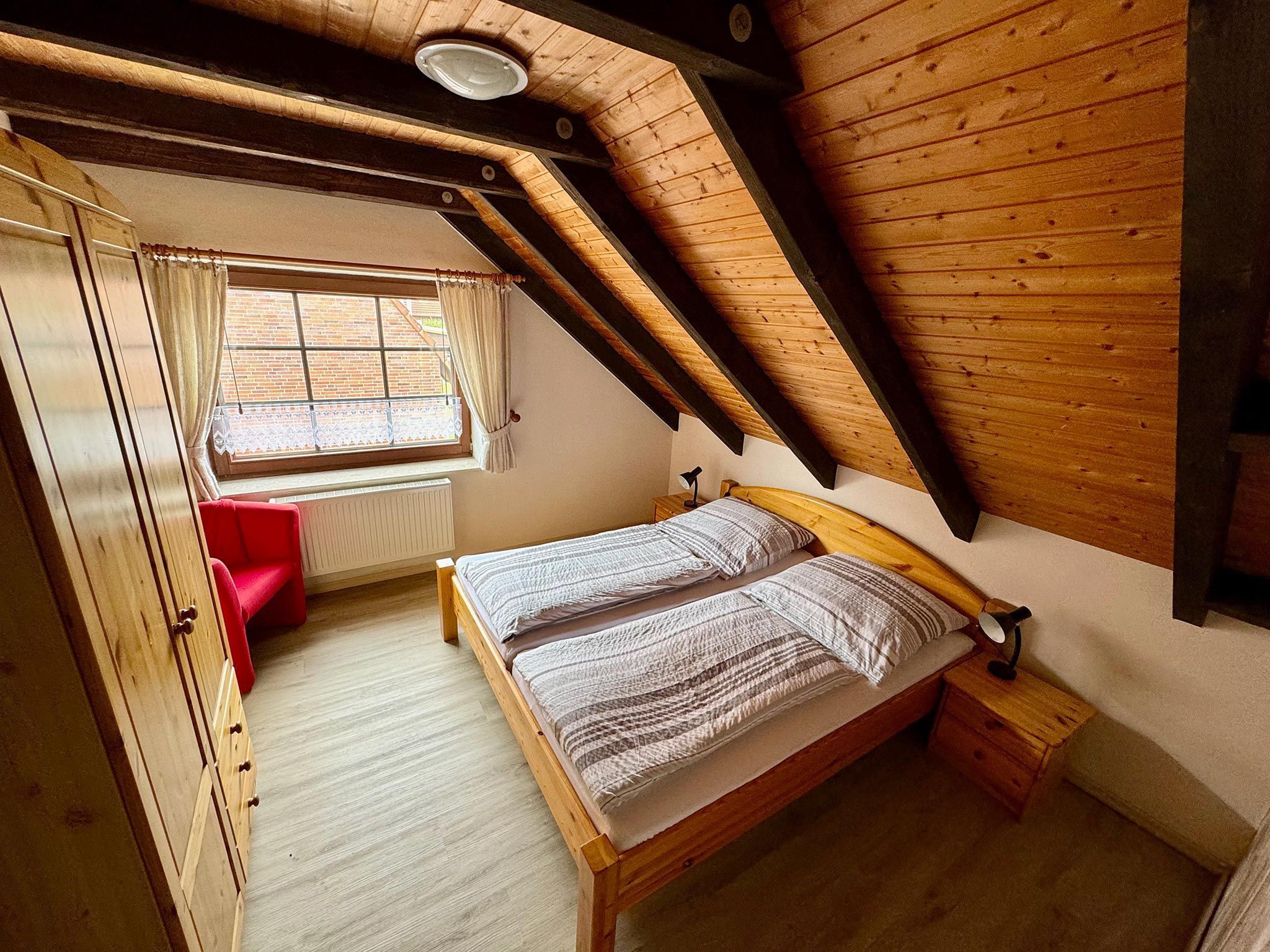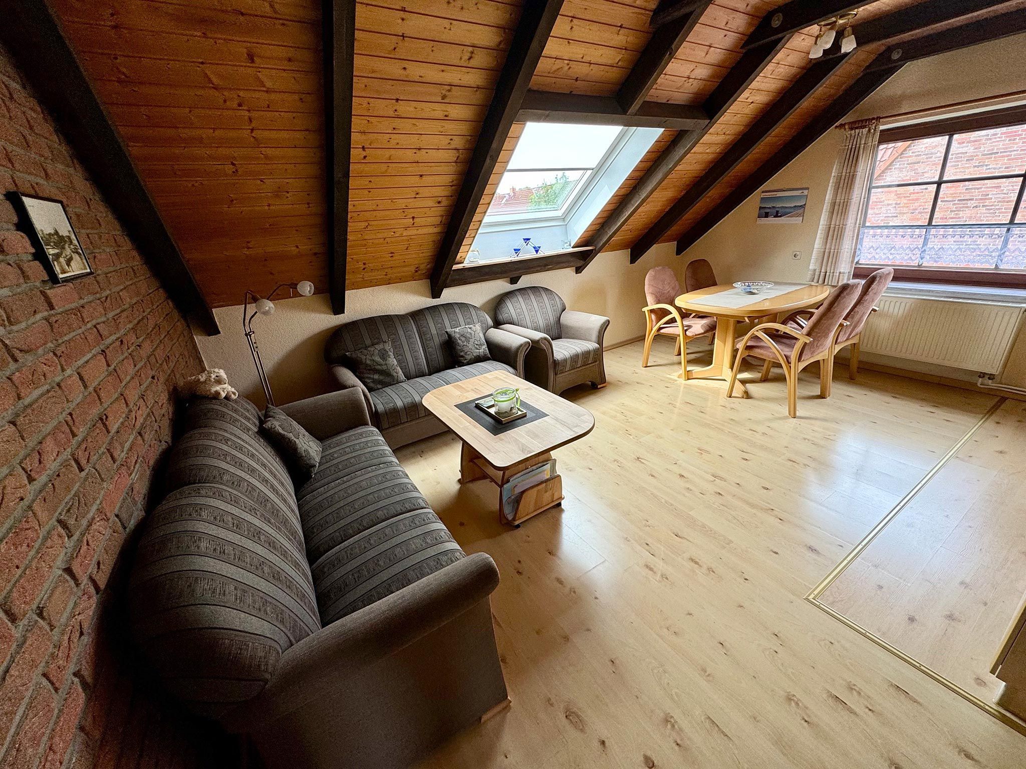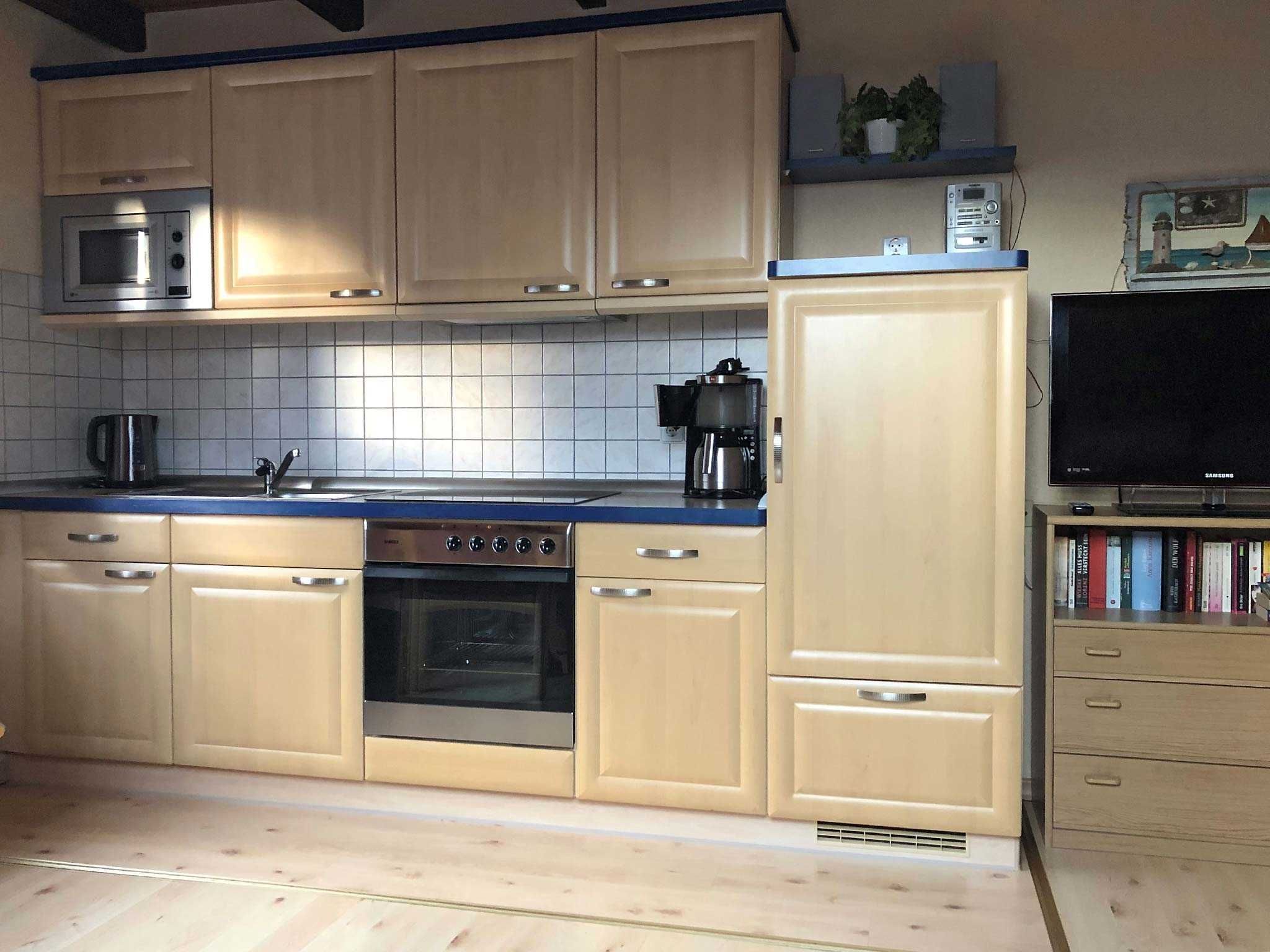 Hell und freundlich eingerichtete Oberwohnung für 4 Personen und ein Kleinkind. Die Wohnung besteht aus 1 Schlafzimmer mit Doppelbett, Kinderbett zustellbar, 1 Schlafzimmer mit zwei Einzelbetten. Komplett eingerichtete Wohnküche mit Backofen. Bad und Wohnzimmer mit Fußbodenheizung. Gartenterrasse mit Gartenmöbeln und Strandkorb.