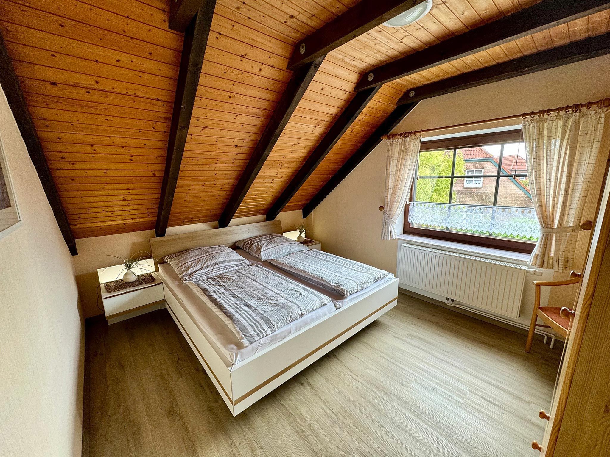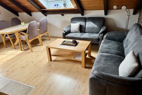 Hell und freundlich eingerichtete Oberwohnung für 4 Personen und ein Kleinkind. Die Wohnung besteht aus 1 Schlafzimmer mit Doppelbett, Kinderbett zustellbar, 1 Schlafzimmer mit zwei Einzelbetten. Komplett eingerichtete Wohnküche mit Backofen. Bad und Wohnzimmer mit Fußbodenheizung. Gartenterrasse mit Gartenmöbeln und Strandkorb.