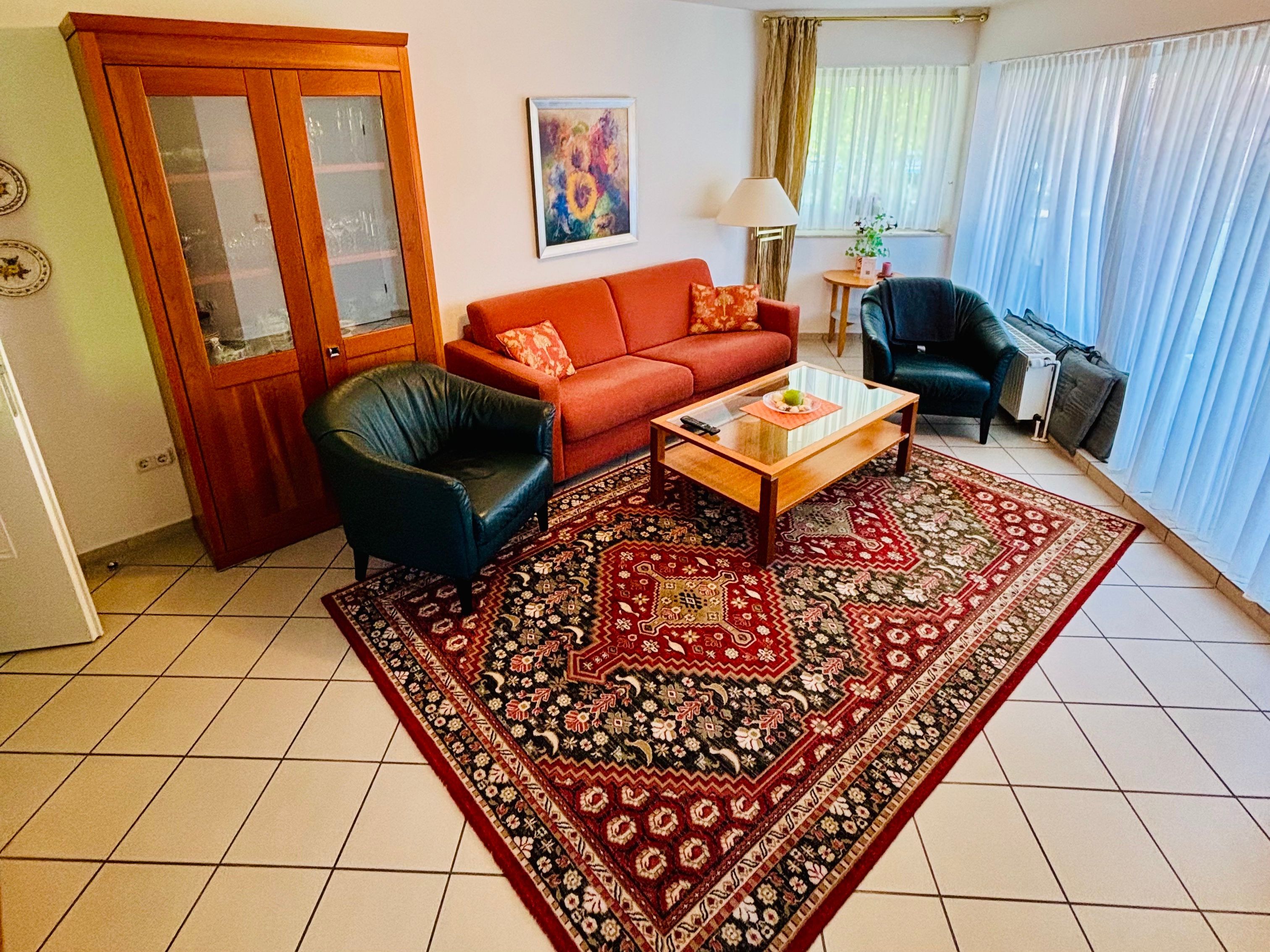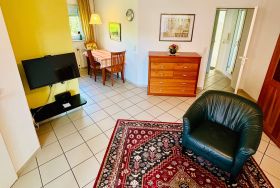 Herzlich willkommen in unserer stilvoll eingerichteten 50qm großen Ferienwohnung! Diese einladende Unterkunft bietet einen großzügigen Wohnraum mit moderner Küchenzeile und gemütlichem Essbereich, sowie ein separates Schlafzimmer mit einem komfortablen Boxspringbett. Vom Wohnzimmer aus gelangen Sie auf den überdachten Balkon, der perfekt für entspannte Stunden im Freien geeignet ist. Das Bad ist mit WC und Dusche ausgestattet, und ein kleiner Flur mit Garderobe vervollständigt das Raumangebot.