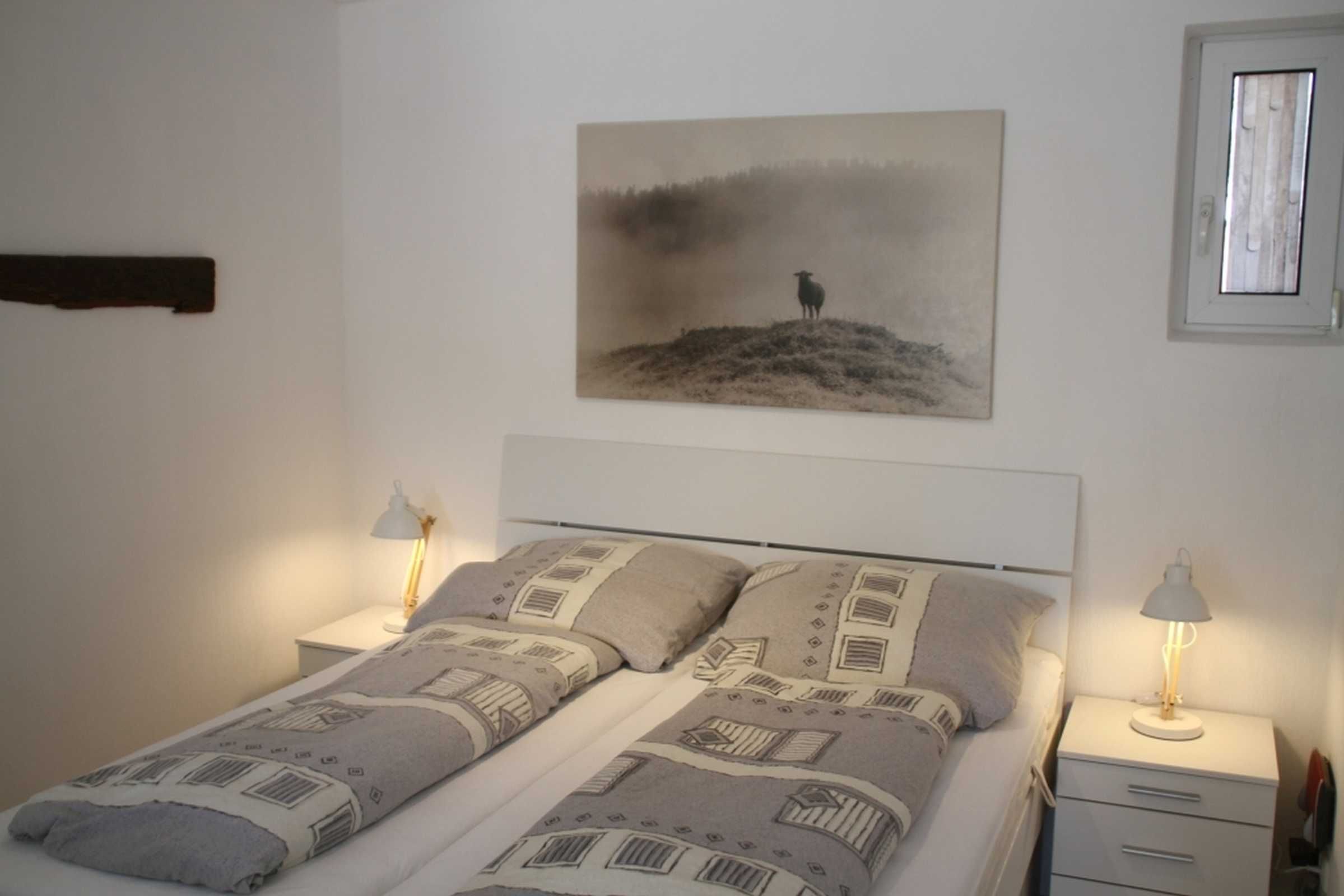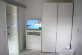 Der separate Schlafraum verfügt über ein 1,40 m breites Bett und ebenfalls einen Flachbildfernseher mit Smart TV und Amazon Fire TV. Für genügend Stauraum sorgen Schwebetürenschrank und Kommode, für Zerstreuung sorgen unterschiedlichster Lesestoff, sowie Gesellschaftsspiele oder Puzzles und Malutensilien für die kleineren Gäste.