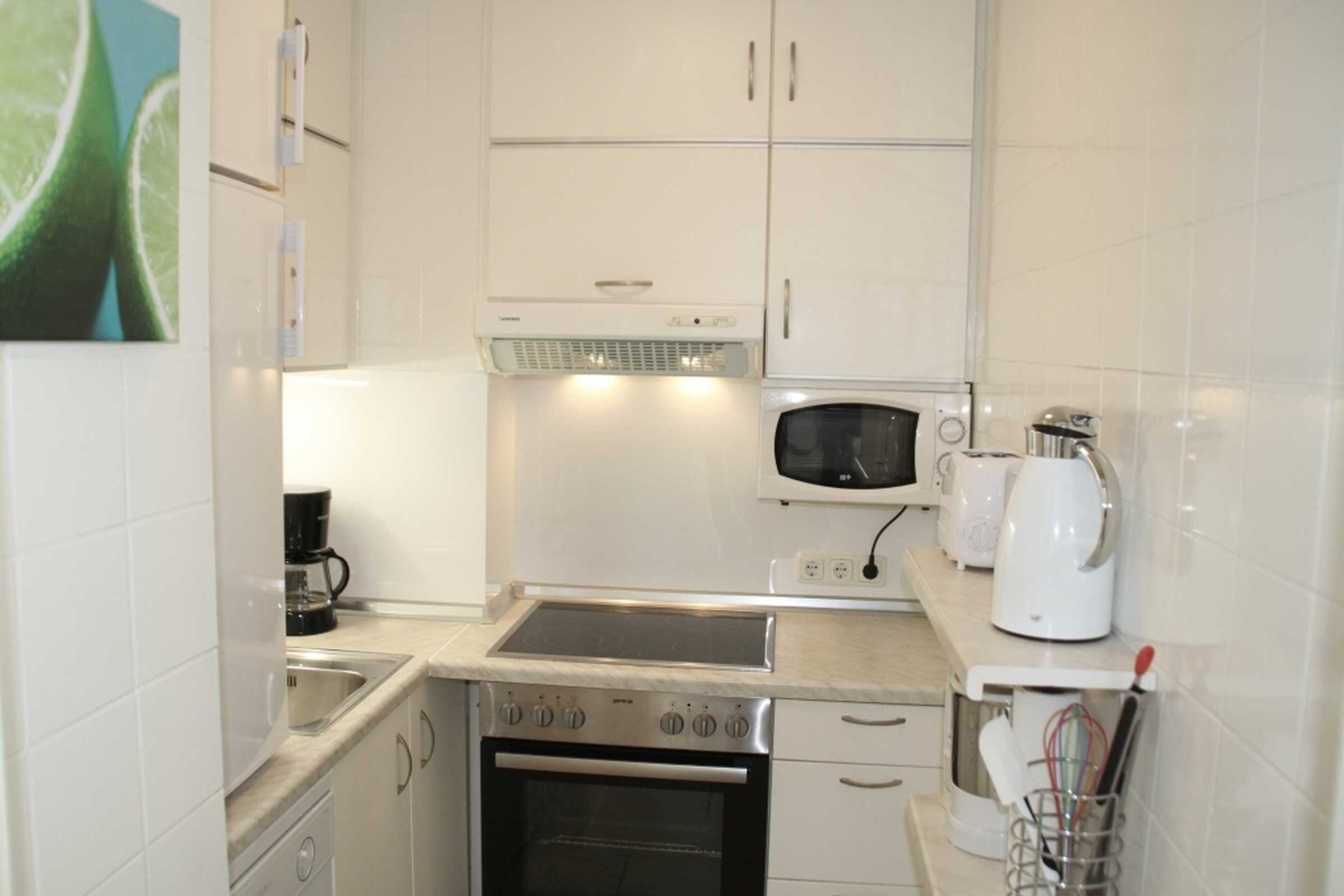 In der komplett ausgestatten Küche finden Sie eine große Kühl-Gefrierkombination, 60 cm Spülmaschine, vier Kochzonen Ceranfeld, Backofen, Mikrowelle, Kaffeemaschine, Wasserkocher, Eierkocher und Toaster.