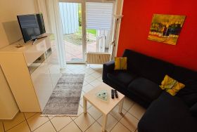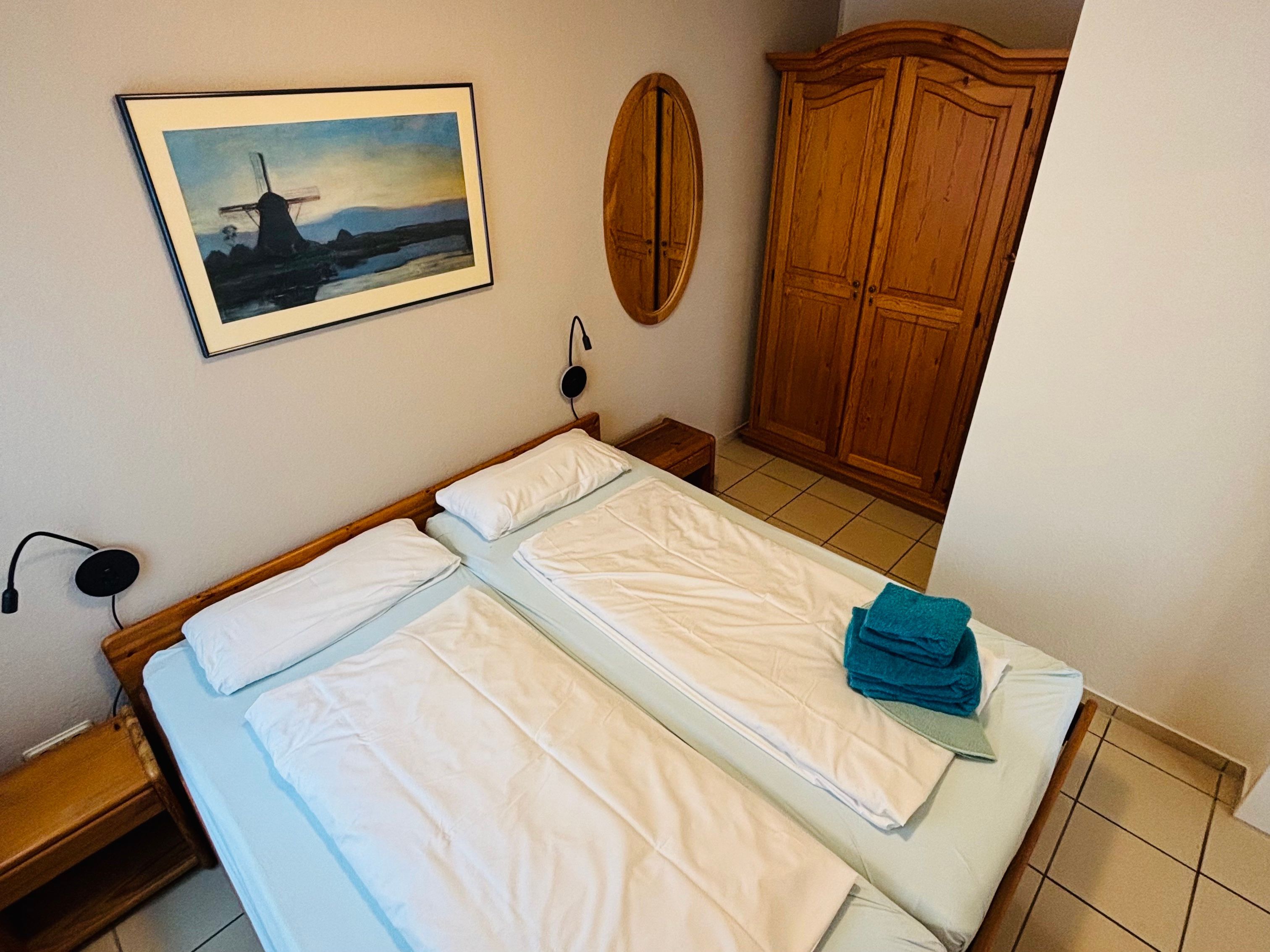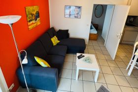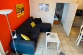 Die Wohnung ist aufgeteilt in einen gemütlichen Wohn- und Essbereich mit integrierter Küchenzeile, ausgestattet mit Ceranfeld, Kaffeemaschine und Toaster. Ein großes Sofa lädt zum Entspannen ein. Das separate Schlafzimmer mit Doppelbett sorgt für erholsame Nächte. Ein modernes Badezimmer mit Dusche und WC ergänzt die Ausstattung.