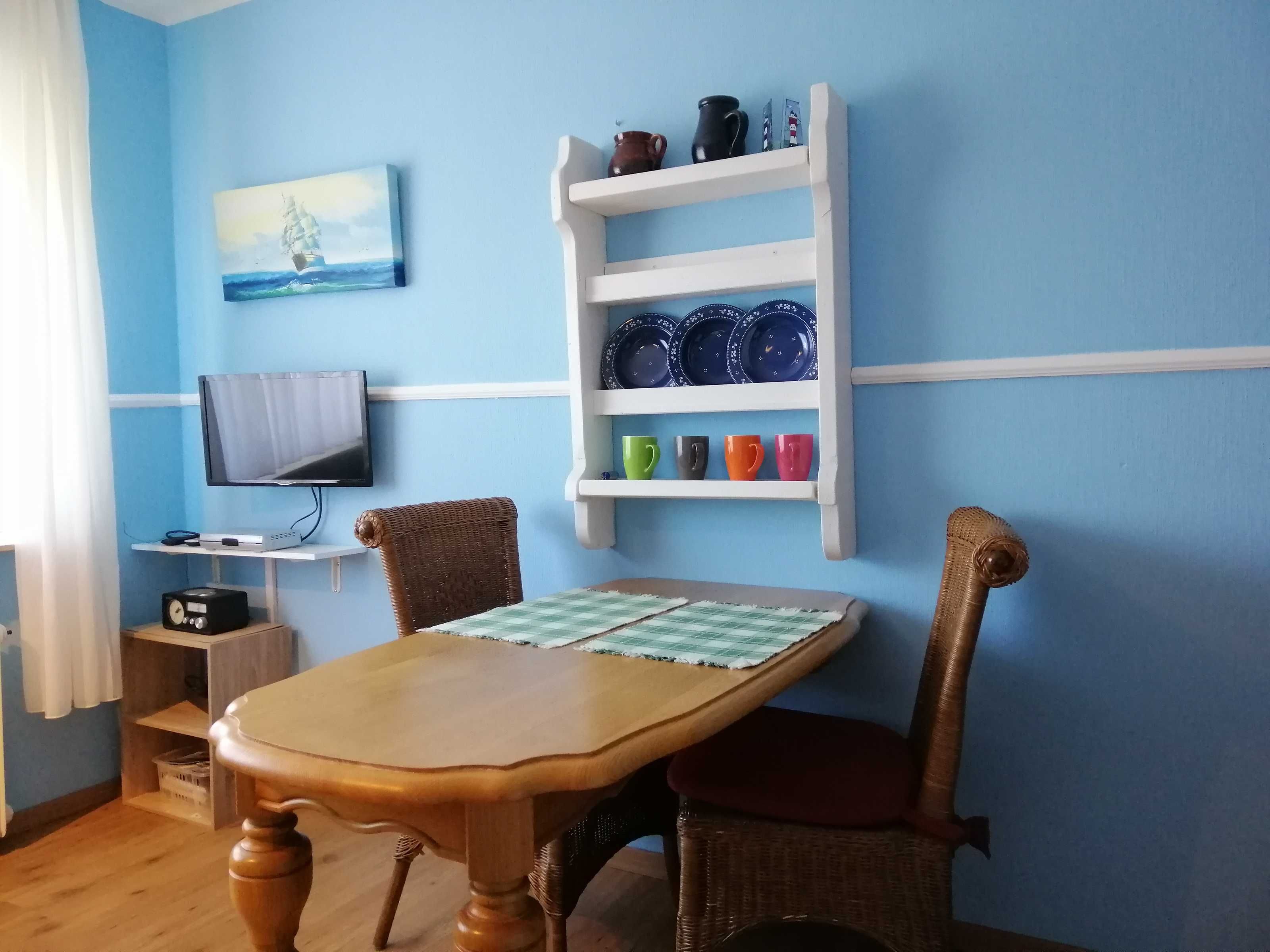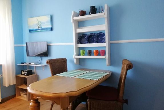 Die ebenerdige liebevoll eingereichtete Ferienwohnung Seestern verfügt über ein Schlafzimmer mit Doppelbett sowie ein kombiniertes Wohn-Schlafzimmer mit Schlafsofa, Essplatz und offener Küche.