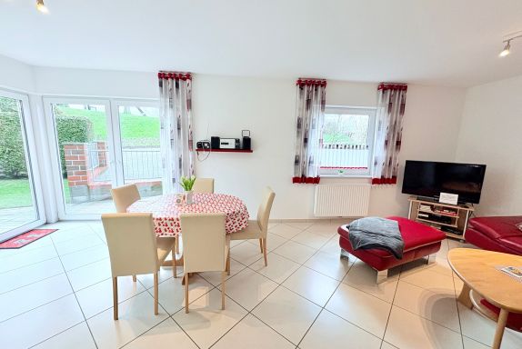 Willkommen in der Ferienwohnung Strandgras im Strandweg! Diese gepflegte Wohnung im Parterre bietet Ihnen einen erholsamen Aufenthalt. Die Wohnung verfügt über eine geräumige Wohnküche mit Essbereich und Zugang zur Terrasse, ideal für gesellige Mahlzeiten im Freien.