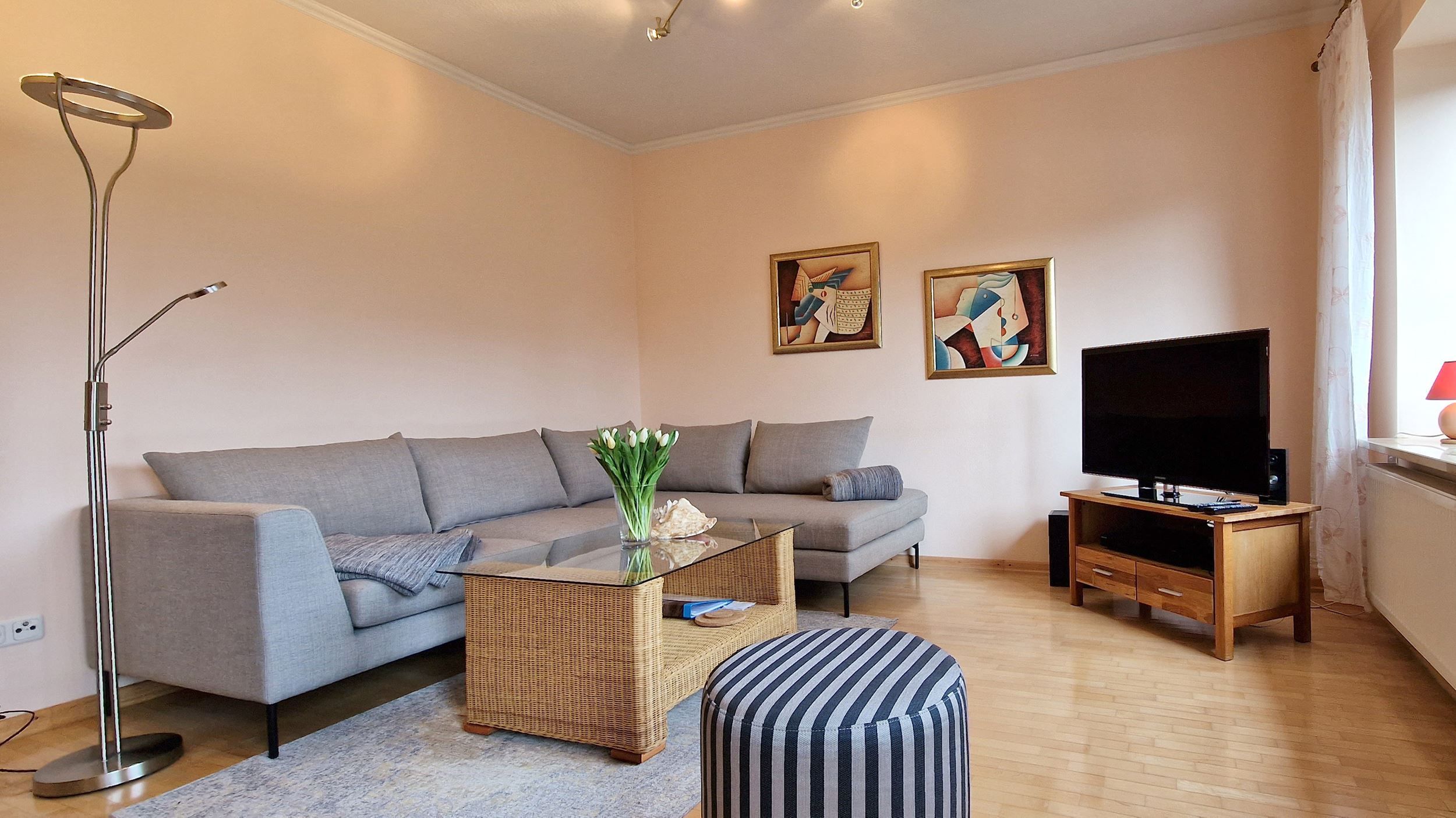 Die Wohnung Sand ist eine gemütliche 3 Zimmer-Wohnung für 4 Personen, ca. 65 m² groß mit einer großzügigen und schön angelegten Terrasse mit Gartenmöbeln, einer Gartenbank und einem Strandkorb. Diese Terrasse bietet die meisten Sonnenstunden und ist für Sonnenanbeter genau richtig. Wer es hier nicht aushält, verzieht sich auf die andere Seite des Hauses, denn dort gibt es eine zweite kleine Terrasse, die ab mittags im Schatten liegt. Im EG befindet sich das Wohn- und Esszimmer mit einem gemütlichen Wohnbereich und einem Esstisch, der bis zu 8 Sitzplätze bietet. Ebenfalls im EG untergebracht ist eine separate und komplett und gut eingerichtete Küche sowie ein Duschbad. Im Flur unter der Treppe steht eine Waschmaschine zu Ihrer Verfügung. Im OG finden Sie ein Schlafzimmer mit einem Doppelbett und ein kleines Schlafzimmer mit einem Einzelbett und einer Schlafcouch. In einer Gartenhütte gibt es eine Stellmöglichkeit für eigene Fahrräder. W-LAN, Nichtraucherdomizil.