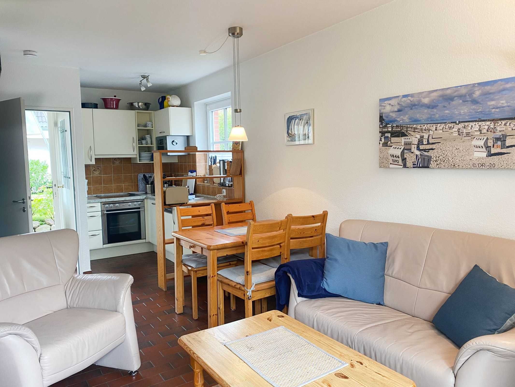 Ruhig und trotzdem Mittendrin in bester Lage in St. Peter Dorf ! Das helle Ferienhaus Magisterhof Nr. 1 mit seinen 50 qm hat Platz für 3 Personen mit bis zu 2 Hunden. Im Erdgeschoss befindet sich das Wohnzimmer mit direktem Zugang zur Terrasse mit Strandkorb in Ostlage, eine gut ausgestattete, offene Küche, ein kleiner Abstell- bzw. Vorratsraum und der Eingangsflur mit einer Treppe ins OG. In der ersten Etage ein Schlafzimmer mit Doppelbett, ein Schlafzimmer mit einem Einzelbett, sowie das Duschbad mit Fenster. Das Haus hat eine elektrische Fußbodenheizung und eigenes kostenloses WLAN, einen PKW-Stellplatz direkt neben dem Haus, Nr.1. Haustiere sind willkommen. Nichtraucherdomizil. Das Haus ist Teil der Wohnungsanlage Magisterhof mit 12 Häusern. Im Innenhof der großzügigen Wohnanlage befinden sich ein großer Sandkasten mit Rutsche sowie Freiflächen mit Bänken und Rasenflächen.