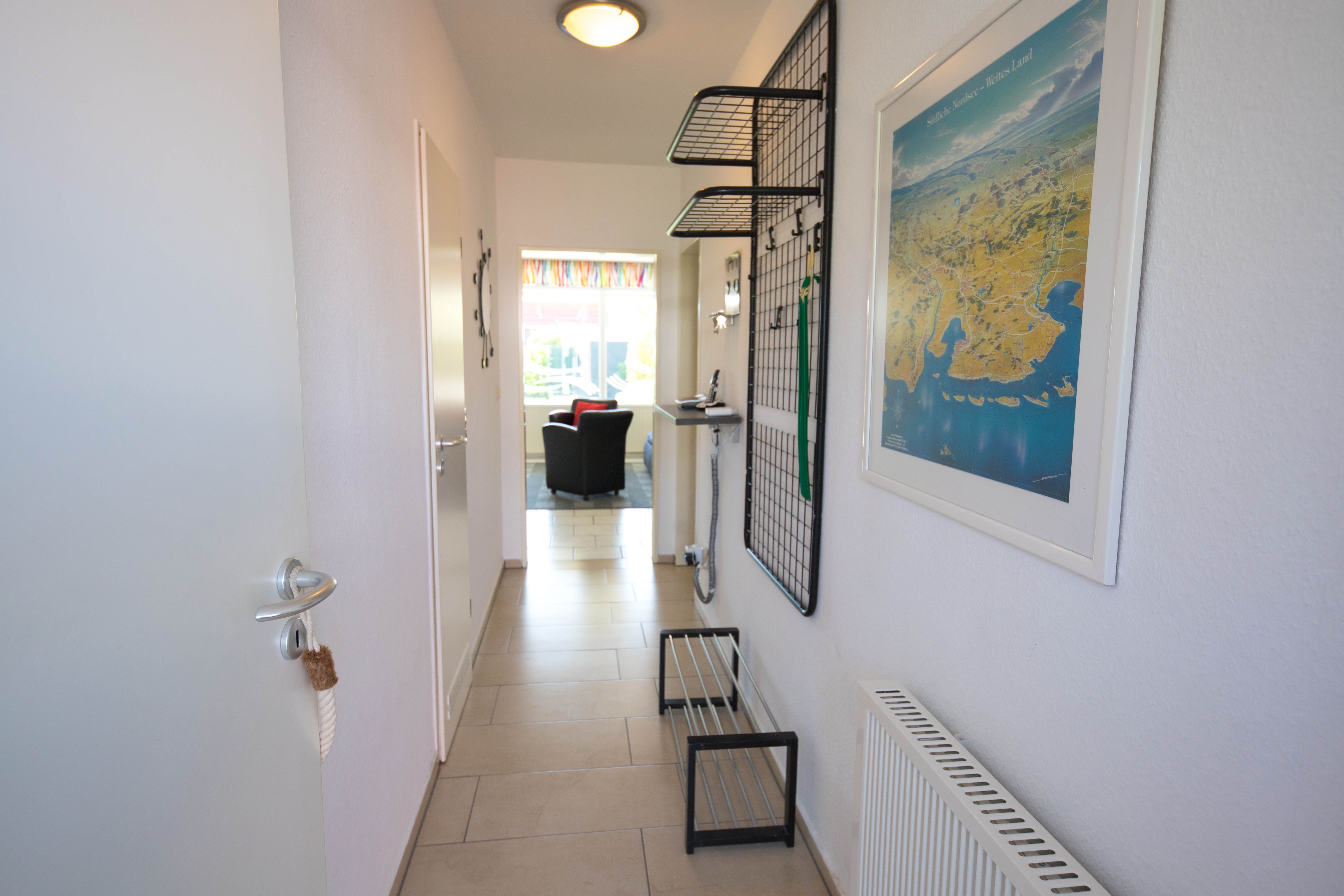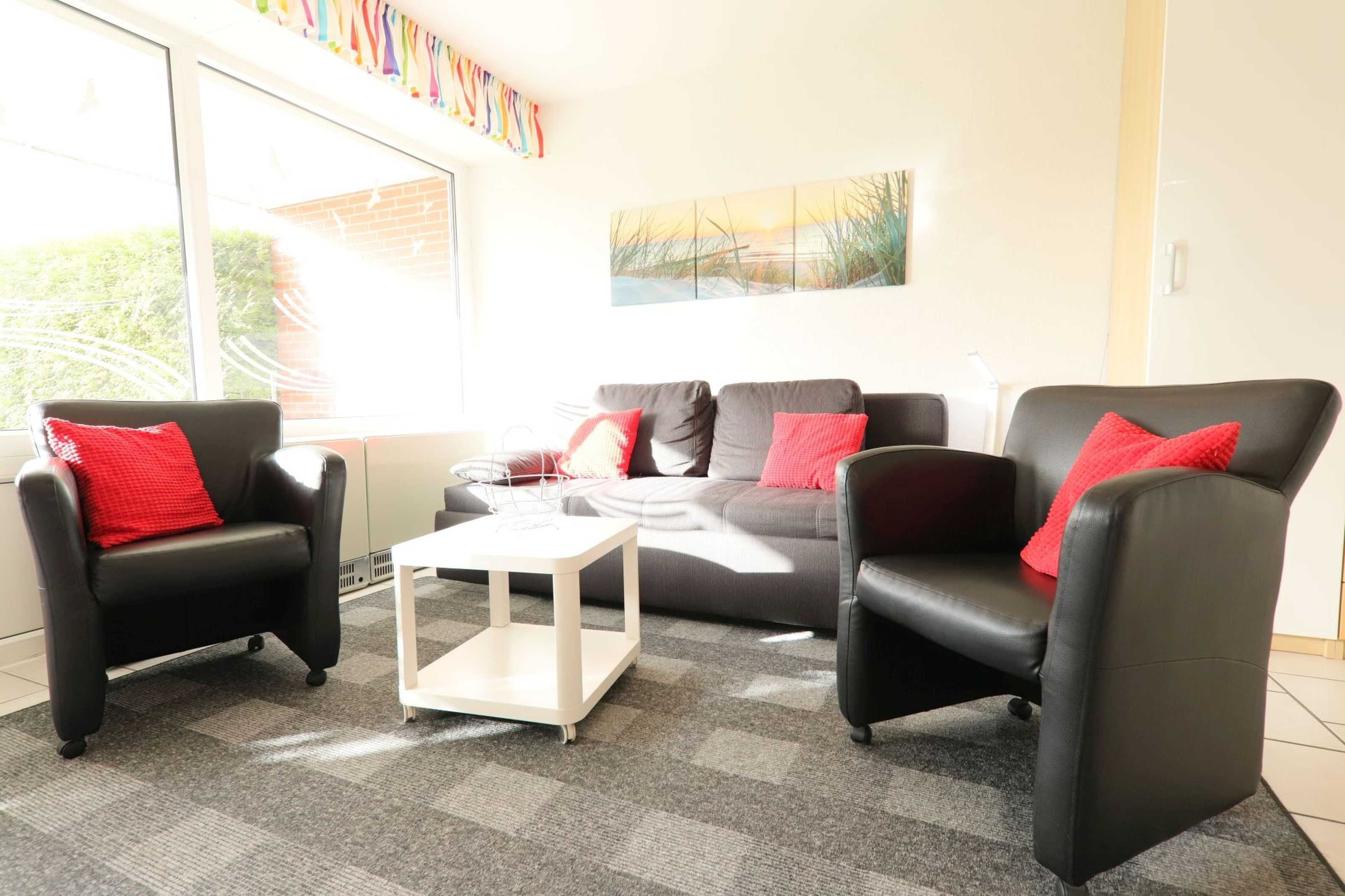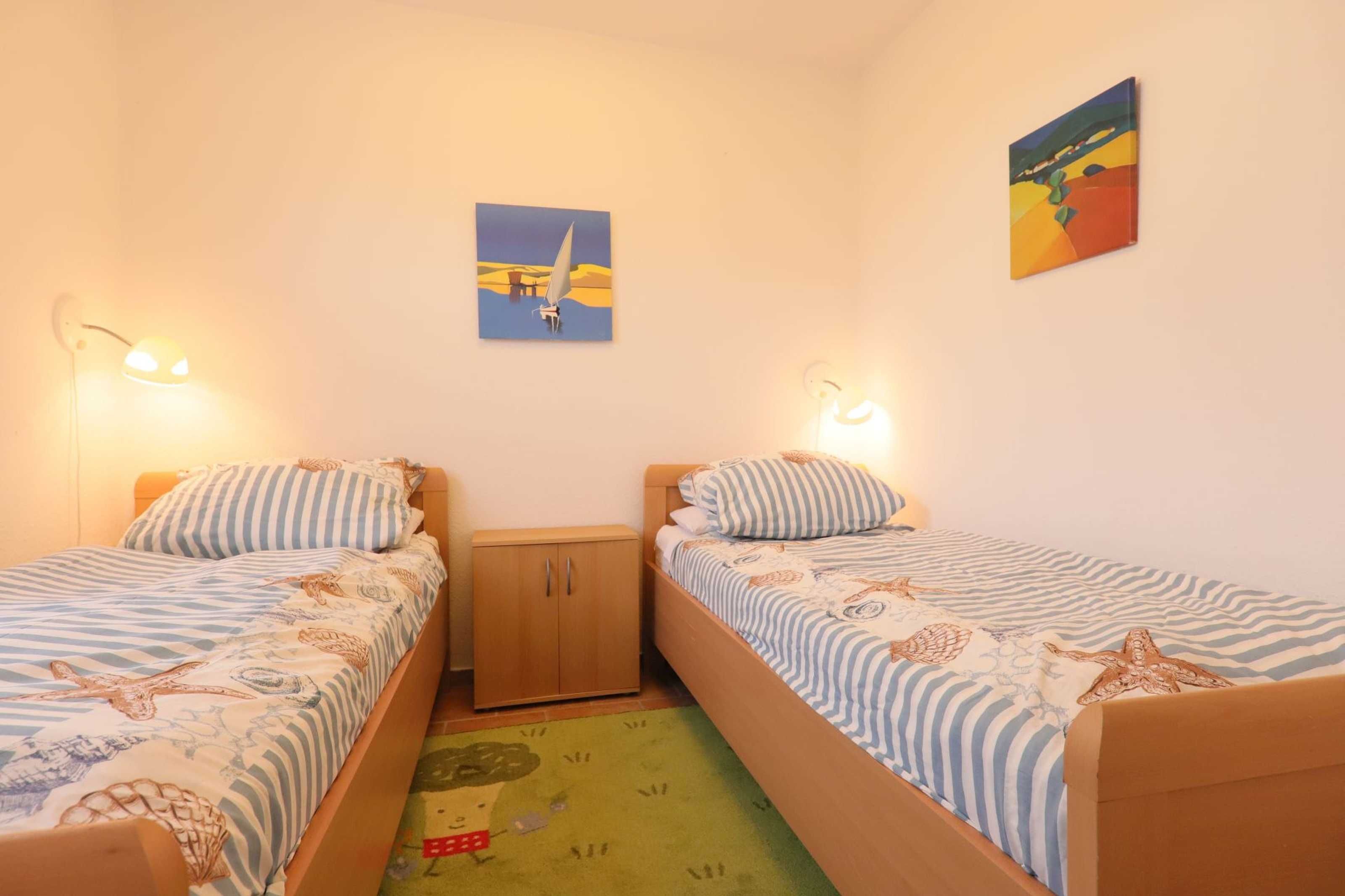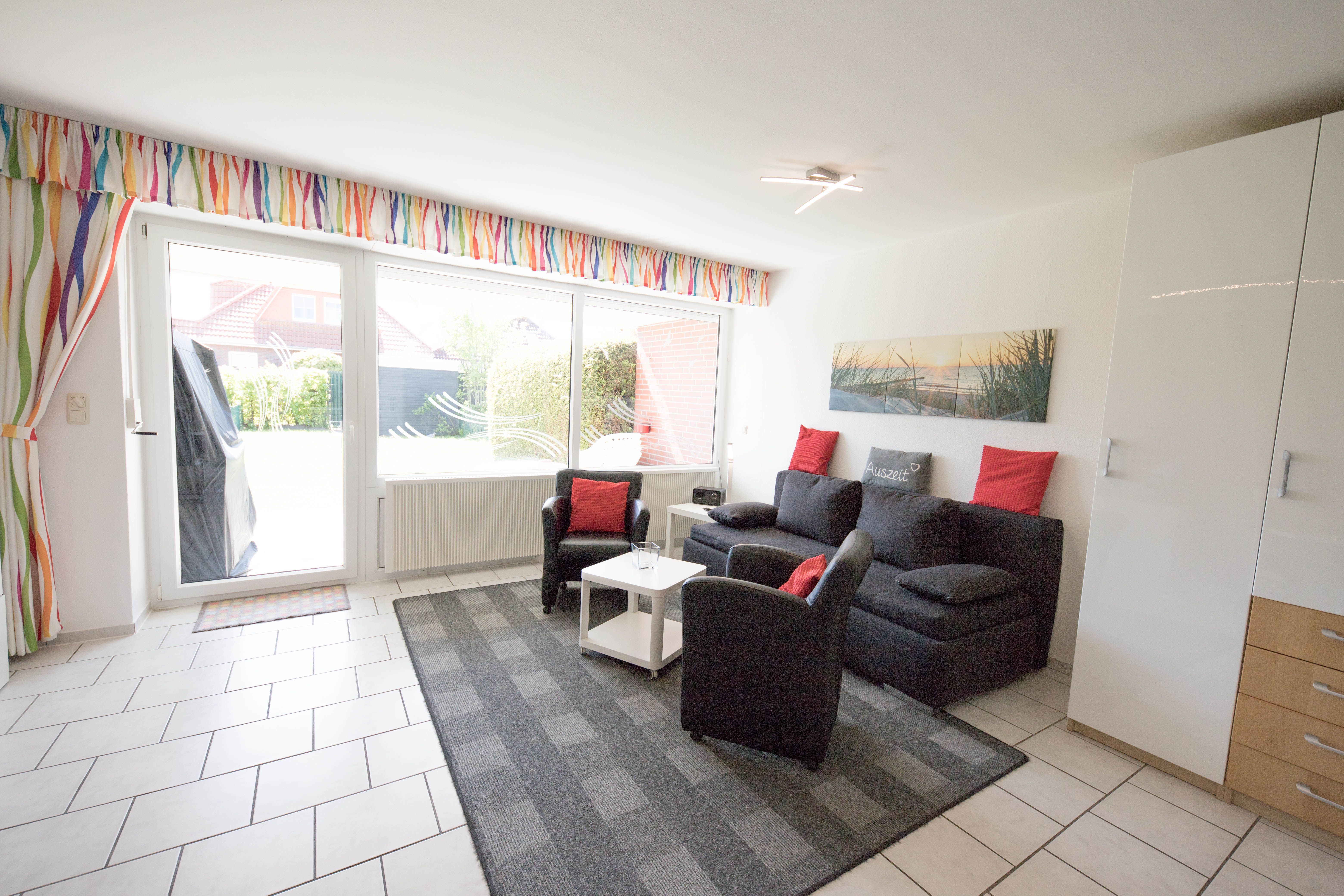 Die ebenerdige Ferienwohnung Strandmuschel verfügt über ein separates Schlafzimmer mit zwei Einzelbetten sowie einer Schlafcouch im Wohnzimmer mit offener Küche und Essplatz. Desweiteren verfügt die Ferienwohnung über ein Badezimmer mit Dusche und einen Abstellraum.