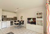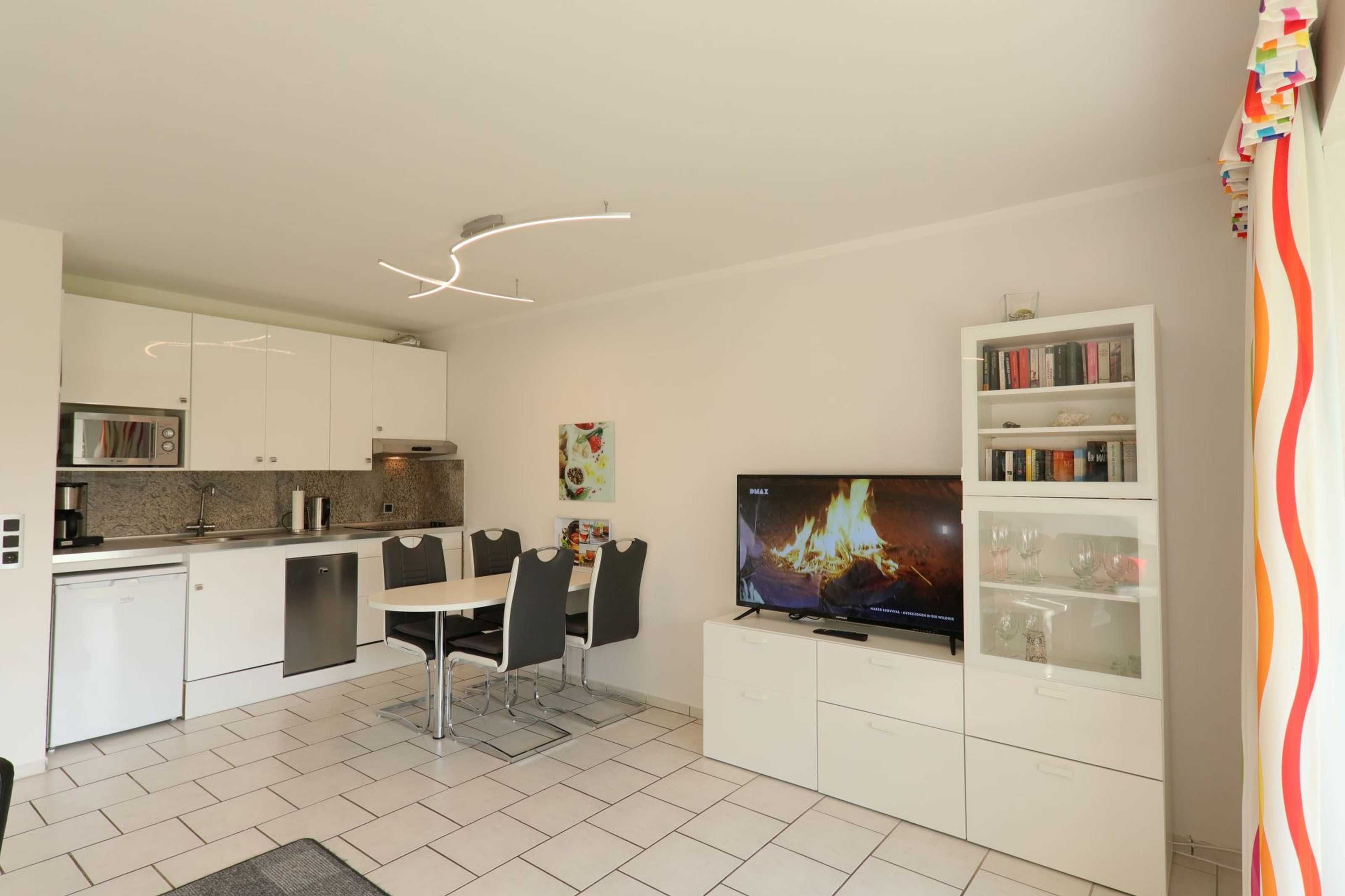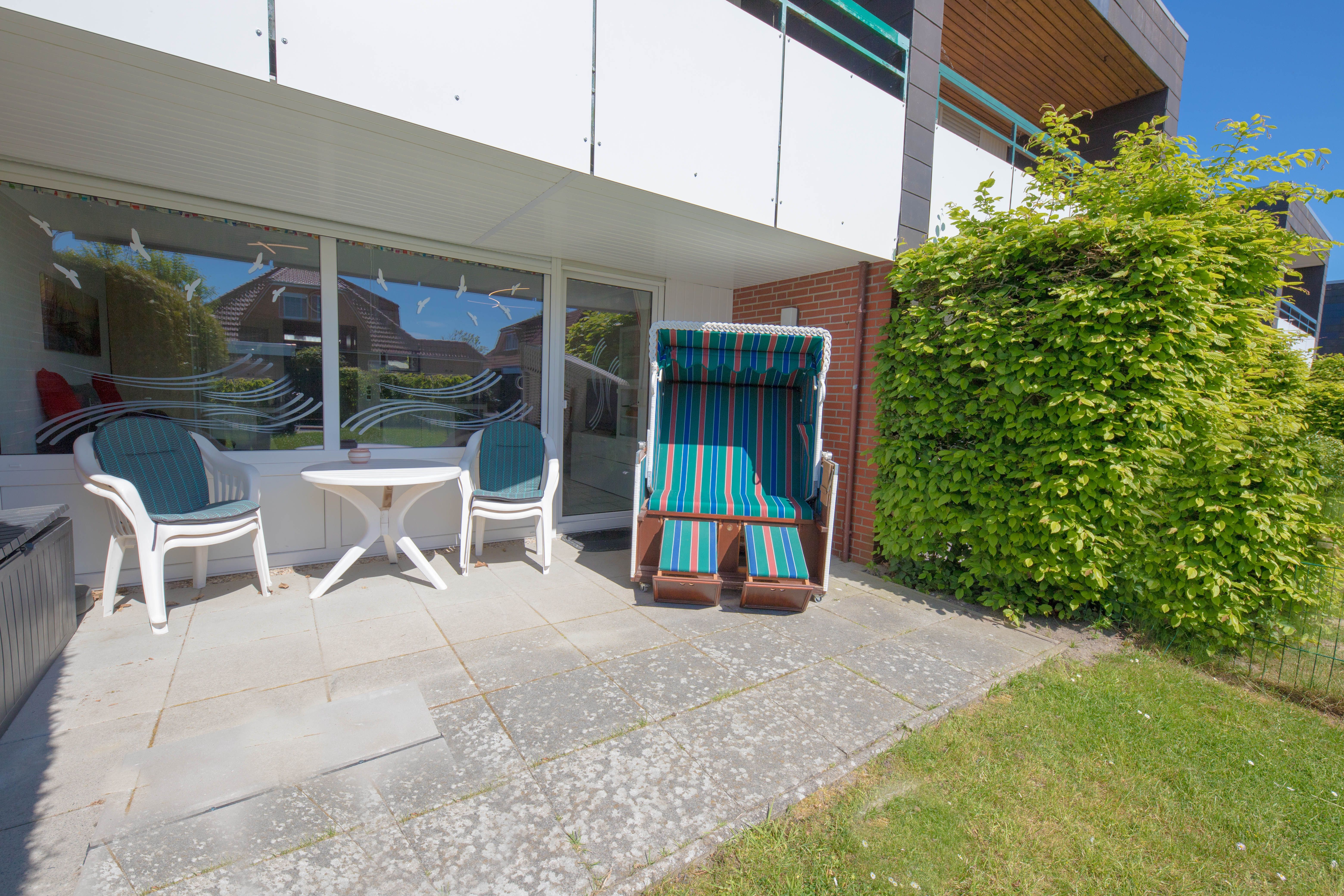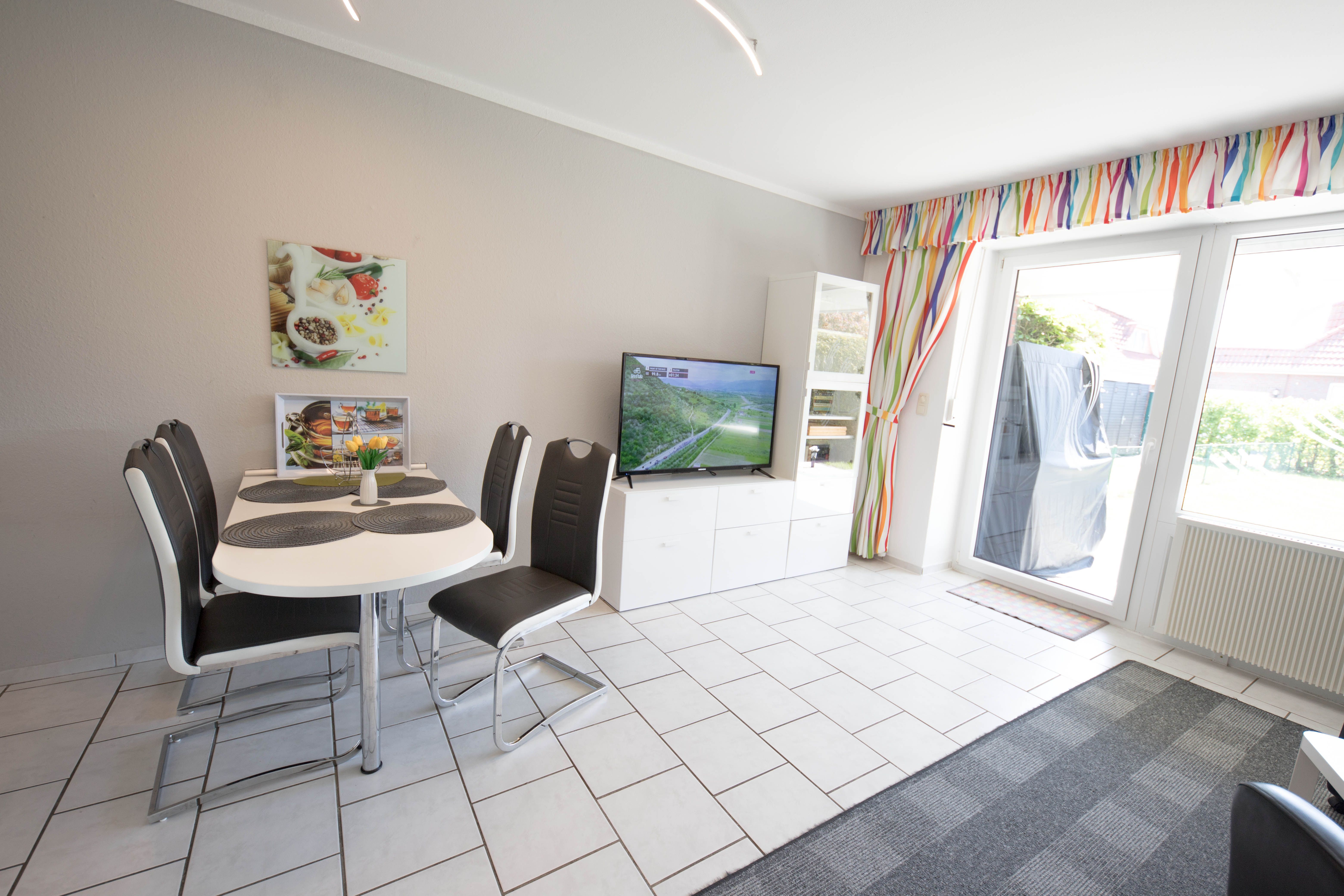 Die ebenerdige Ferienwohnung Strandmuschel verfügt über ein separates Schlafzimmer mit zwei Einzelbetten sowie einer Schlafcouch im Wohnzimmer mit offener Küche und Essplatz. Desweiteren verfügt die Ferienwohnung über ein Badezimmer mit Dusche und einen Abstellraum.