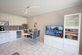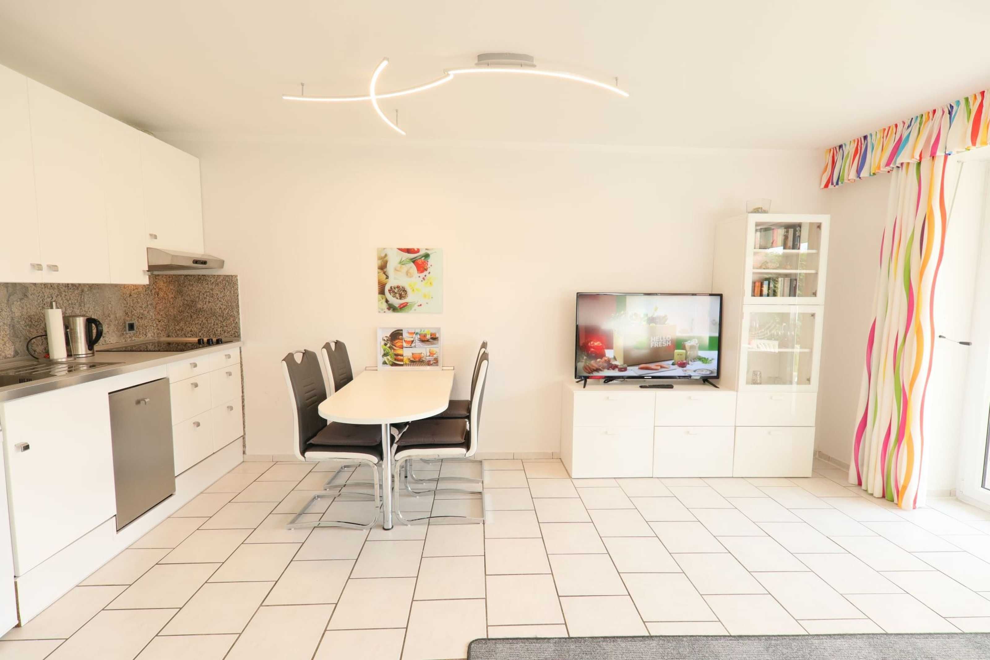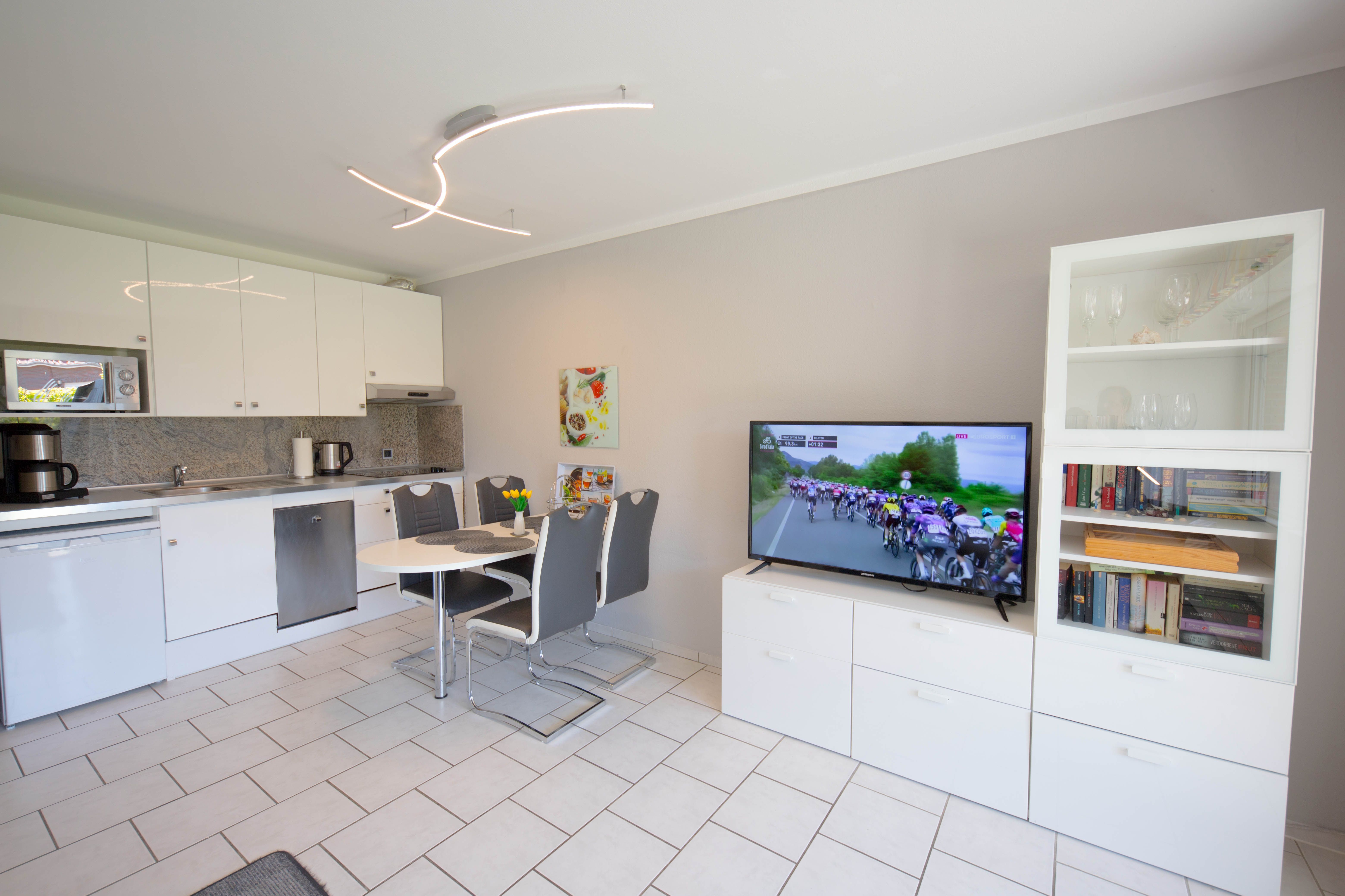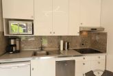 Die Küchenzeile ist mit einer Kaffeemaschine, Toaster, Wasserkocher, einem Geschirrspüler, einer Mikrowelle mit Grillfunktion sowie einem Kochfeld ausgestattet.