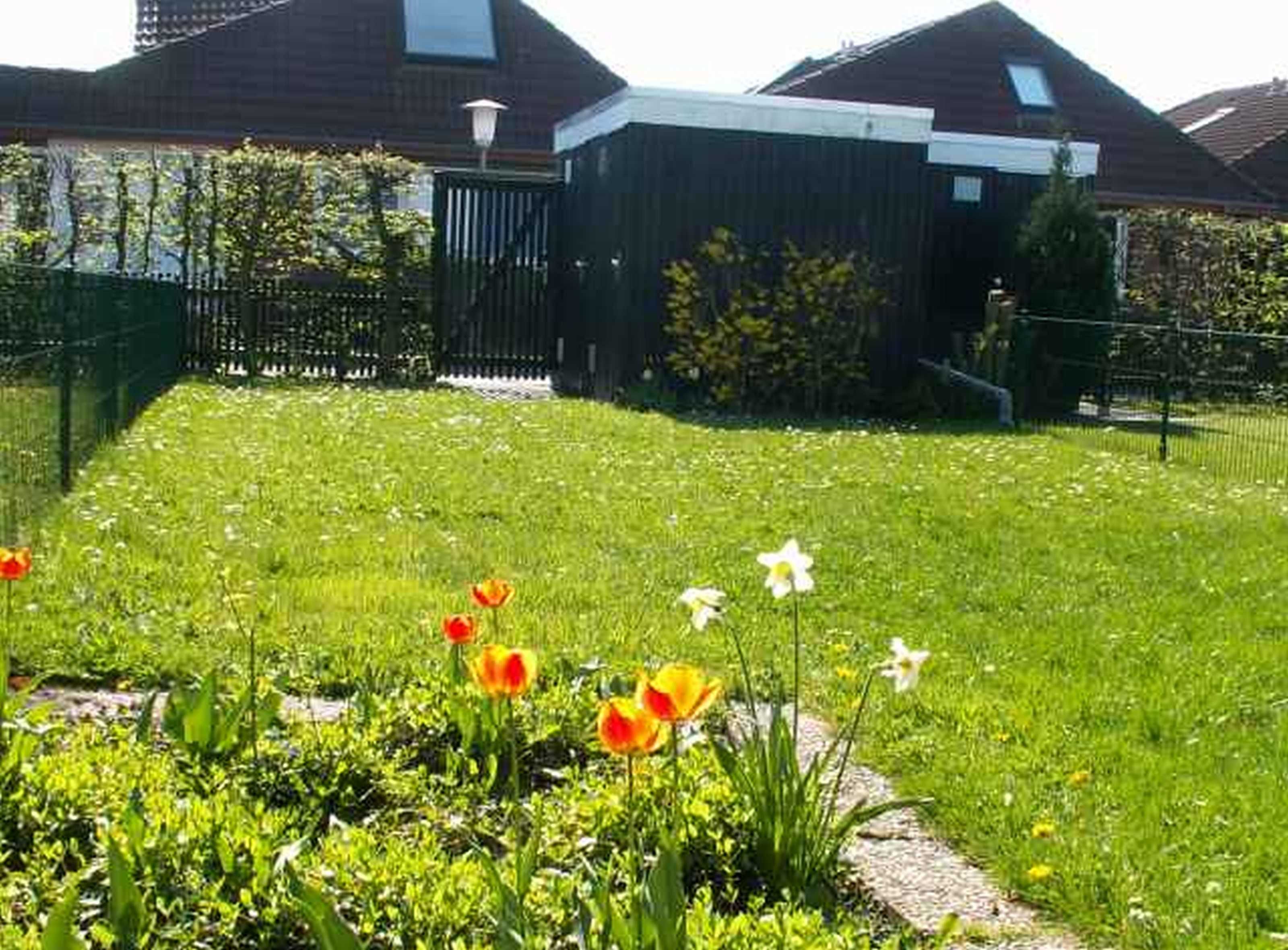 An den Wohnbereich grenzt die Südterrasse mit kleinem Garten, incl. Fahrradschuppen an.