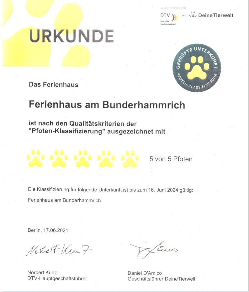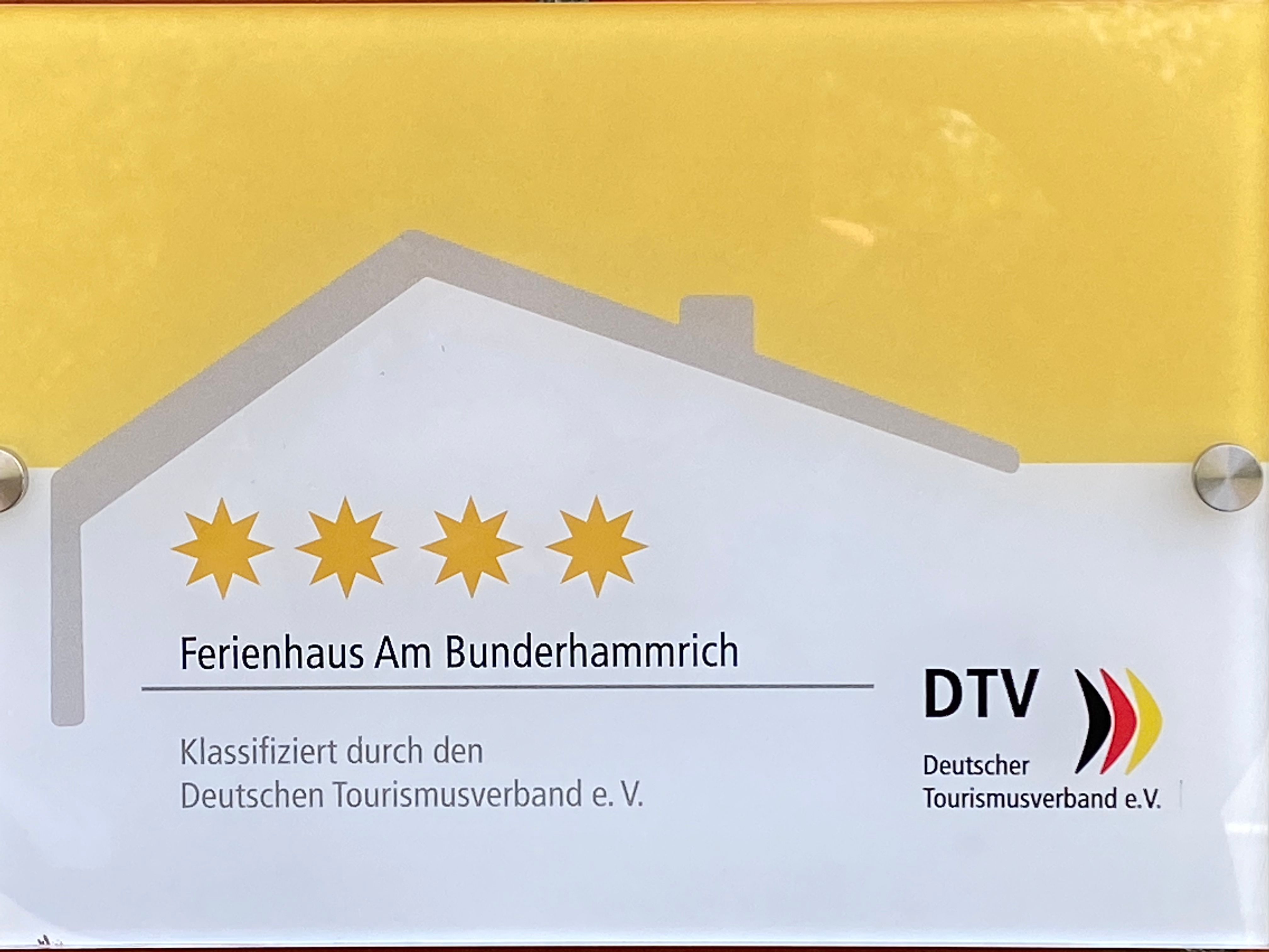 Herzlich Willkommen im Ferienhaus Am Bunderhammrich, mit einer eigenen Ladestation für E-Autos. Unser Ferienhaus wurde in 2024 vom Deutschen Tourismusverband DTV mit 4 Sternen (für max. 6 Personen) ausgezeichnet. In der Kategorie Urlaub mit Hund, wurden wir mit 5 von 5 Pfoten in der Pfoten-Klassifizierung ausgezeichnet. Letzte Renovierung in 2025.