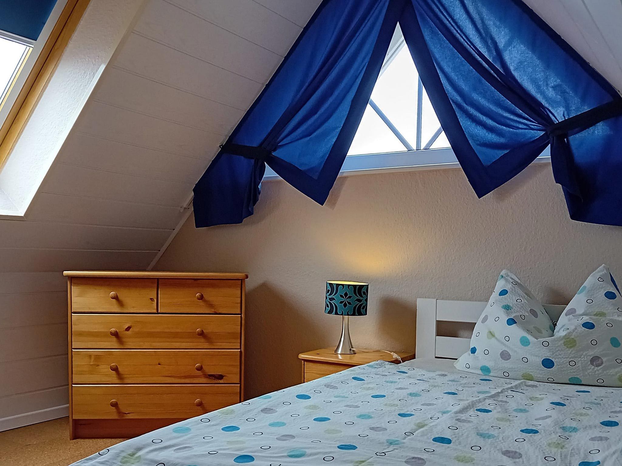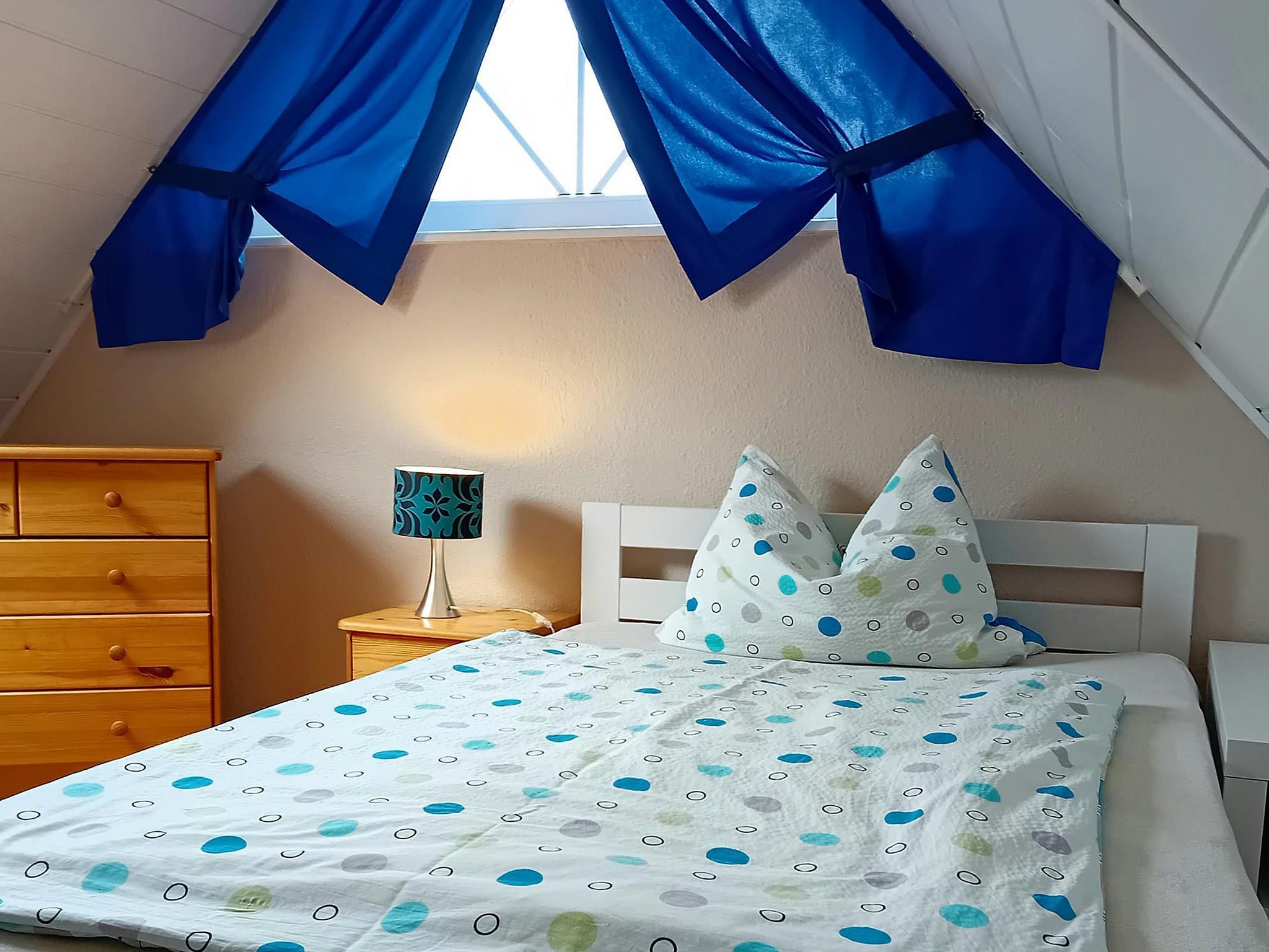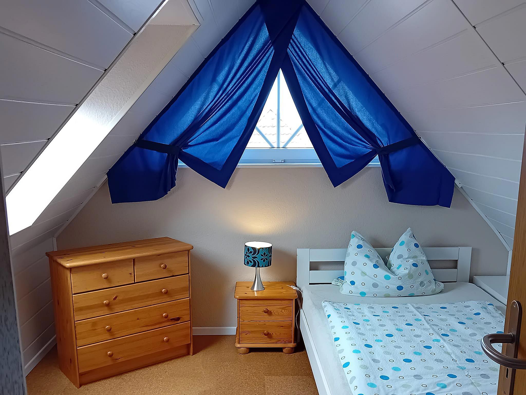 Gemütliche Ferienwohnung für 1 Person im Dachgeschoss. Wohnzimmer mit Sat-TV und kleiner Küchenzeile mit Essplatz. Ein kuscheliges Schlafzimmer mit großem Bett. Helles Duschbad mit Dachfenster und WC.